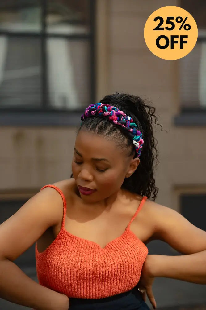 This isn’t just a headband, it’s a braided crown. Woven in deep navy, it wraps around the head like a halo of confidence. Bold, structured, and unapologetically regal.