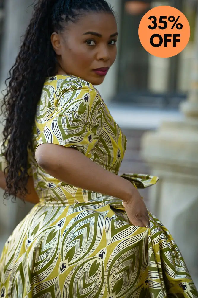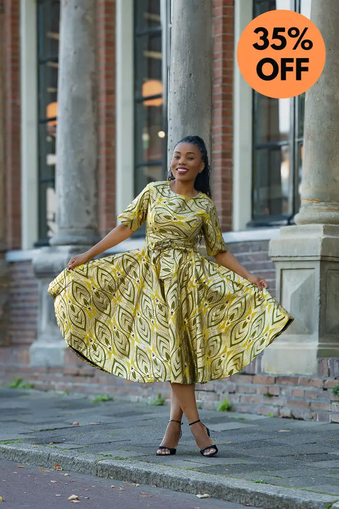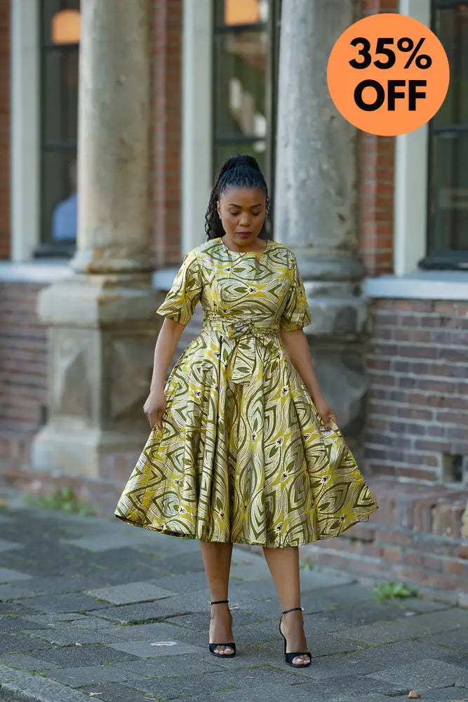 Embrace your femininity in this amazing flattering A-line Oluchi dress. The print is gold with stunning floral stands out from the crowd- because you aren't trying to hide wearing this gorgeous dress. It's comfortable and flattering for all body shapes. You'll definitely enjoy the deep side pockets to keep your phone and car keys. Dress up with peep-toe heels.