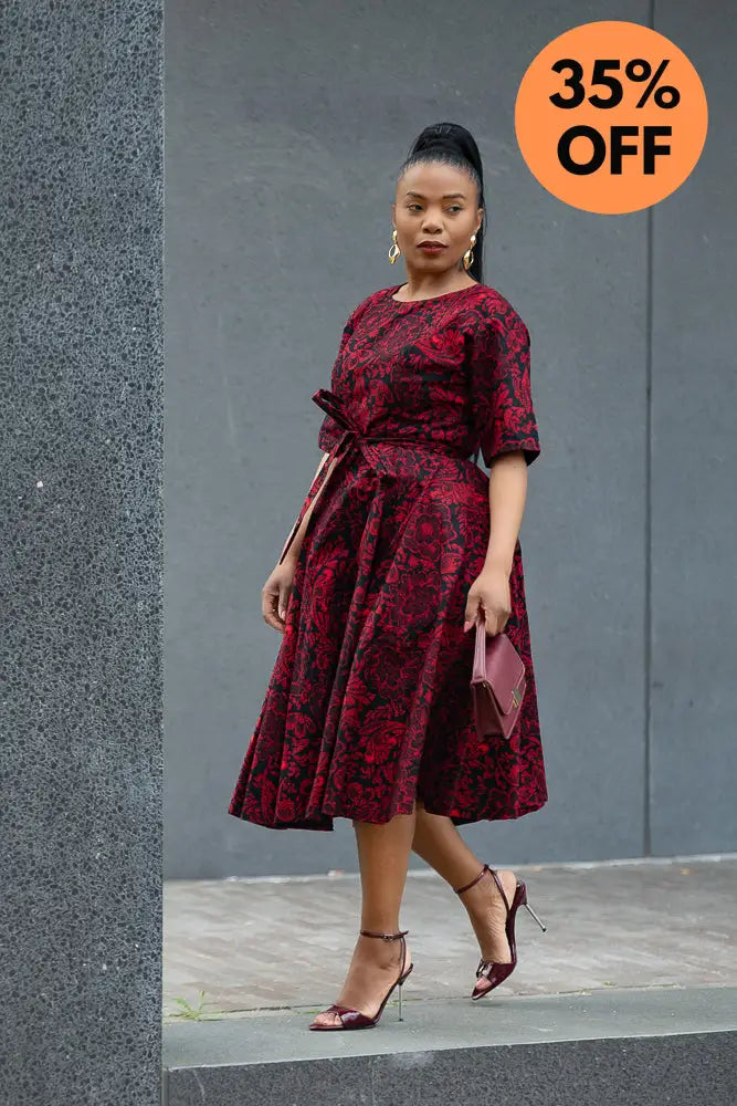 The print is a deep nourishing red with stunning floral blood red pattern made with velvety fabric that's striking- you aren't trying to hide wearing this gorgeous dress (even when you're trying to keep low-key). It's comfortable and flattering for all body shapes. You'll definitely enjoy the deep side pockets to keep your phone and car keys. Dress up with peep-toe heels.