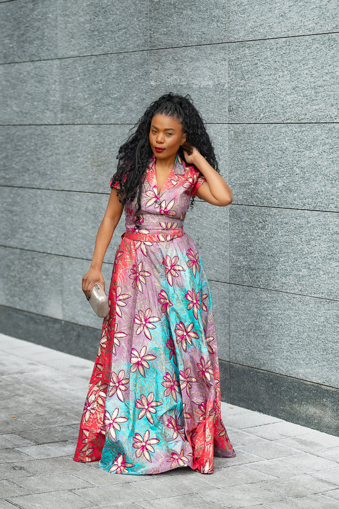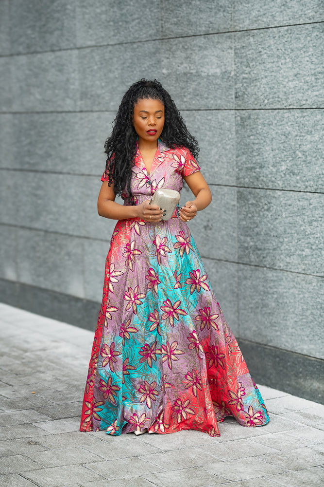 This dress is pure magic in motion! A dreamlike swirl of bold florals, shimmering hues, and a silhouette that moves like poetry with every step. The tailored bodice cinches beautifully at the waist, flowing into a dramatic maxi skirt that makes you feel like a queen gliding through her kingdom.