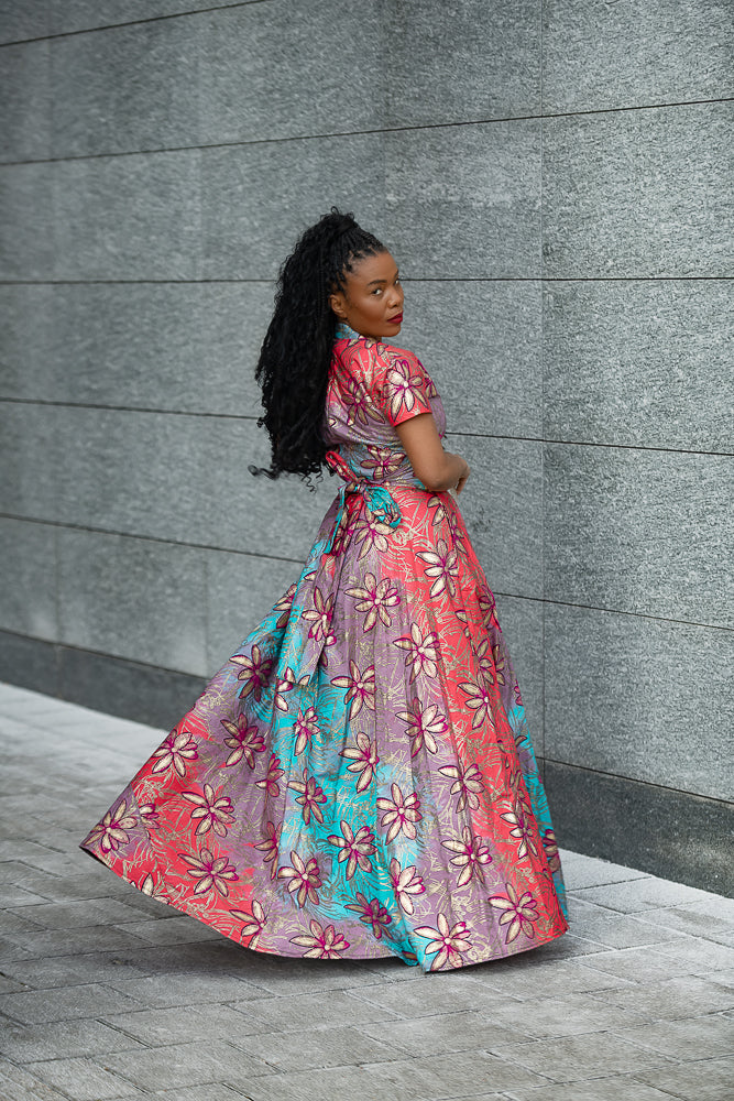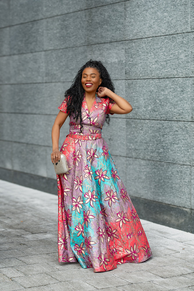 The vibrant blend of red, blue, and lilac, kissed with golden floral accents, gives off an effortless regal energy—whether you're twirling at a wedding, making an entrance at a soirée, or just feeling fabulous on a sunny day. And let’s not forget the pockets (yes, pockets!), because every goddess deserves both elegance and practicality.