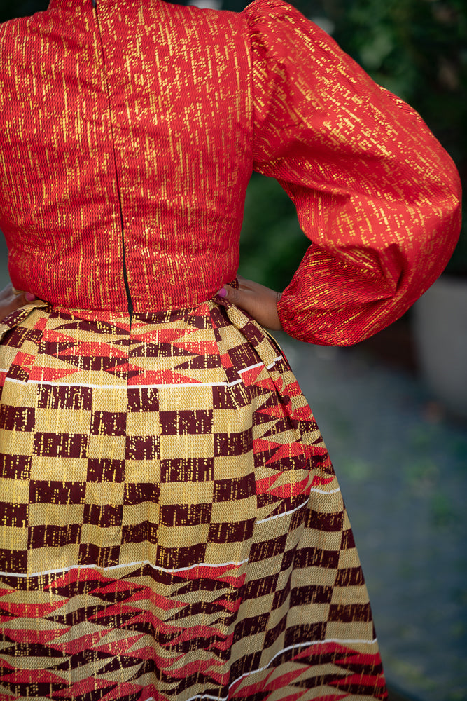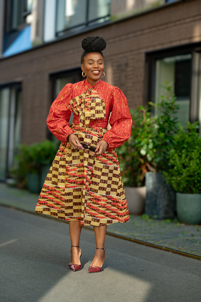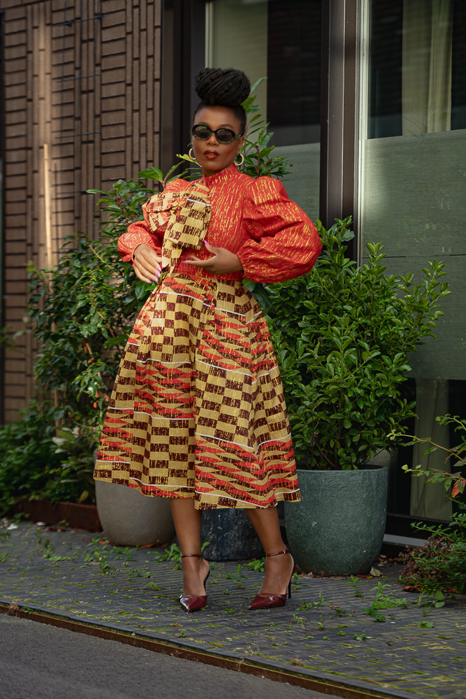 Big bold sleeves and an even bolder bow at the neck (yes, it’s giving power tie vibes). Girl, this dress is about to take you to a whole new level! We’re talking front-row seat when they start mentioning women who exude serious power. And with that rich mix of orange and brown, you’ll look nothing short of golden. So, please—don’t hold back when you rock this with your kick-ass heels. We’ll be on the sidelines, cheering you on every step of the way!