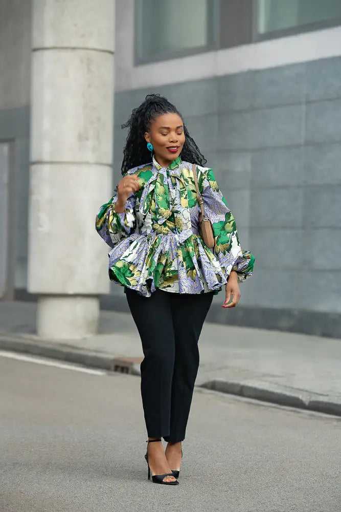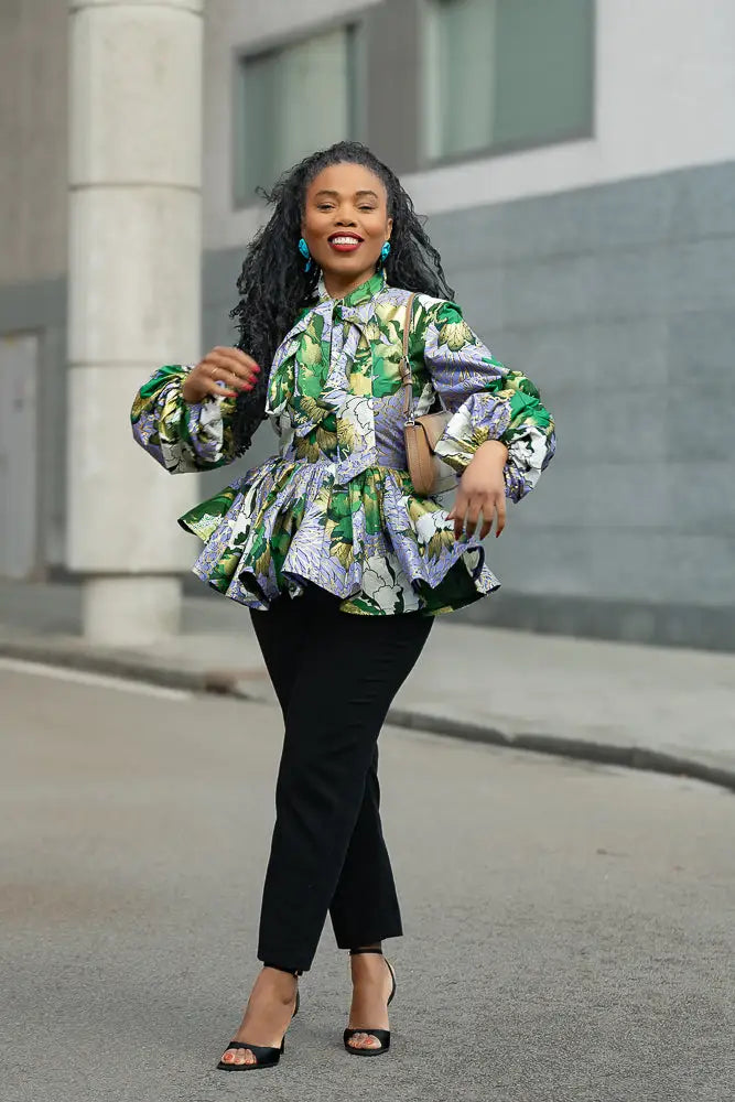 Our Rhonda top is lightweight and features a sash around the neck. It is a puffy long sleeve with a ruffled bottom. You can literally take this look from the office to a late dinner. The print is outstanding and the vibrant gold and green make a statement.