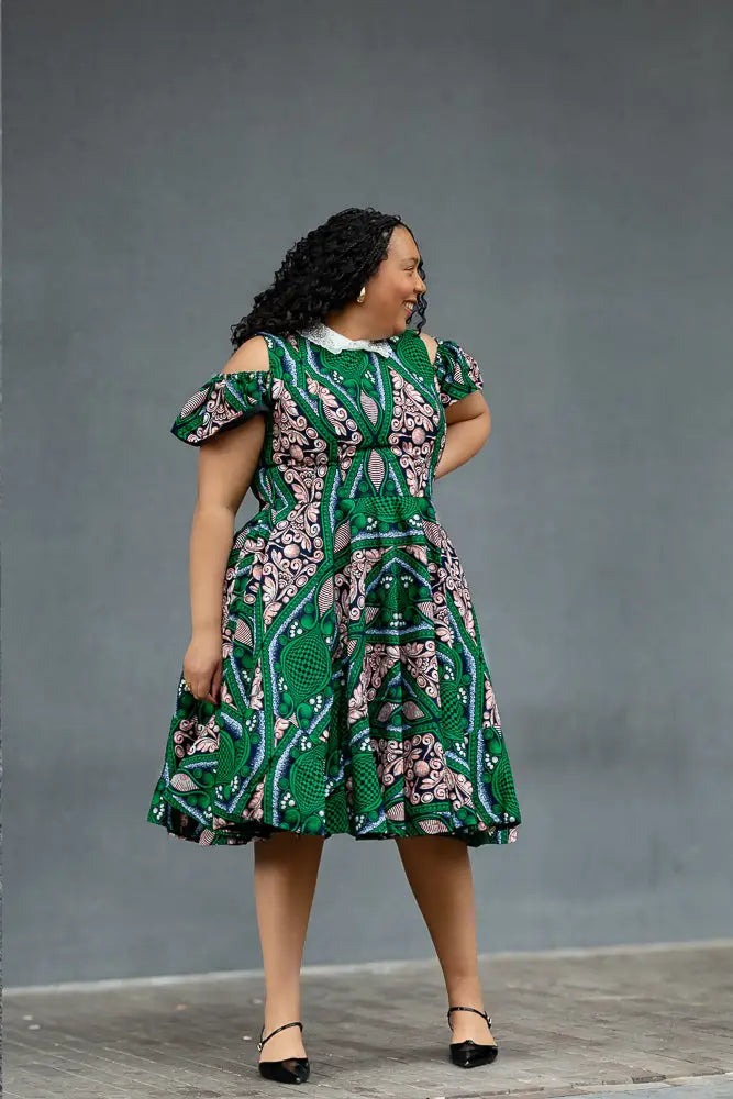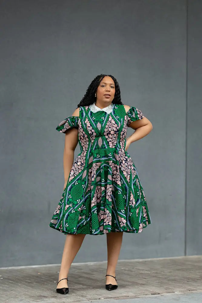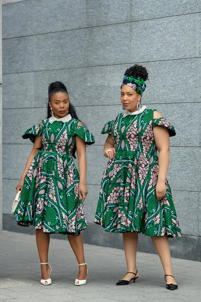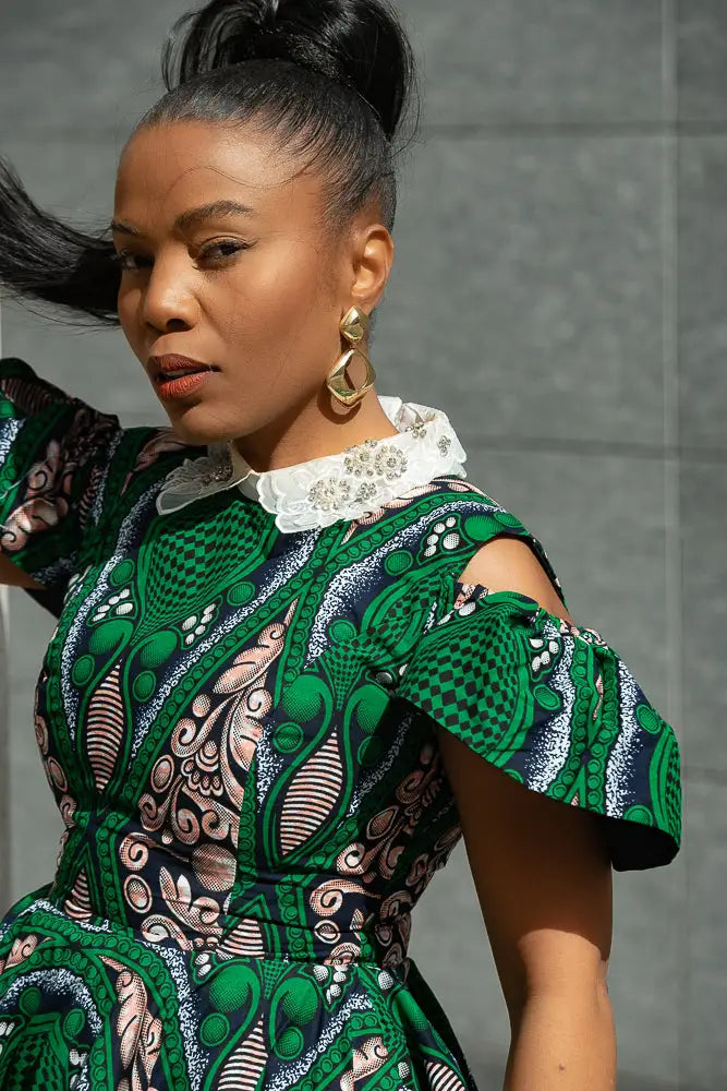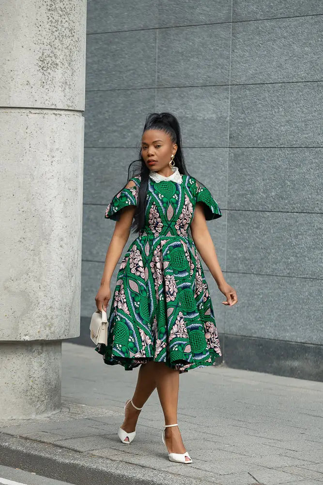 Make room in your wardrobe for this showstopper. This fit-and-flare Ankara dress features bold green and pink print magic, with sweet shoulder cut-outs and a crisp white lace collar that adds just the right touch of vintage charm. It’s playful, powerful, and effortlessly pretty—with a twirl-friendly skirt that was made to move. Brunch date? Wedding guest? This dress is your “I’ve arrived” moment.