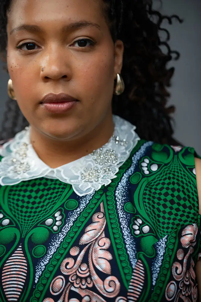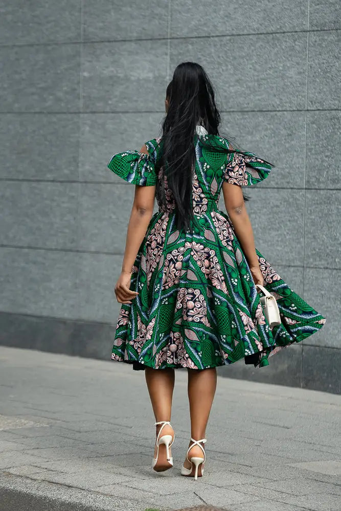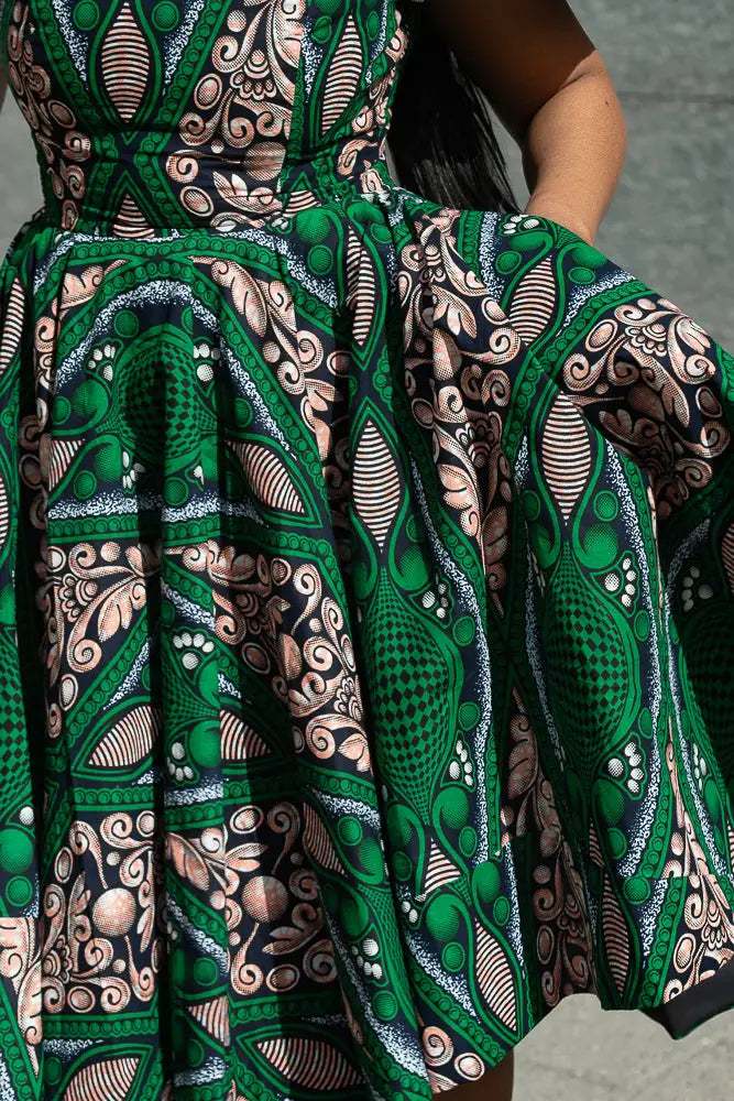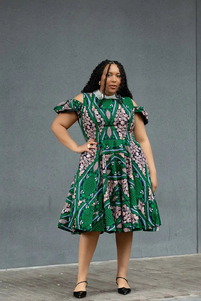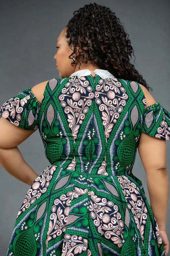 Make room in your wardrobe for this showstopper. This fit-and-flare Ankara dress features bold green and pink print magic, with sweet shoulder cut-outs and a crisp white lace collar that adds just the right touch of vintage charm. It’s playful, powerful, and effortlessly pretty—with a twirl-friendly skirt that was made to move. Brunch date? Wedding guest? This dress is your “I’ve arrived” moment.