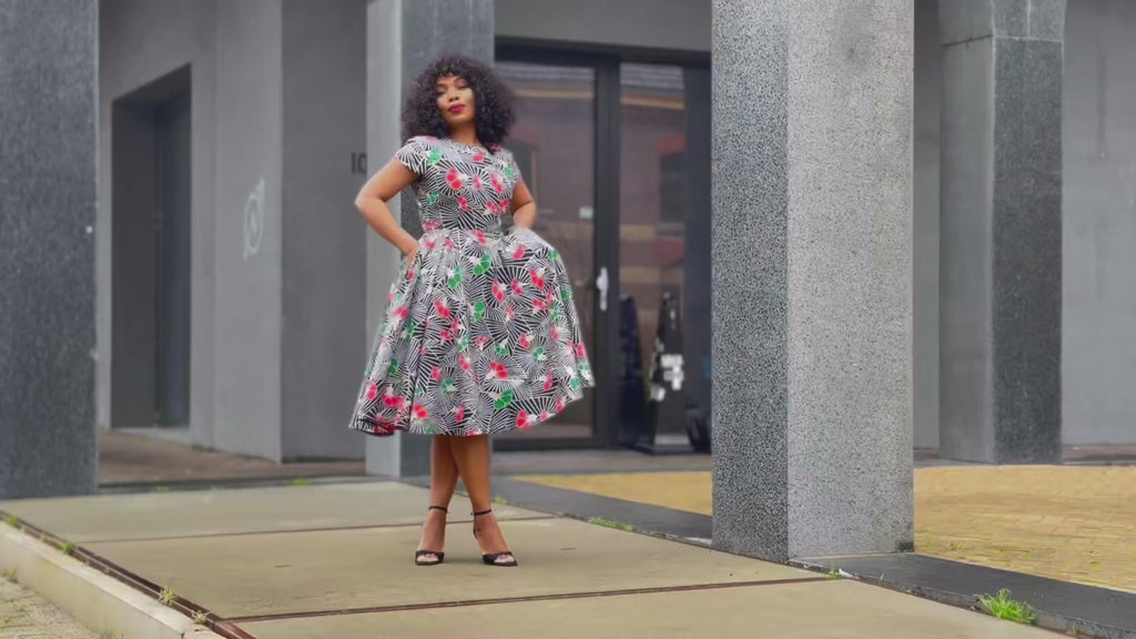 Embrace your femininity in this amazing flattering flared Tendai dress. The print is bold with stunning colours which stand out from the crowd- because you aren't trying to hide wearing this gorgeous dress. It's comfortable and flattering for all body shapes. You'll definitely enjoy the deep side pockets to keep your phone and car keys. Dress up with peep-toe heels or throw in some sneakers for that retro look.