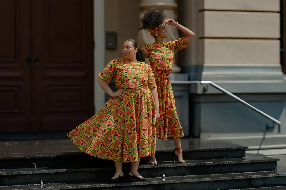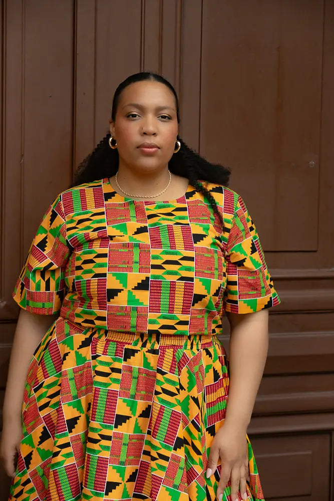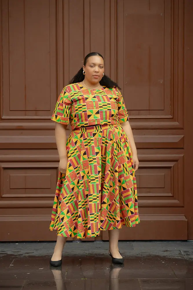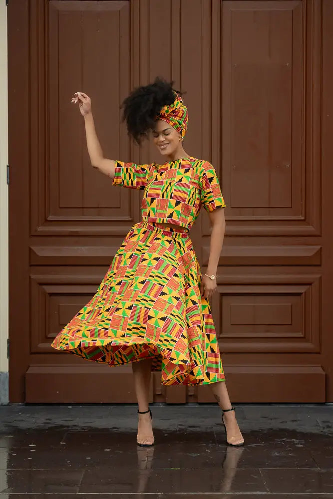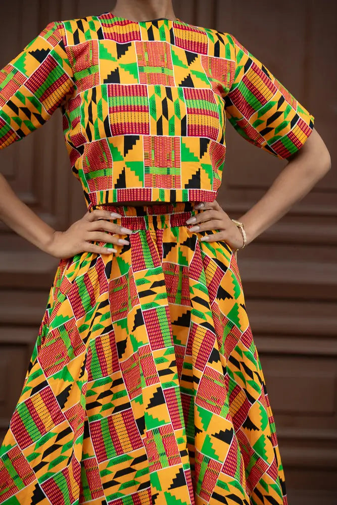 Queens don't just walk in, they show off! This Two-piece set skirt and cropped top with matching detailing will give you that x-factor! It is a bright and beautiful fabric which is fit for any occasion.
