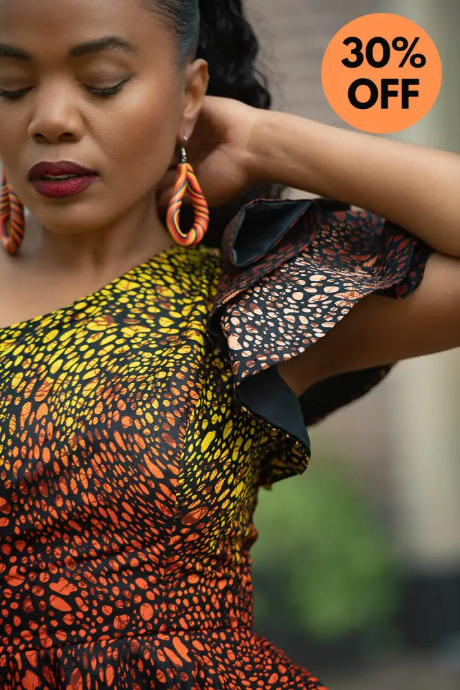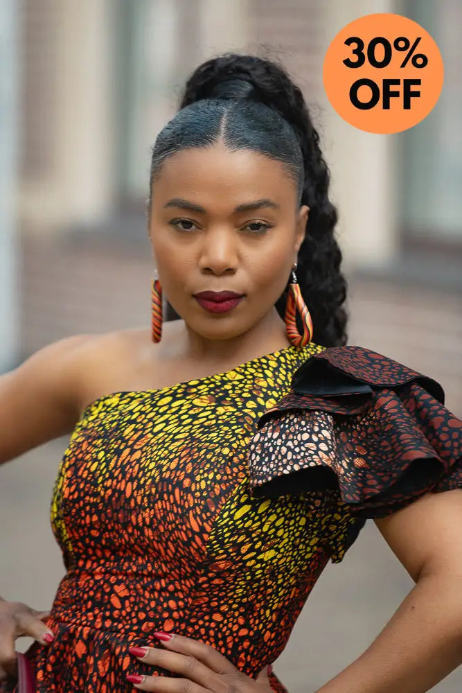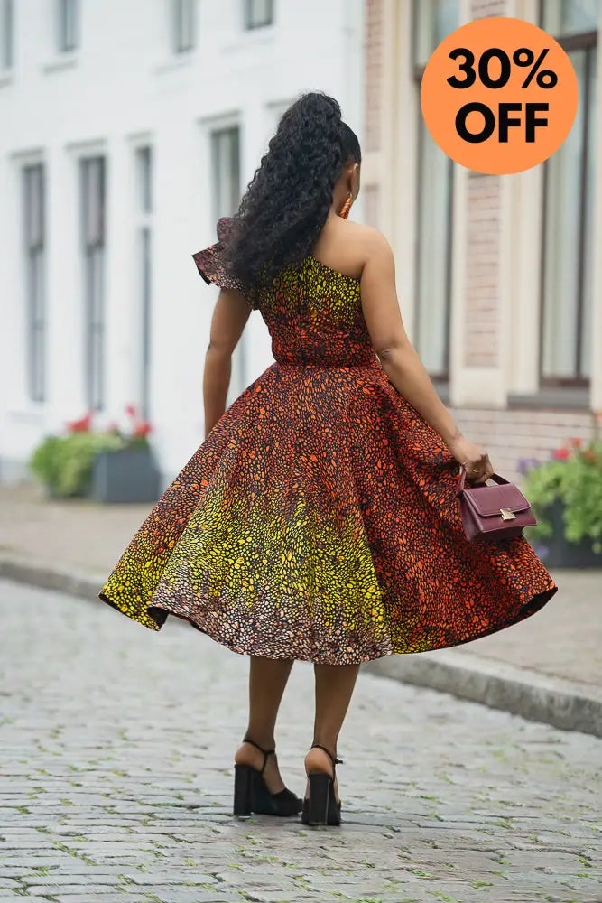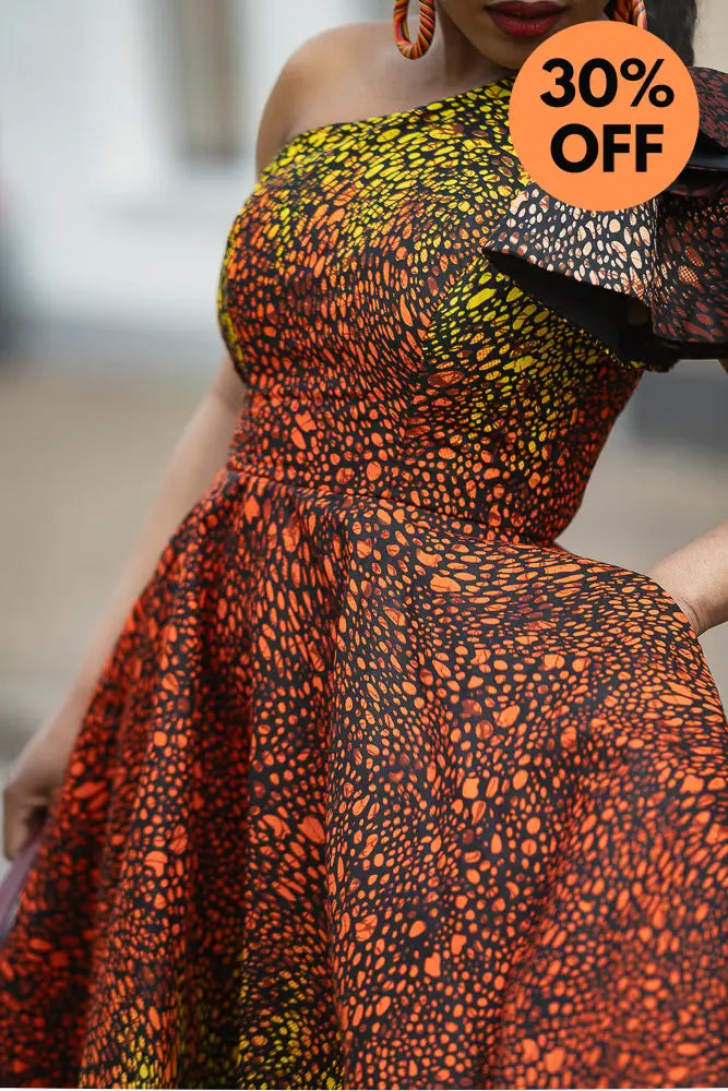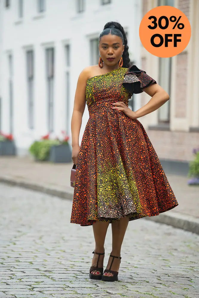 Flaunting a flowing 100% cotton construction, this midi-length dress weds our affinity for colorful and contemporary detailing with a zest of asymmetry. Draping across one shoulder, the unique pleated top presents a graceful look that delights both queen and audience.