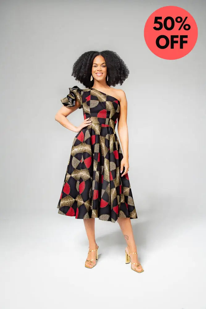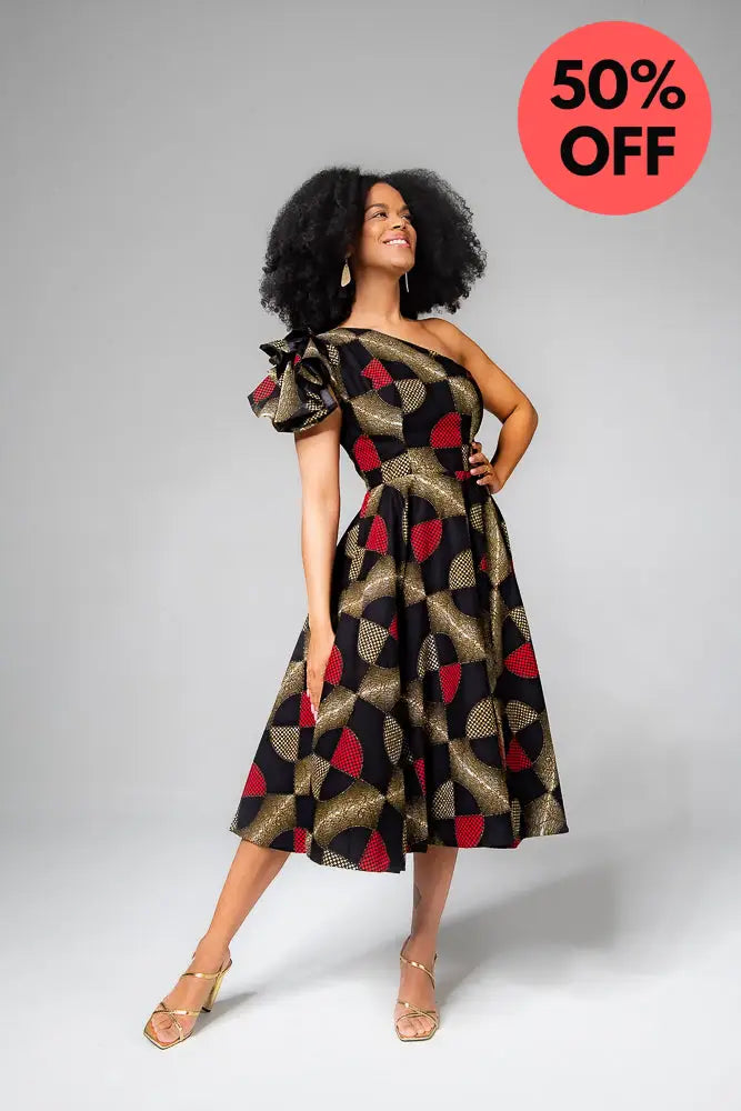 Flaunting a flowing 100% cotton construction, this midi-length dress weds our affinity for colorful and contemporary detailing with a zest of asymmetry. Draping across one shoulder, the unique pleated top presents a graceful look that delights both queen and audience.