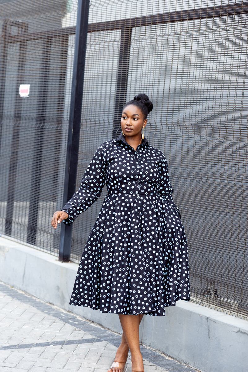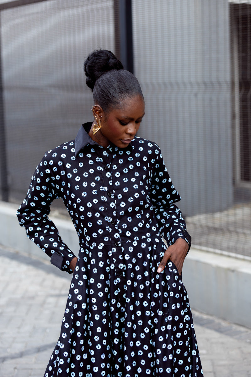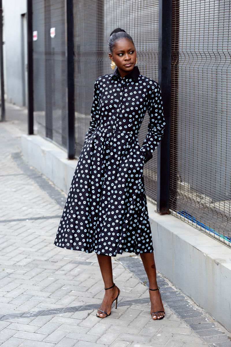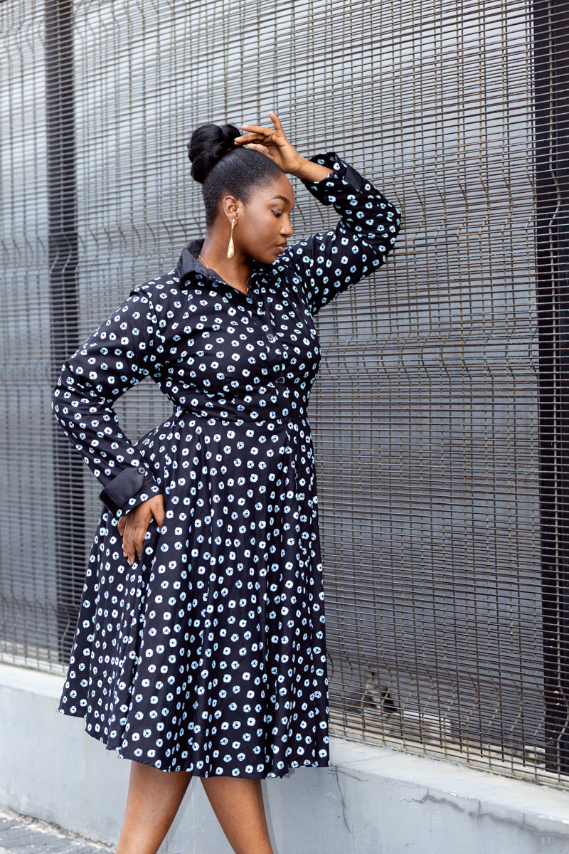 This is that dress you keep by the door because it never lets you down. Crisp black with a soft white print, a flattering fitted waist, and a full skirt that moves when you do. The Gabrielle dress is easy, elegant, and always pulled together. Button it up for work, loosen it for dinner, and let it carry you through the day with confidence.