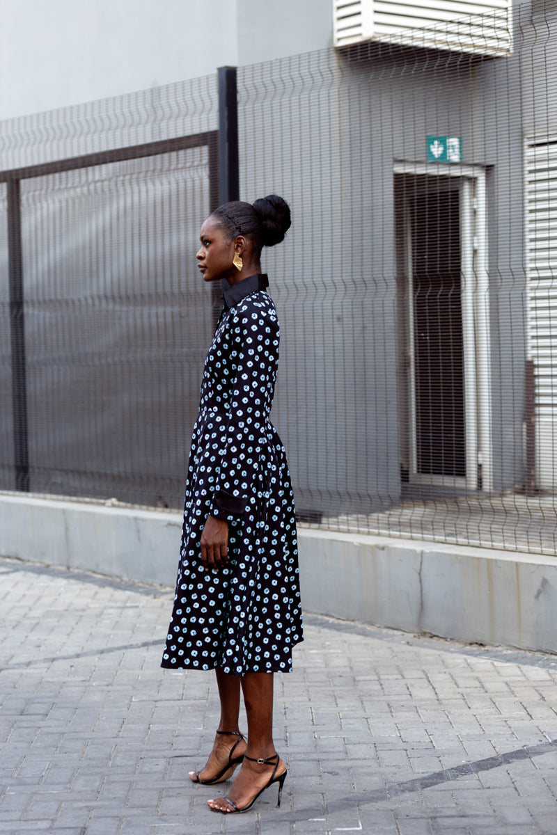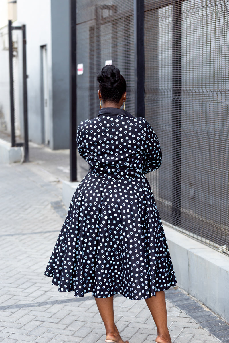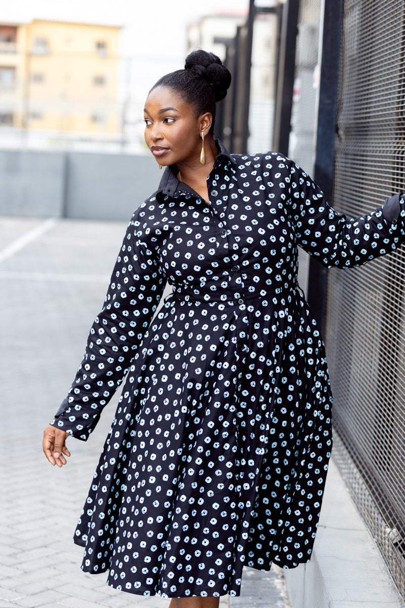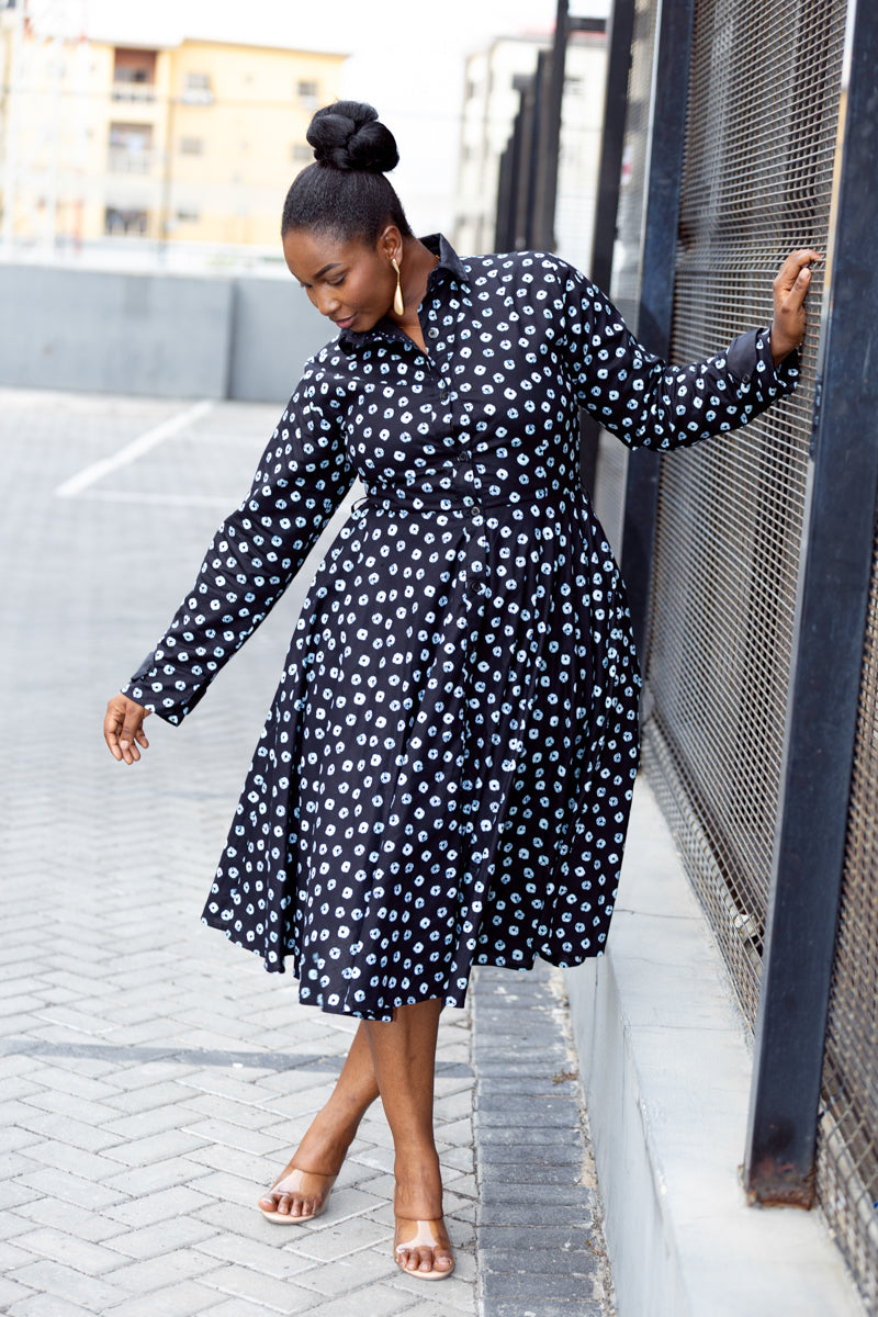 This is that dress you keep by the door because it never lets you down. Crisp black with a soft white print, a flattering fitted waist, and a full skirt that moves when you do. The Gabrielle dress is easy, elegant, and always pulled together. Button it up for work, loosen it for dinner, and let it carry you through the day with confidence.