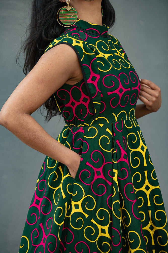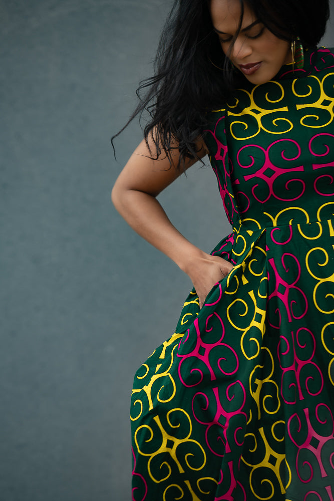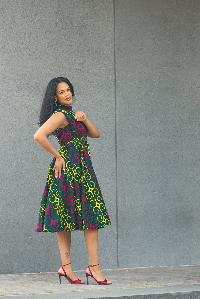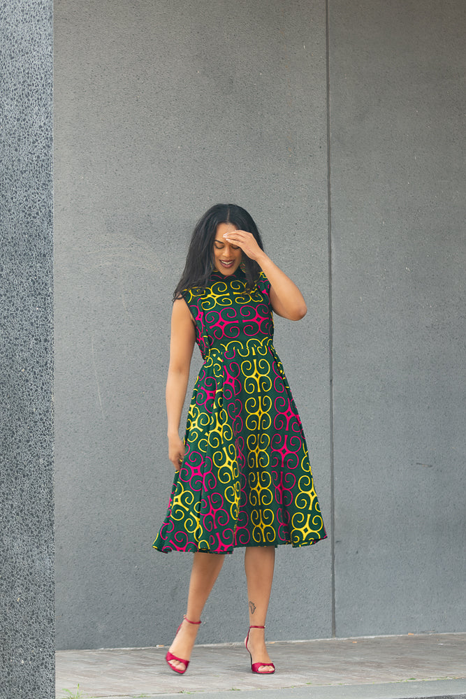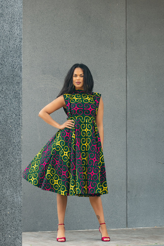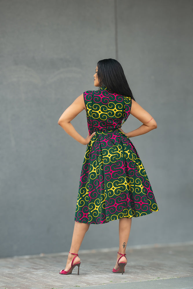 Ready to stand out in style? New to the Summer collection. The  Ankara print adds an electrifying touch, symbolising passion and energy. This sleeveless design reveals your shoulders and arms with elegance, while the midi length provides a chic and fashionable look.