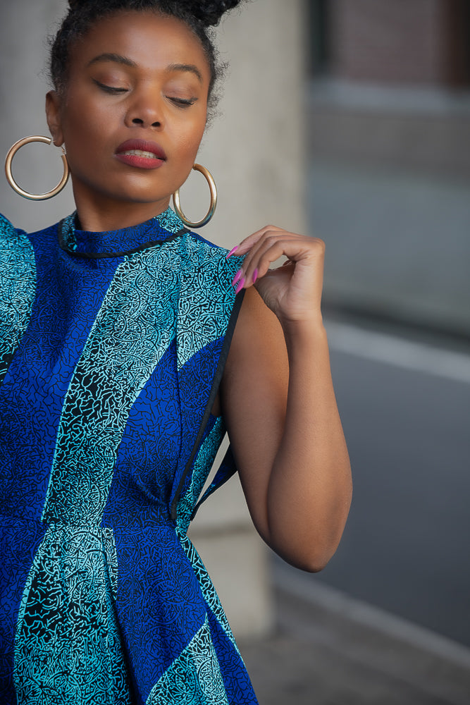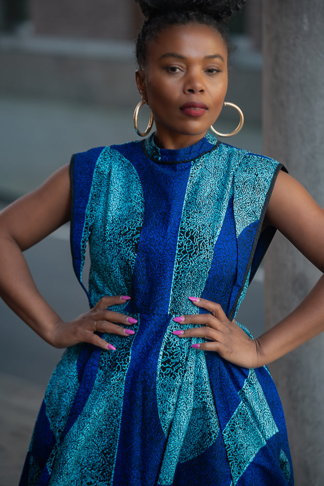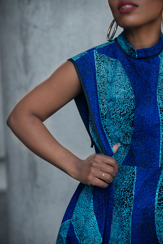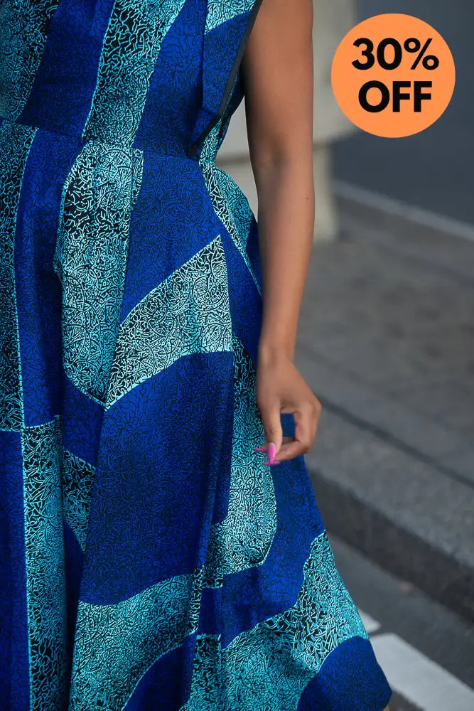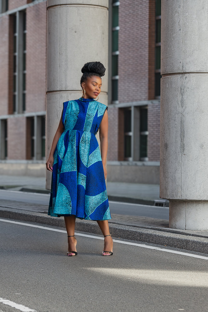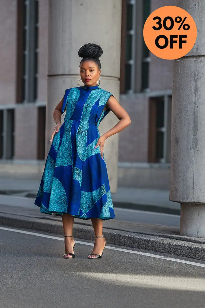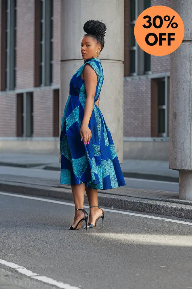 Ready to stand out in style? New to the AW collection. The Ankara print adds an electrifying touch, symbolising passion and energy. This sleeveless design reveals your shoulders and arms with elegance, while the midi length provides a chic and fashionable look.