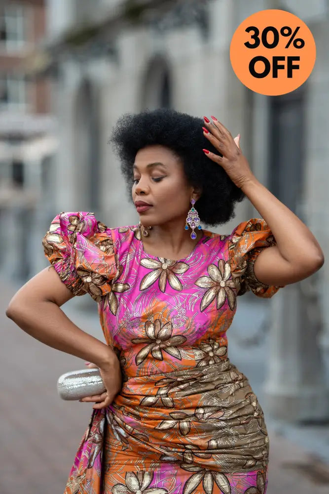 This dress said “go big or go back to basics.” And you? You chose glamour. The puff sleeves deserve their own postcode. The metallic florals catch the light and compliments. And that ruched waist? Chef’s kiss. It hugs you like a proud mom at graduation.