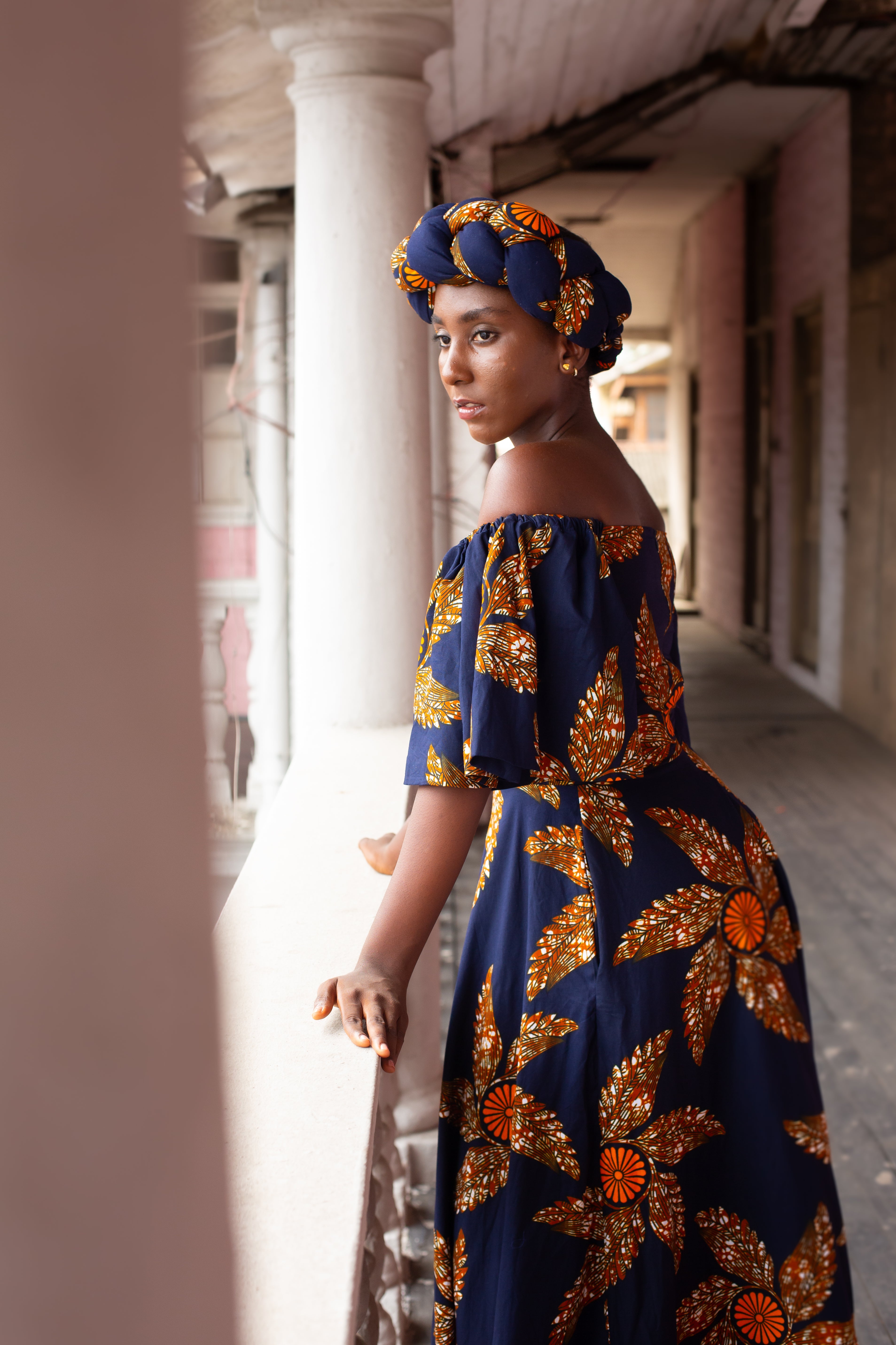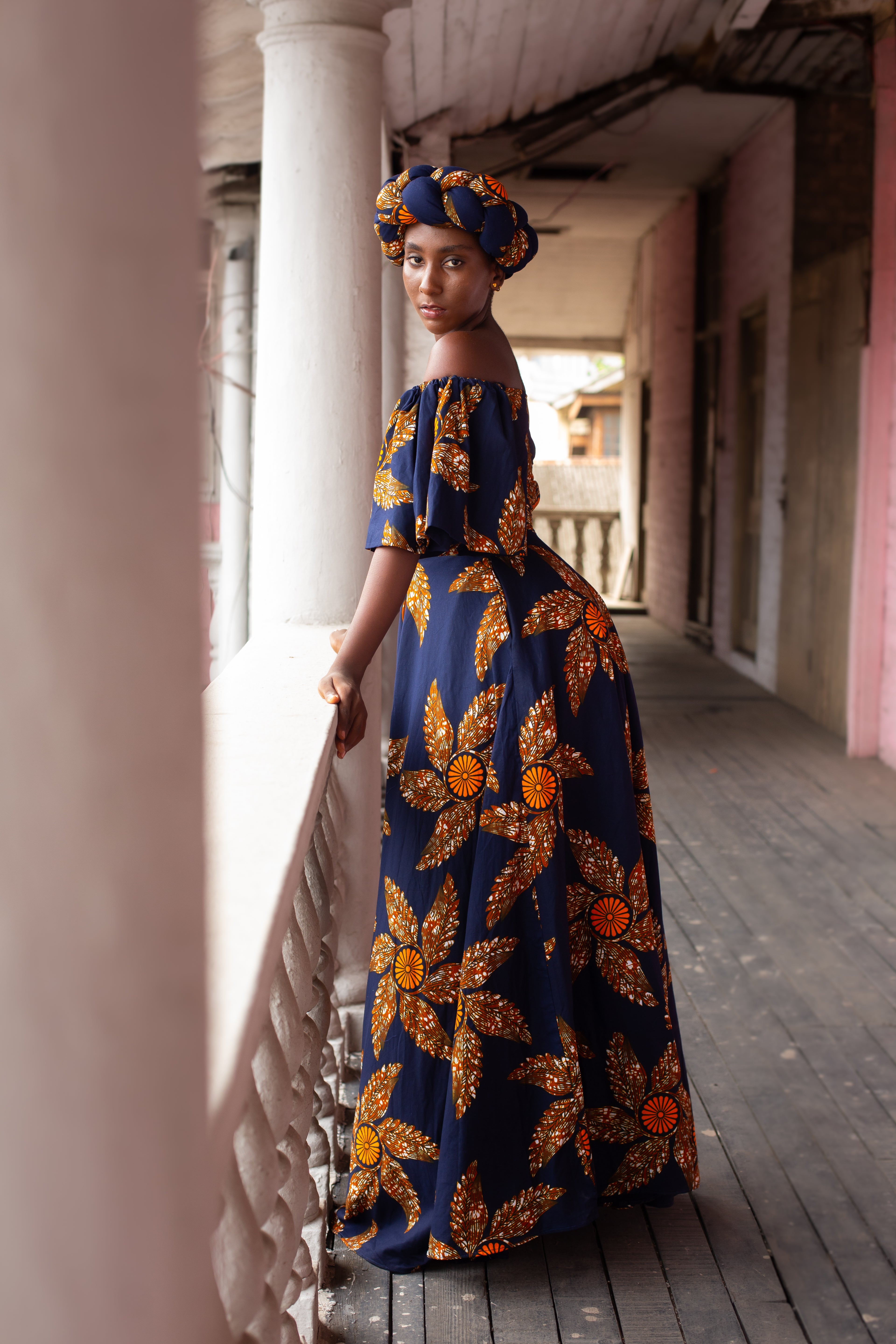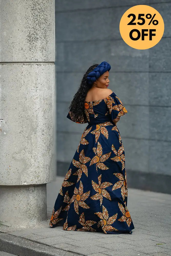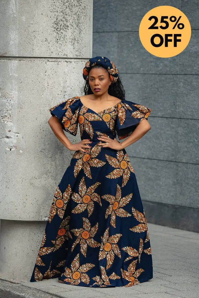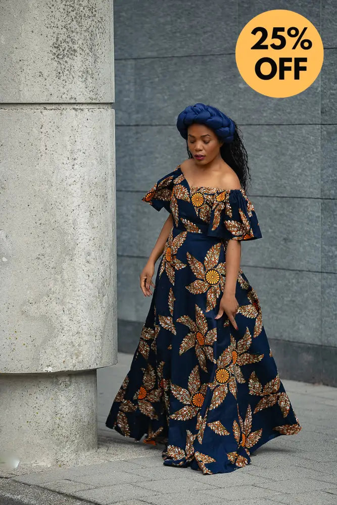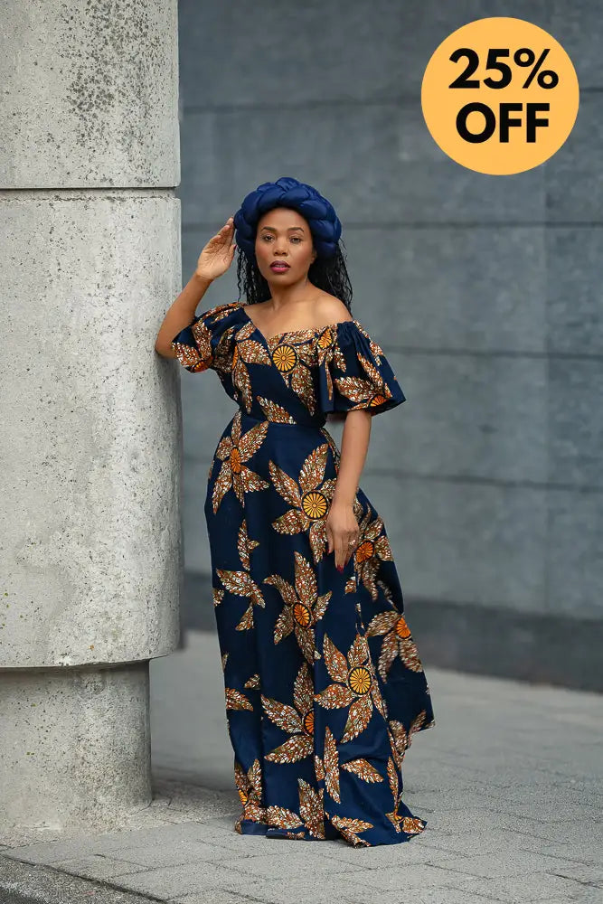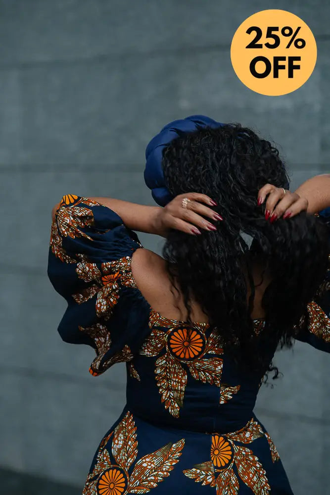 The Omolola Dress was made for that exact feeling. Wrapped in rich navy and bold orange and brown hues, this off-shoulder beauty flows like a soft whisper against sun-kissed skin. The dramatic puff sleeves, cinched waist, and sweeping hemline give you that effortless “This is paradise” look.