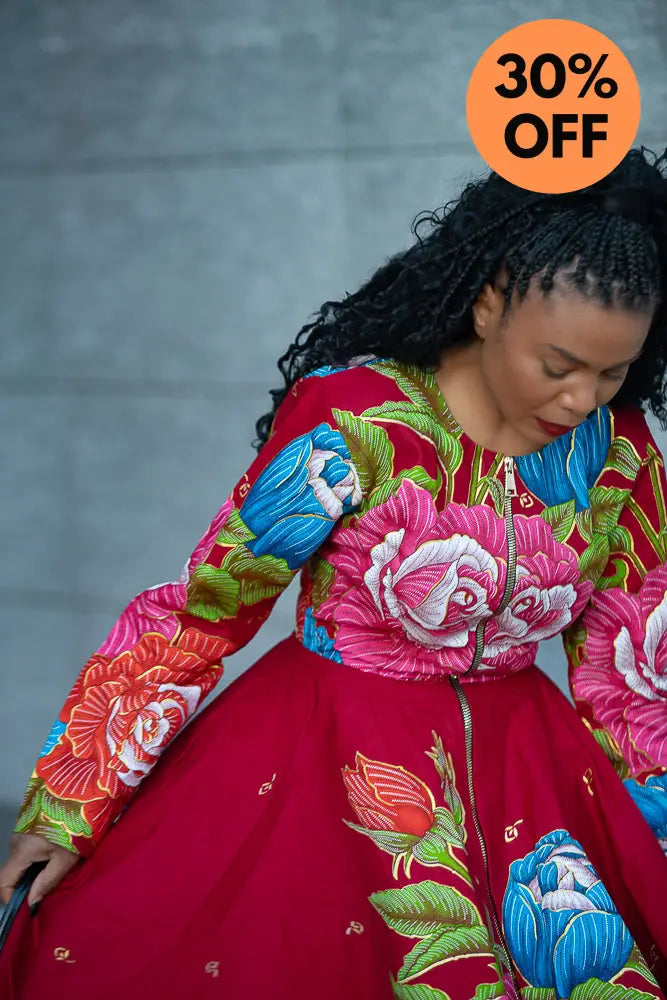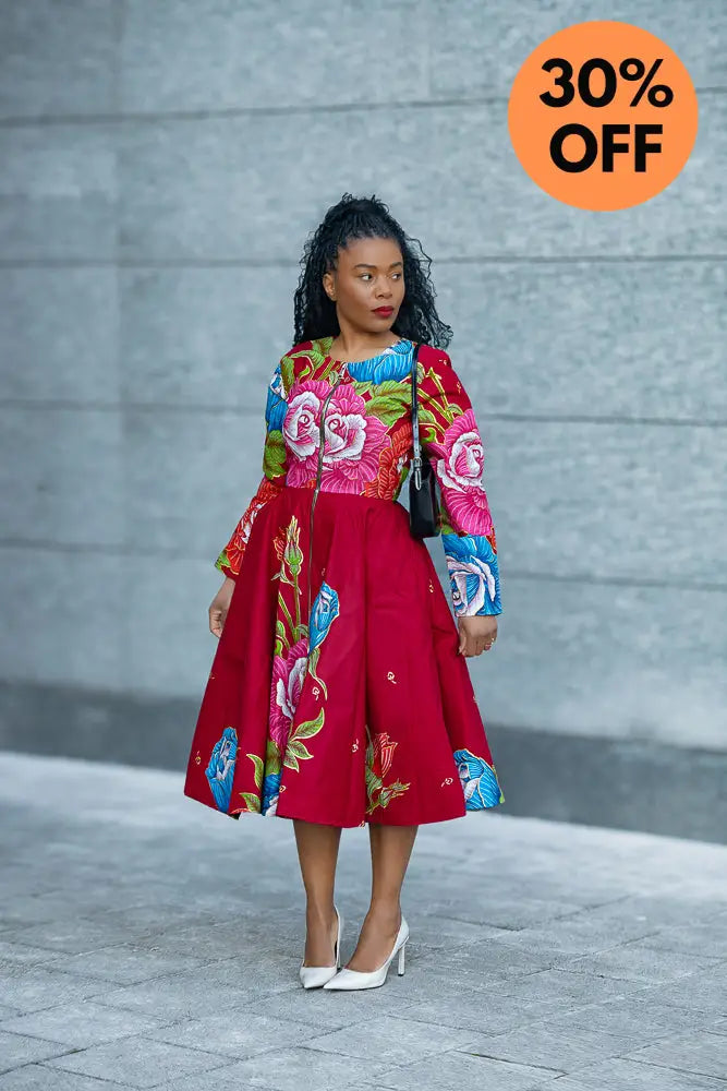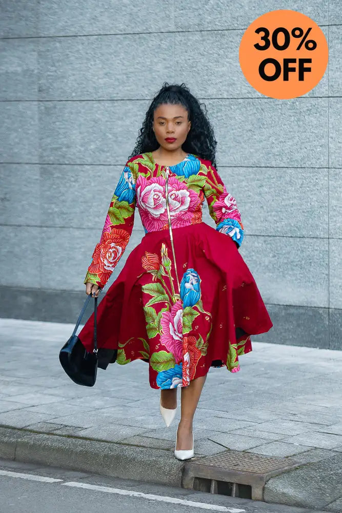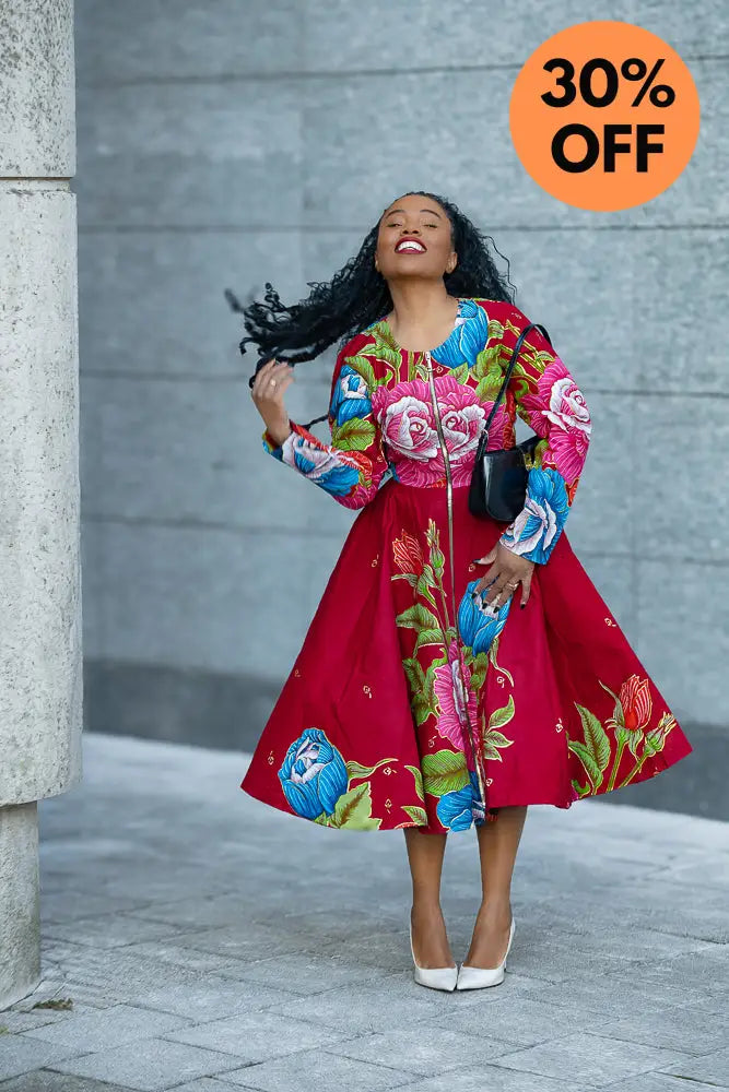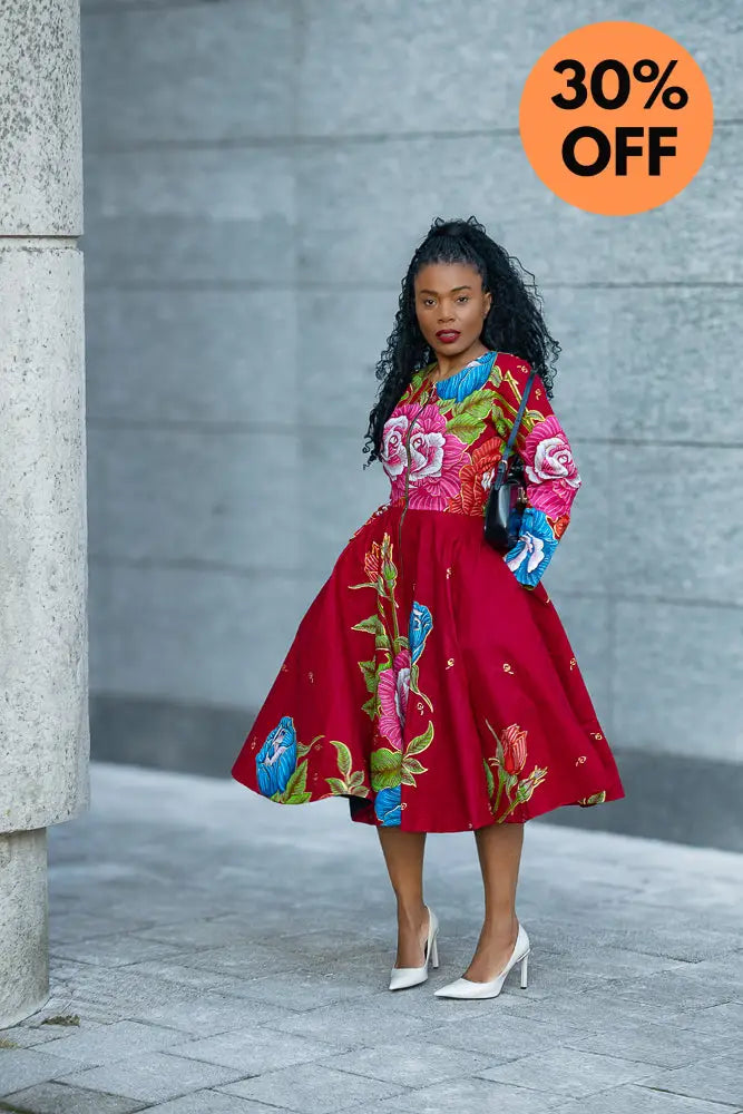This stunning bold floral midi dress, Shani is perfect for all types of occasions. This dress features a full-length zip that goes all the way down, allowing you to adjust the dress to your liking. You can create a V-neckline, making it perfect for accessorising with a statement necklace or a soft silk scarf. The long sleeves add an extra touch of elegance, while the black and white big flowers create a timeless and sophisticated look.