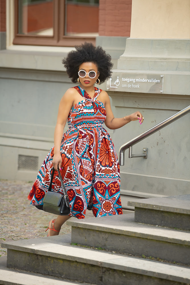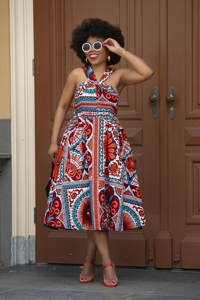 The cross-neck detail that stays in place is just one of the best features of this dress. But let's not stop there—let's talk about the gorgeous mix of prints. It's bright, unique, and totally matches your personality. The Efua midi dress is perfect for events under a beautiful sunset with a matching drink in hand. If you're not good at small talk, don't worry—no one will be talking about the weather. The conversation will start with, "Wow, you look amazing in that dress!"