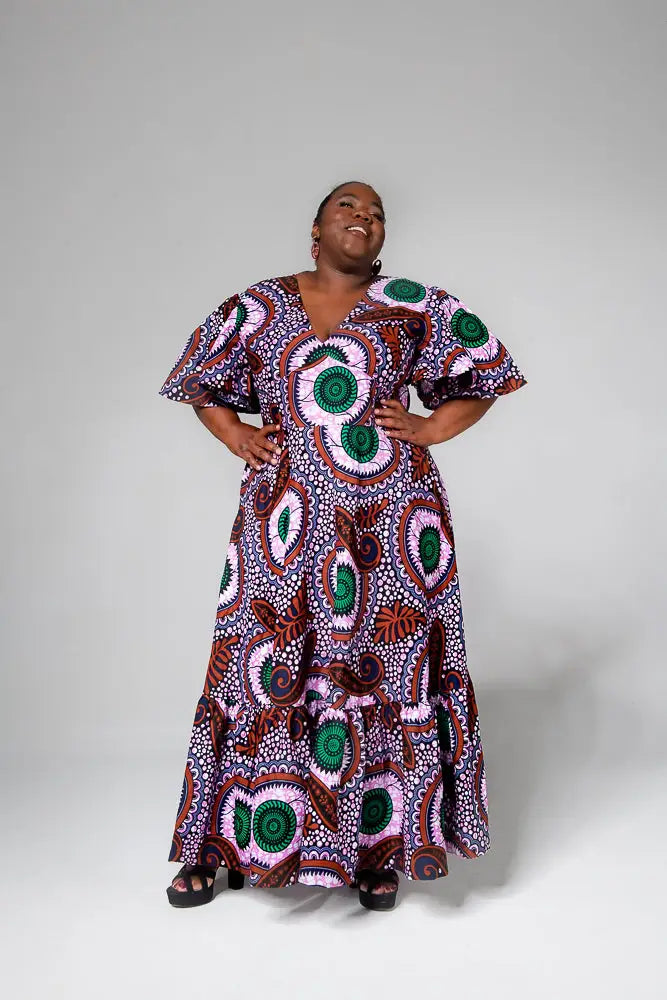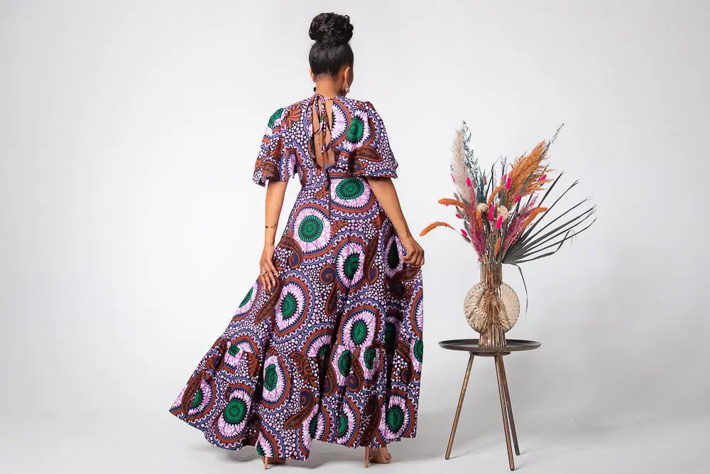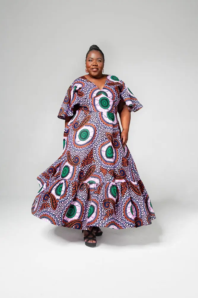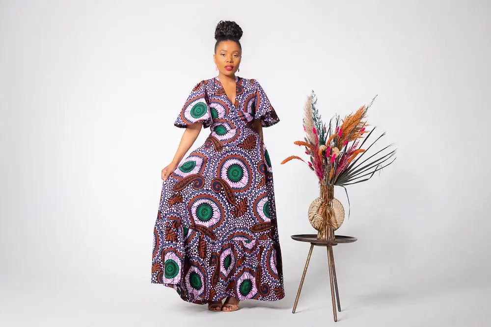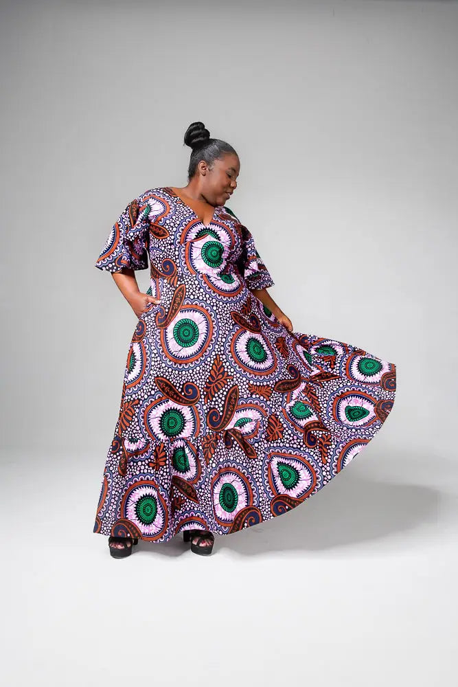 Make a statement with this all-over patterned maxi dress. Featuring a v-neckline with short puff sleeves. Pair it up with some lace up sneakers or heels for the complete look.