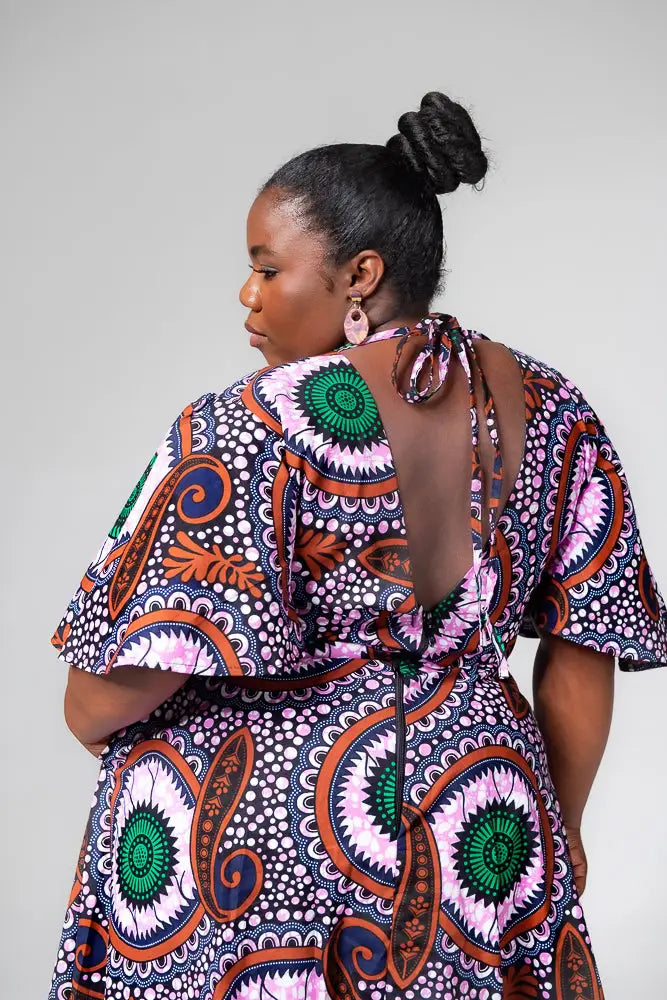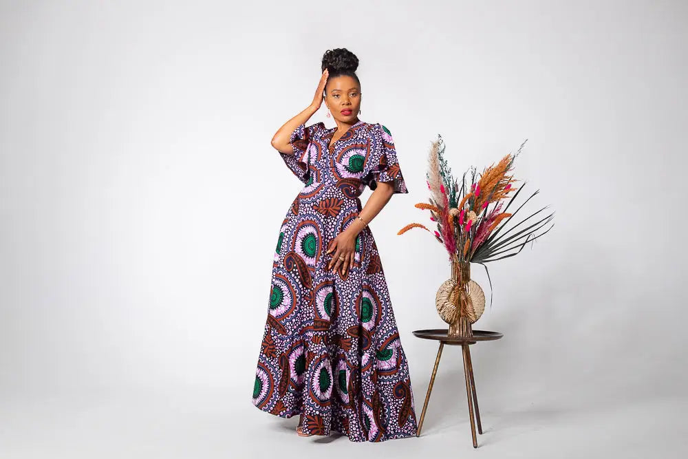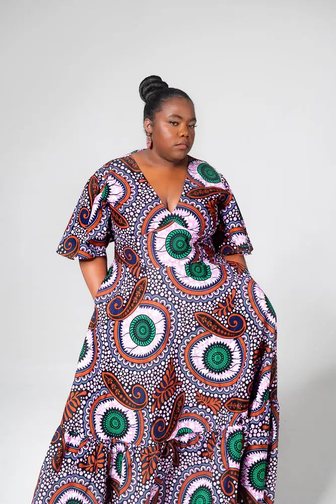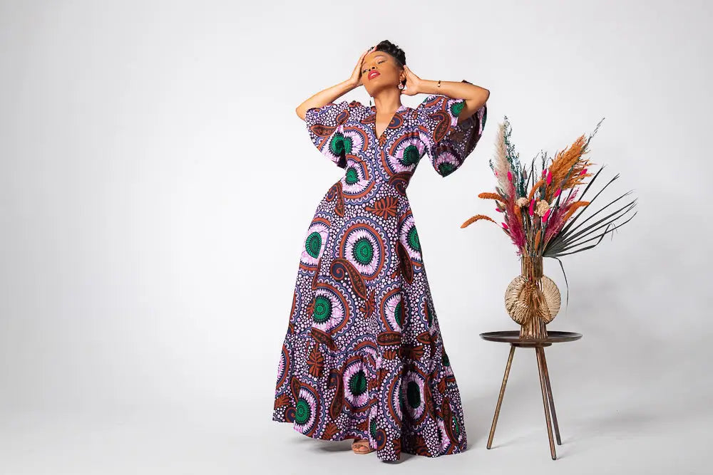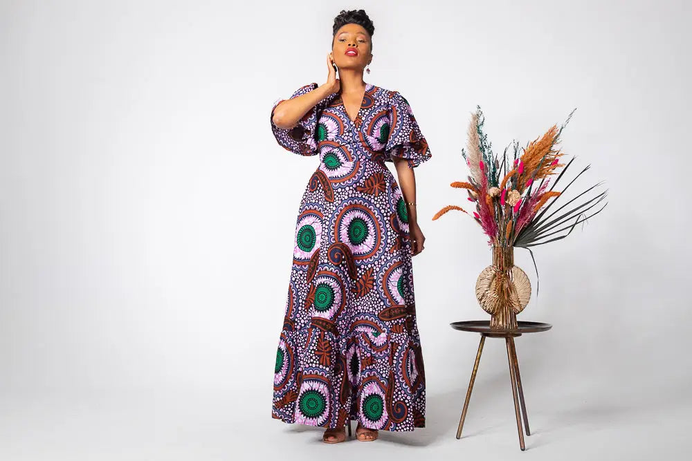 Make a statement with this all-over patterned maxi dress. Featuring a v-neckline with short puff sleeves. Pair it up with some lace up sneakers or heels for the complete look.