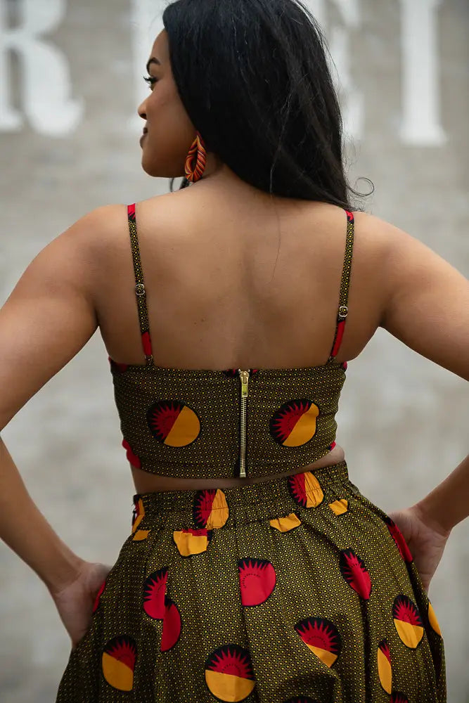 This set is pure joy in fabric form. A flattering crop top with slim straps, paired with a full, dramatic skirt that moves like a dream. The bright pops of red and yellow? They’re doing exactly what they came to do, stand out. Wear it to brunch, wear it to a party, wear it because you feel good. You deserve to wear colour like it’s your birthright.