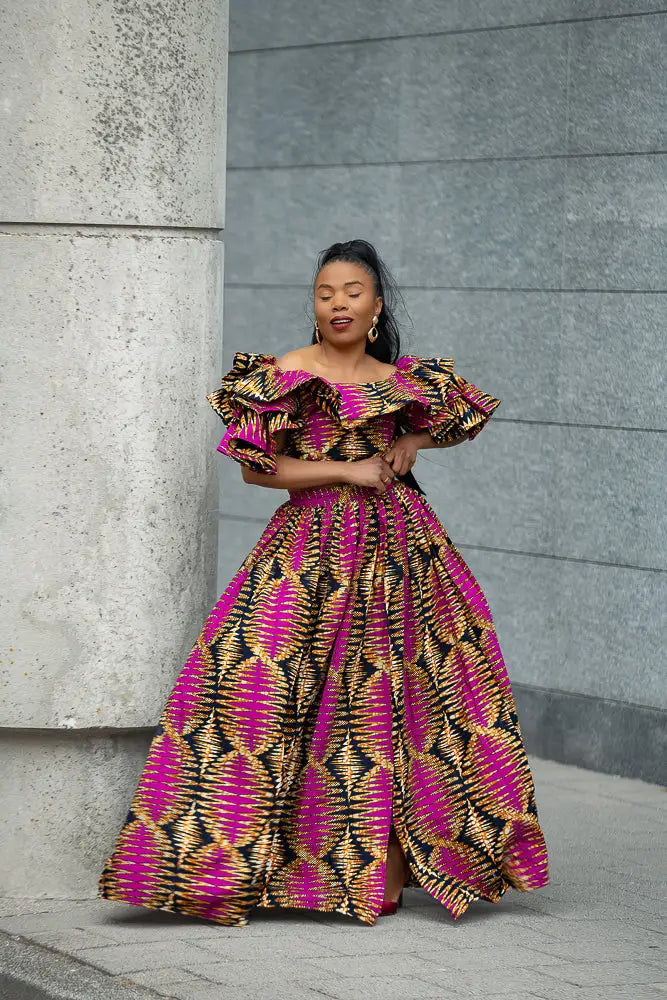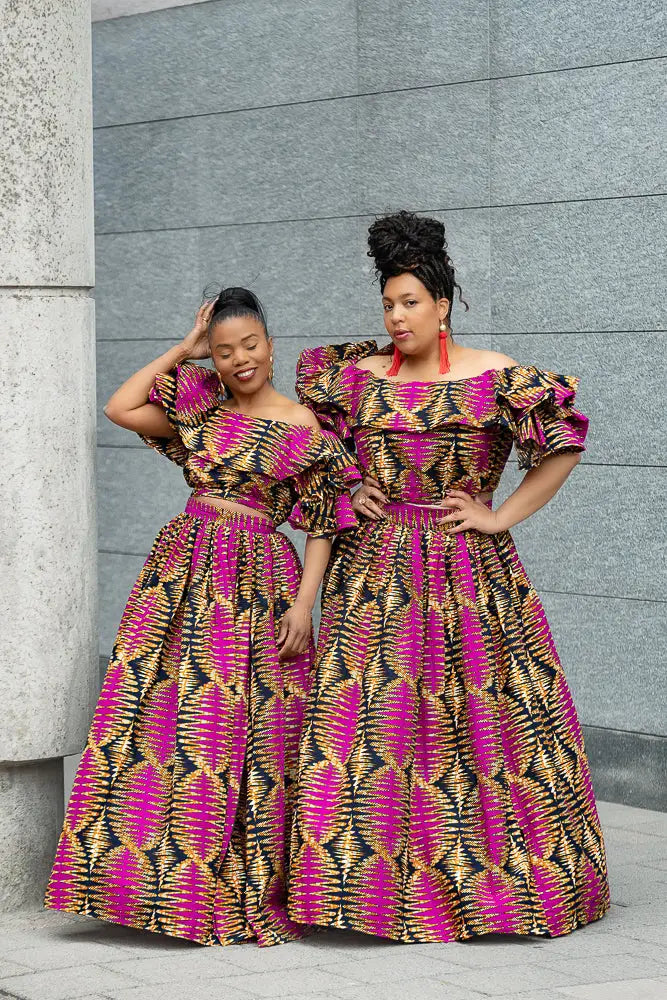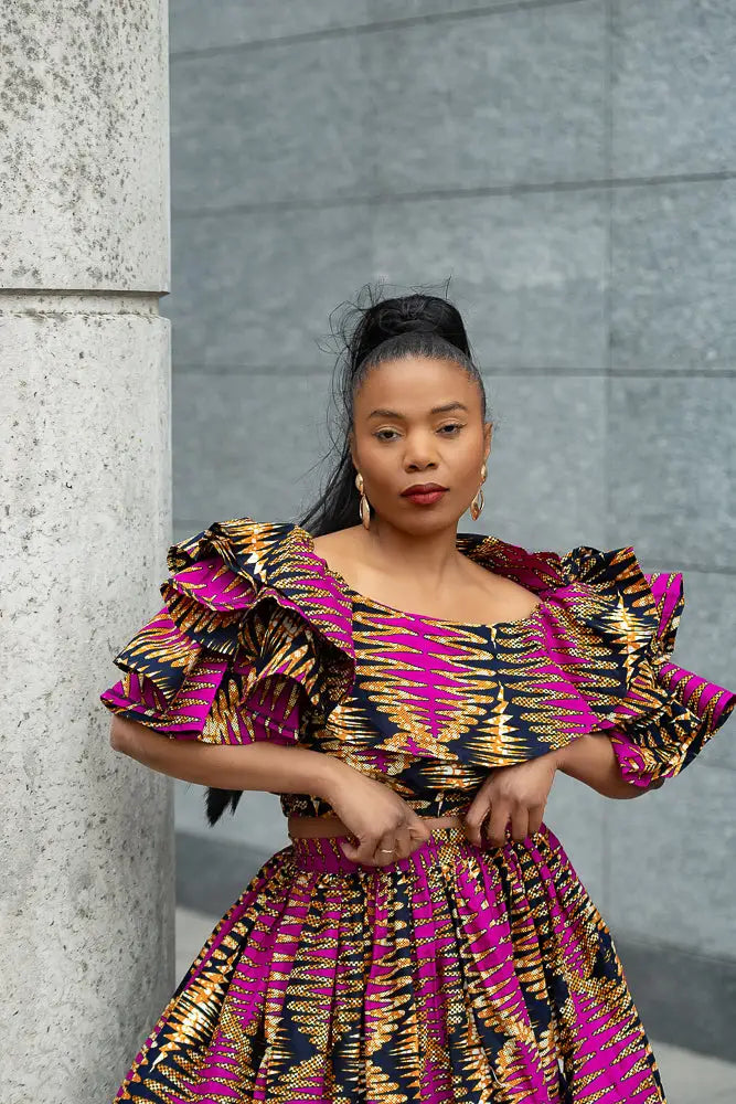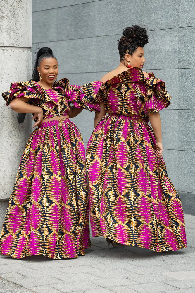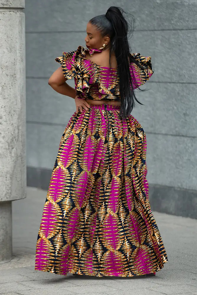 This African wax print crop top and skirt set with cape is a bold and beautiful top that can be worn with any bottoms. It is sure to turn heads anywhere it goes!