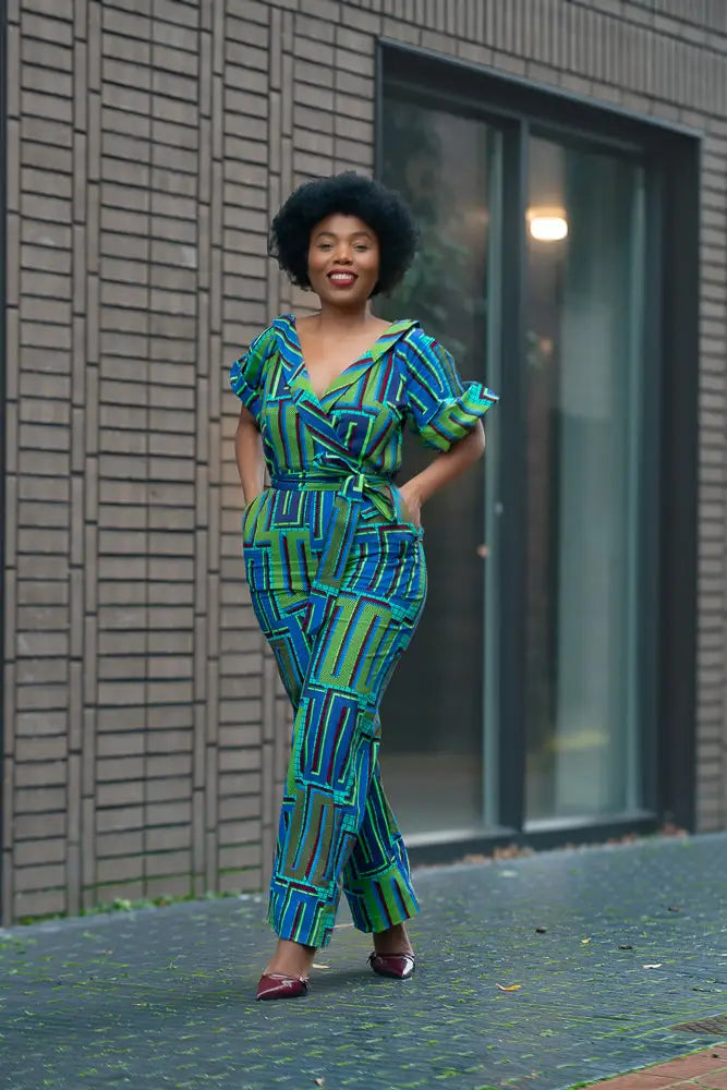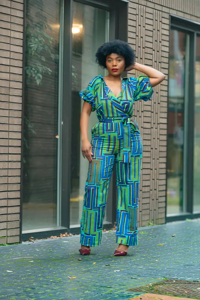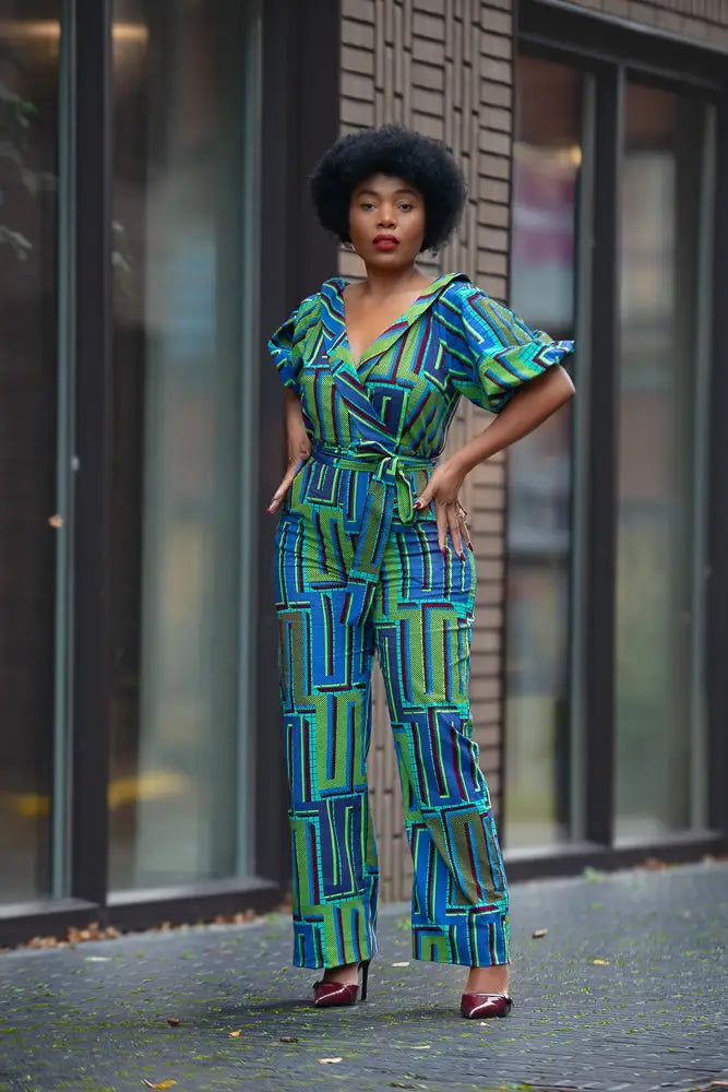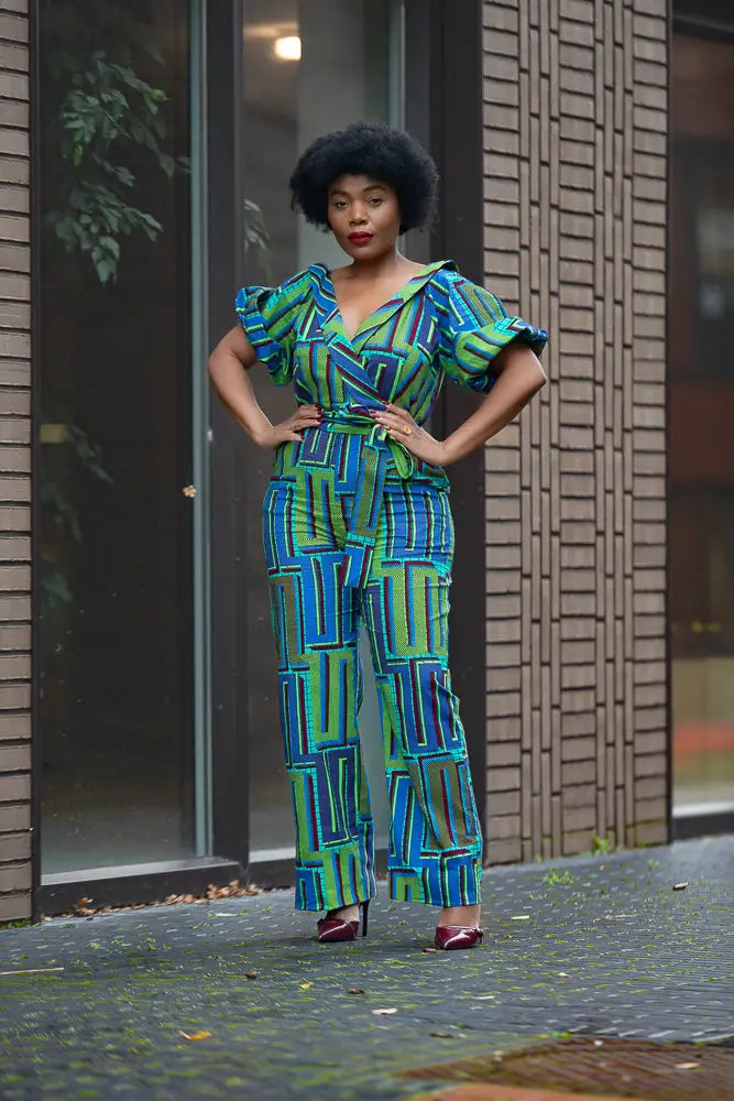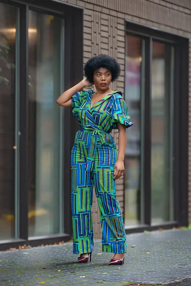 This power sleeve off shoulder jumpsuit is a must have.  It is simple yet so stylish. The African wax print is beautiful and will surely turn heads wherever it goes.