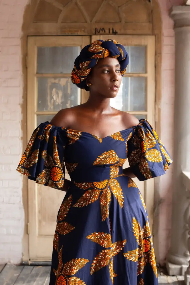 This isn’t just a headband, it’s a braided crown. Woven in deep navy and sunburst orange floral print, it wraps around the head like a halo of confidence. Bold, structured, and unapologetically regal.