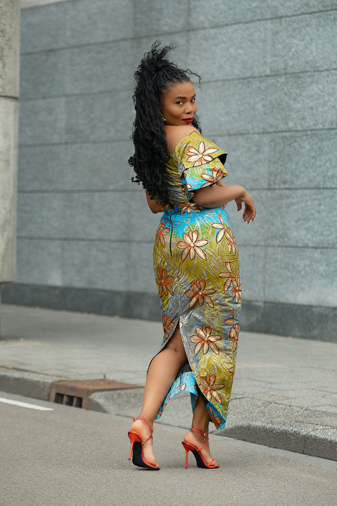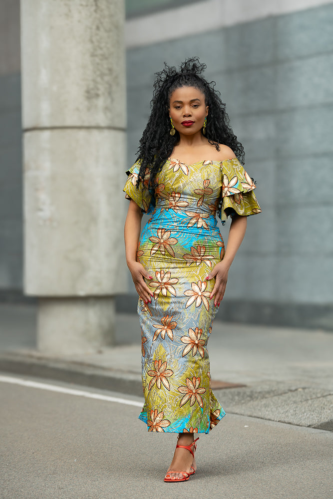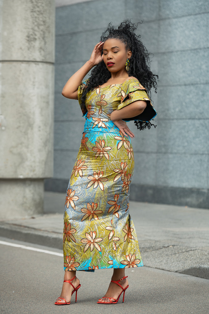 With flowing sleeves that feel like butterfly wings and a soft shimmer of gold woven with white florals, the Mojisola Gold Dress is made to move, with you, around you, and for you. That subtle swoosh of blue and grey in the print? Magic from our ancestors. Add the back slit and the option to wear it on or off the shoulder, and you’ve got a piece that’s all elegance, no effort.