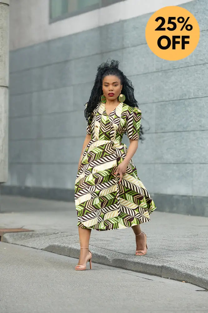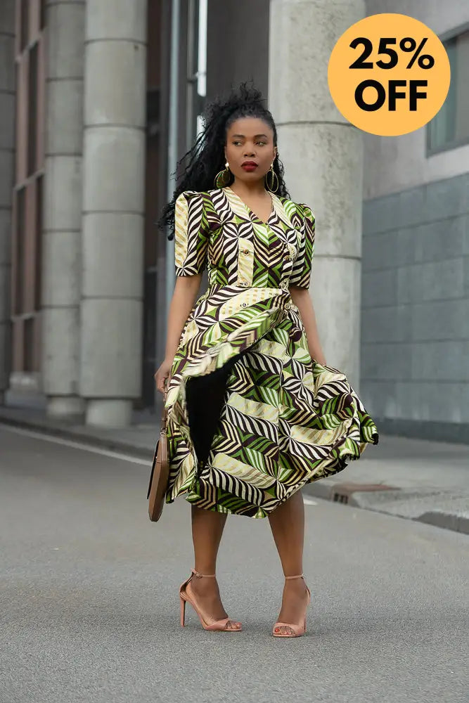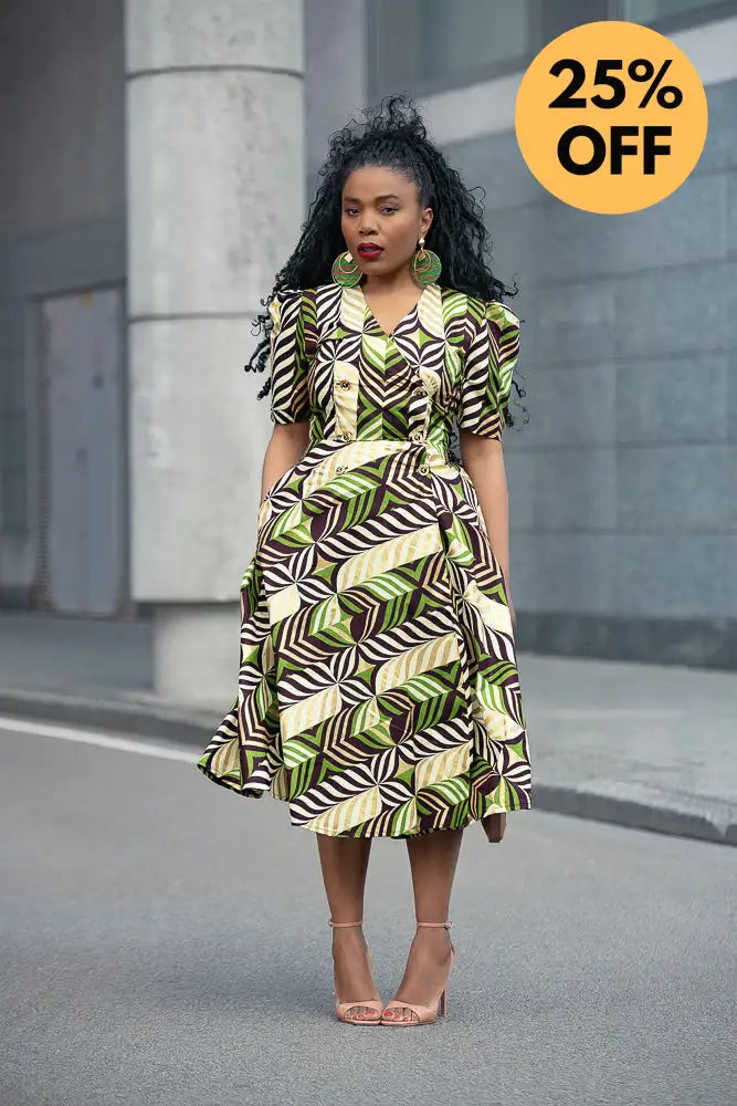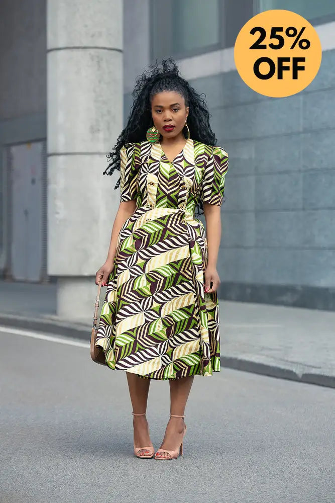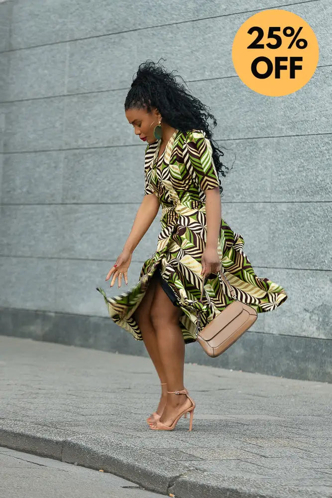 Listen… Abisola is not just a dress. She’s an entrance. The structured shoulders? Power. The gold tones with those lush greens and deep cocoa brown? Pure elegance. And the wrap fit? Baby, she knows how to flirt with your waist without trying too hard.