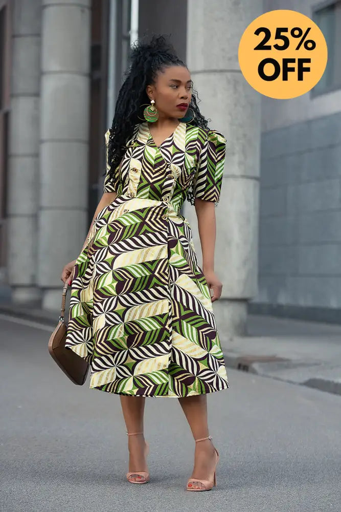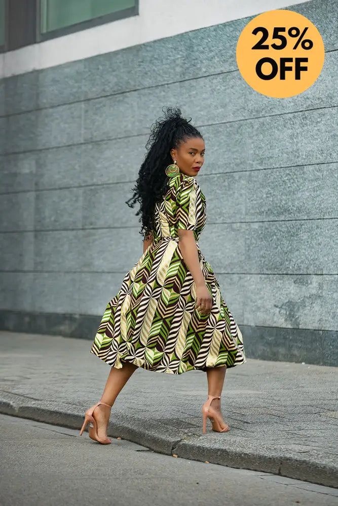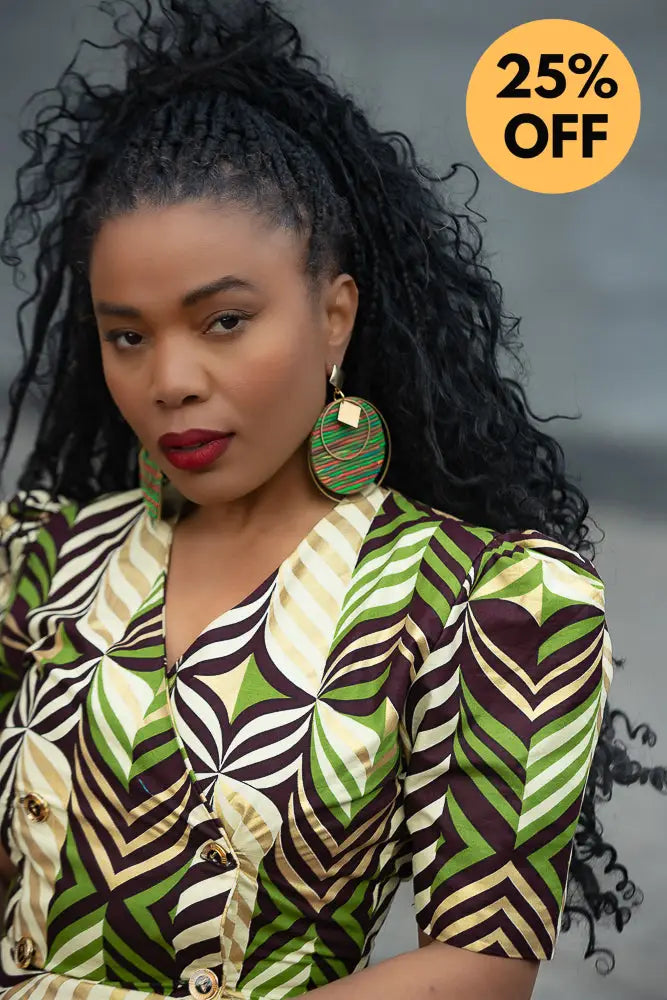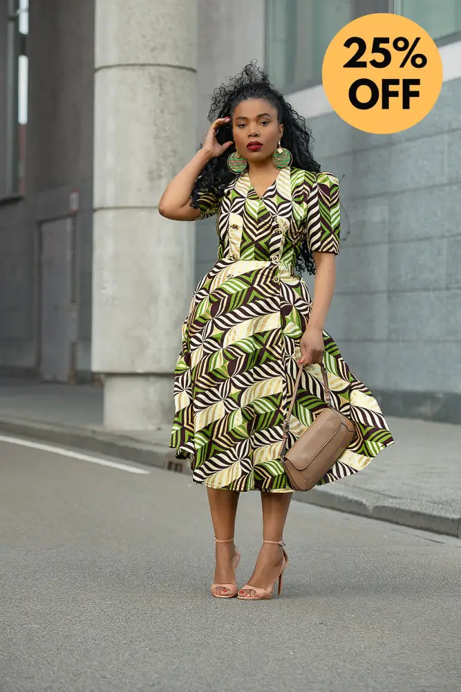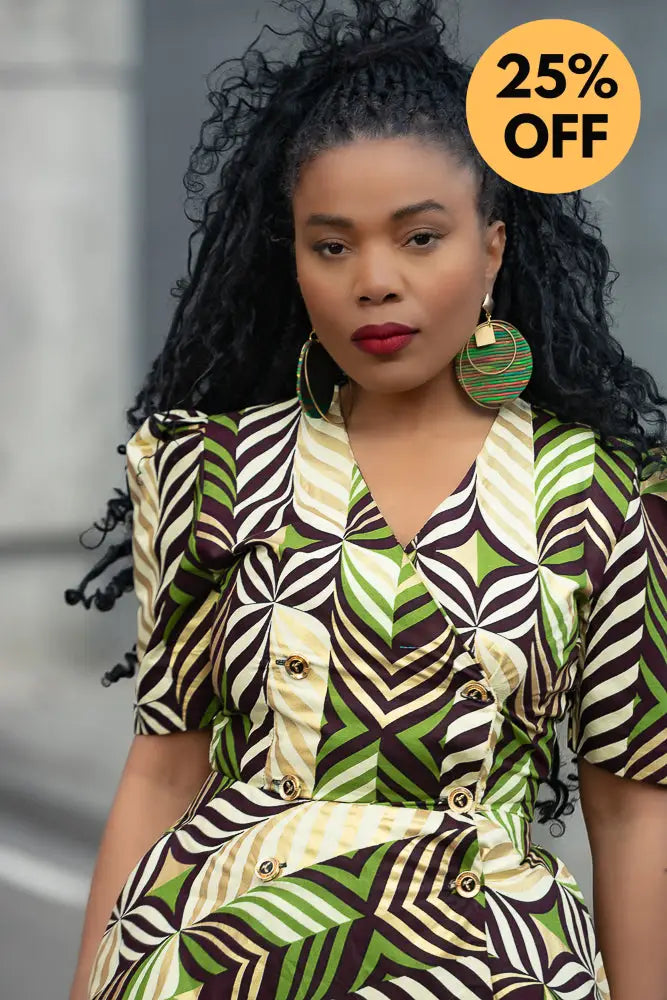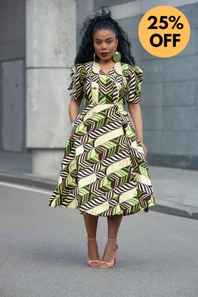 Listen… Abisola is not just a dress. She’s an entrance. The structured shoulders? Power. The gold tones with those lush greens and deep cocoa brown? Pure elegance. And the wrap fit? Baby, she knows how to flirt with your waist without trying too hard.