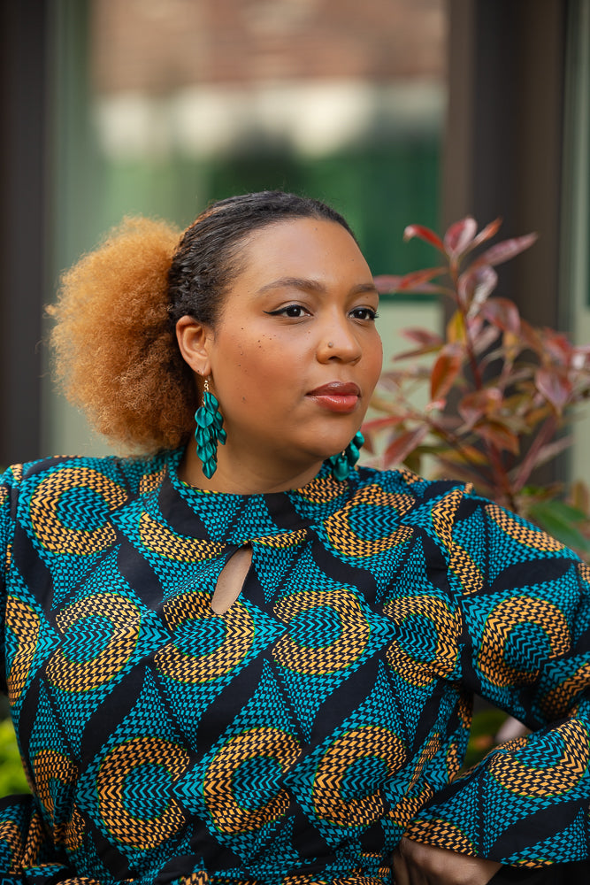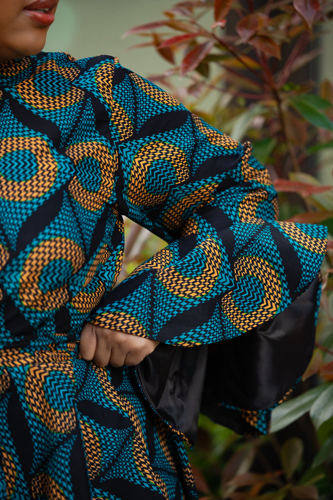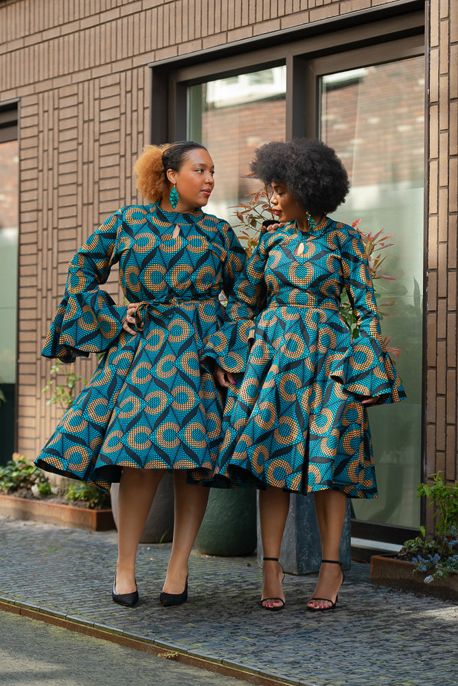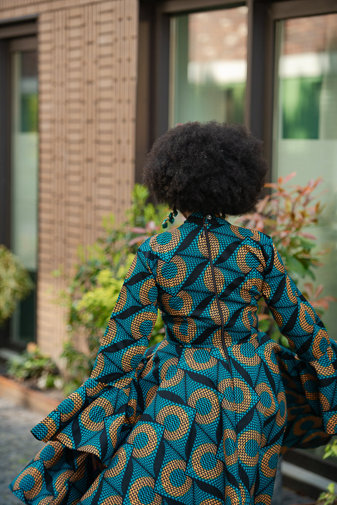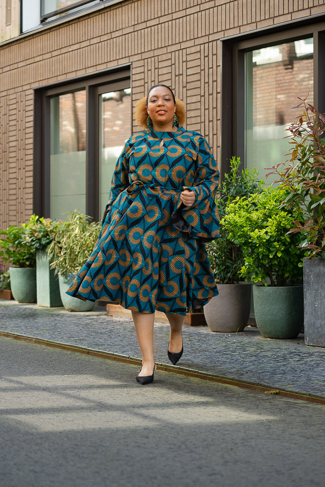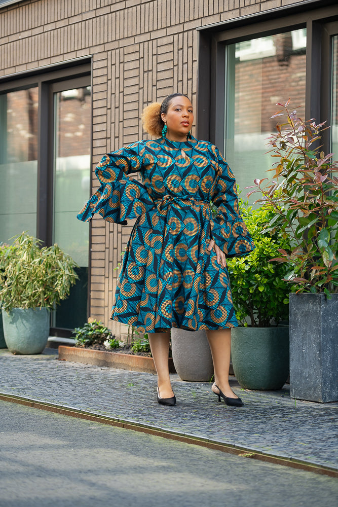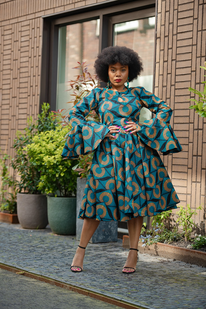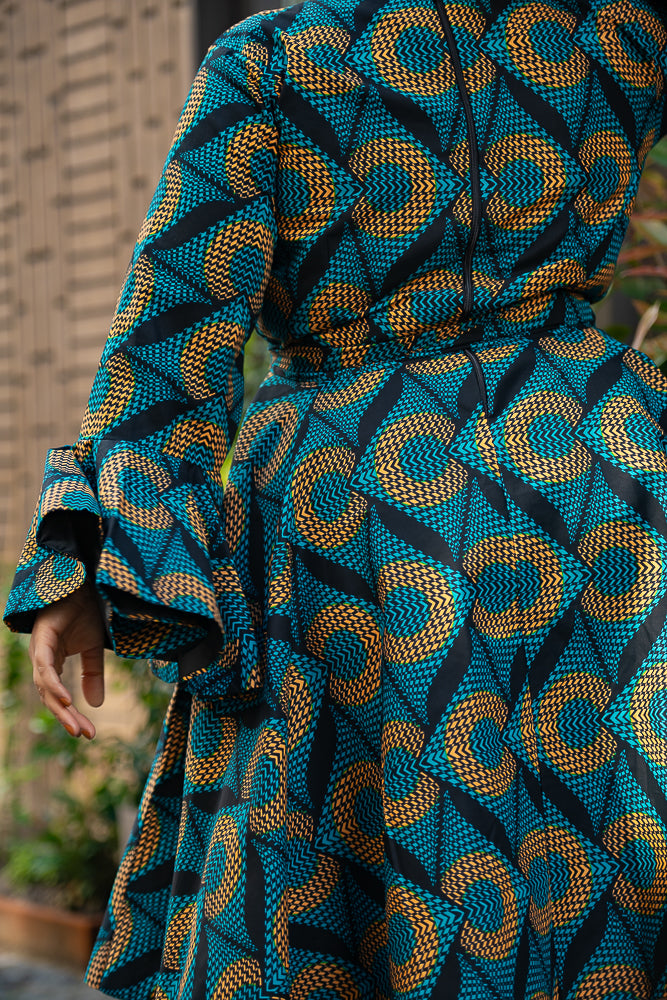 Here's where drama meets elegance in the most spectacular way. Be mesmerized by this jaw-dropping midi dress with its bold, eye-catching blue pattern, and those striking umbrella sleeves that command attention, this dress is your ultimate statement piece. Slip it on, and you’ll find yourself entranced by your own reflection, thinking, “Wow, I am absolutely stunning.” And trust me, you won’t be the only one who thinks so—everyone around you will be captivated, some in awe, others whispering their admiration, and a few even daring to say it out loud.