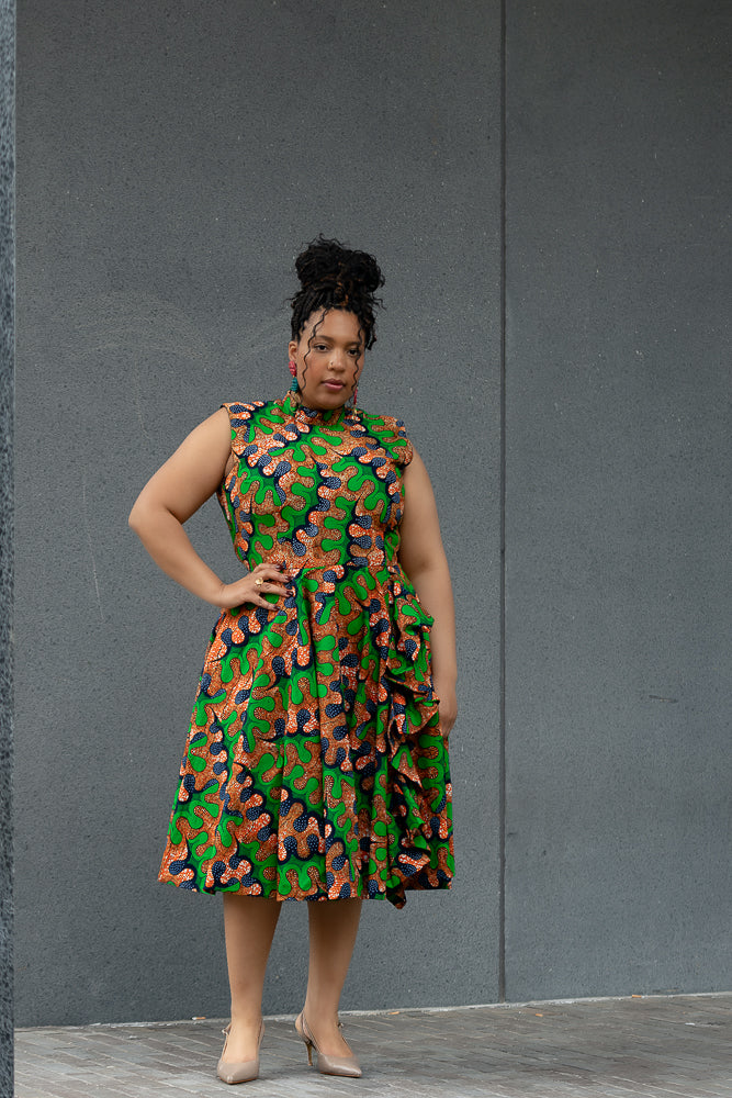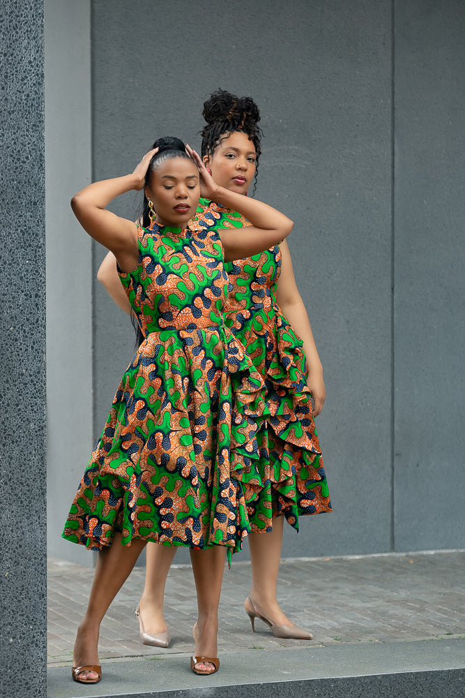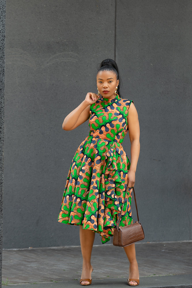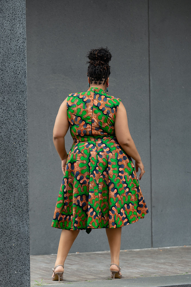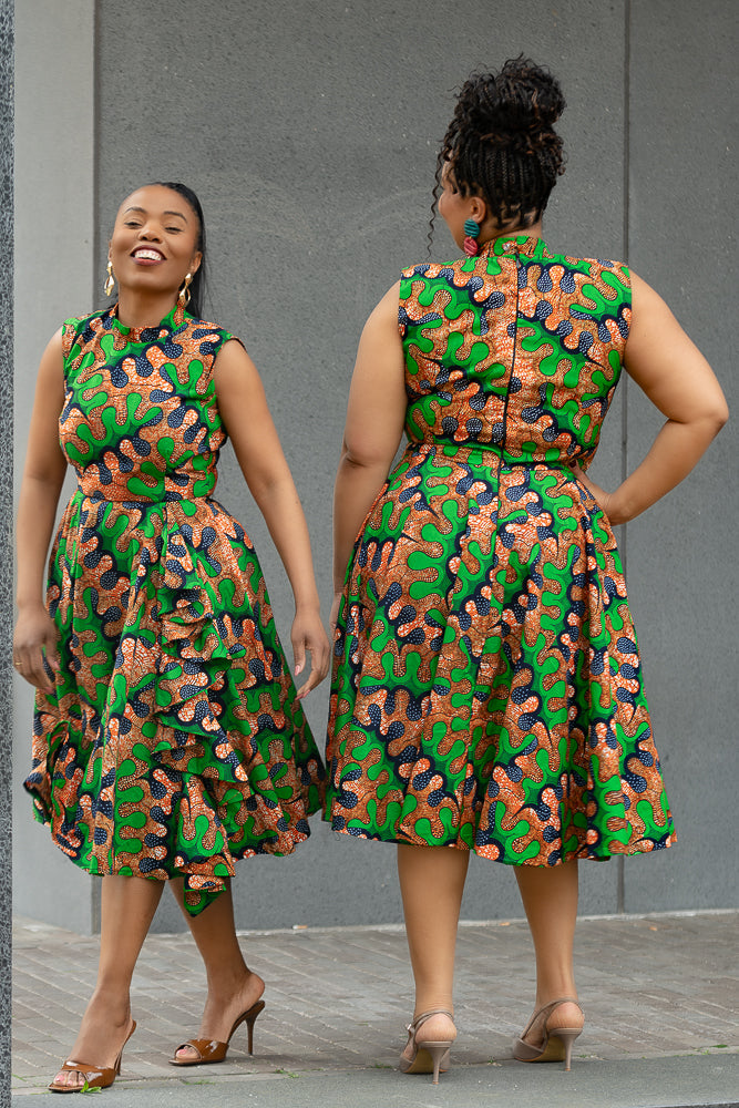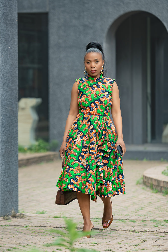 A sleeveless, high-neck beauty that flatters without trying too hard, with a soft, wavy overlay that moves like a ripple in still water. It’s the detail that catches the light and the compliments. The coral reef-inspired print adds that gentle pop of green, earthy and lush, like summer on your skin.