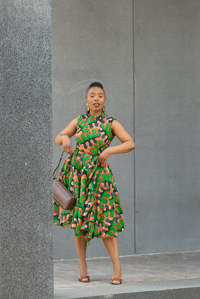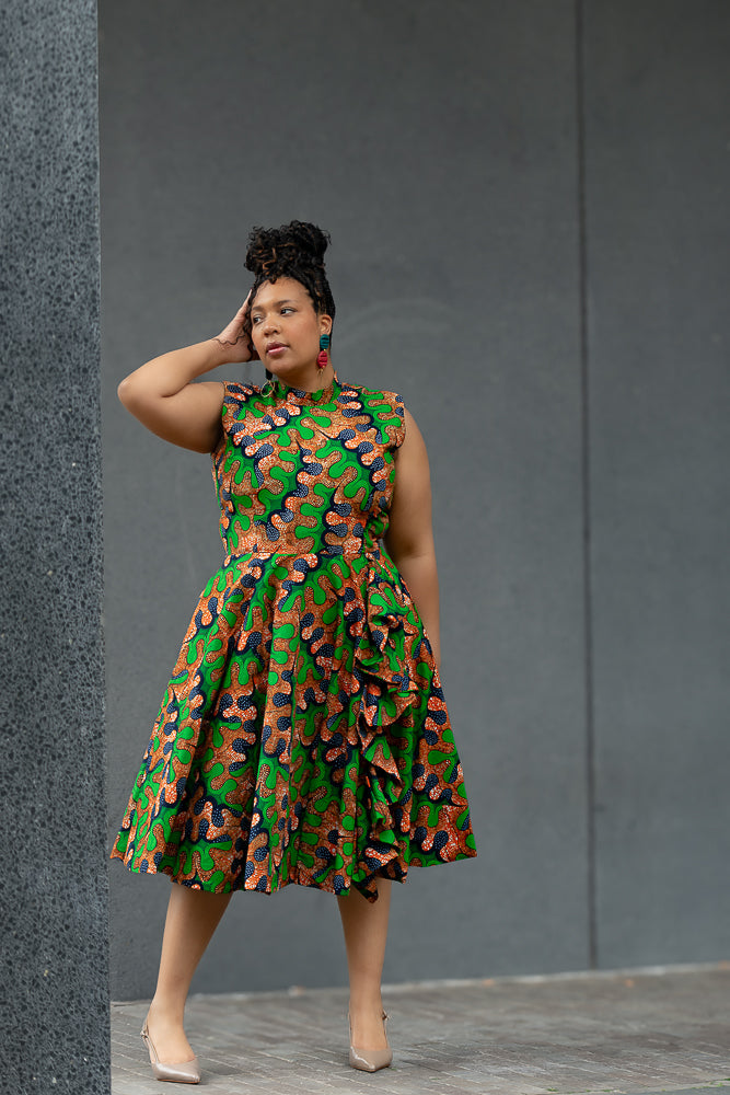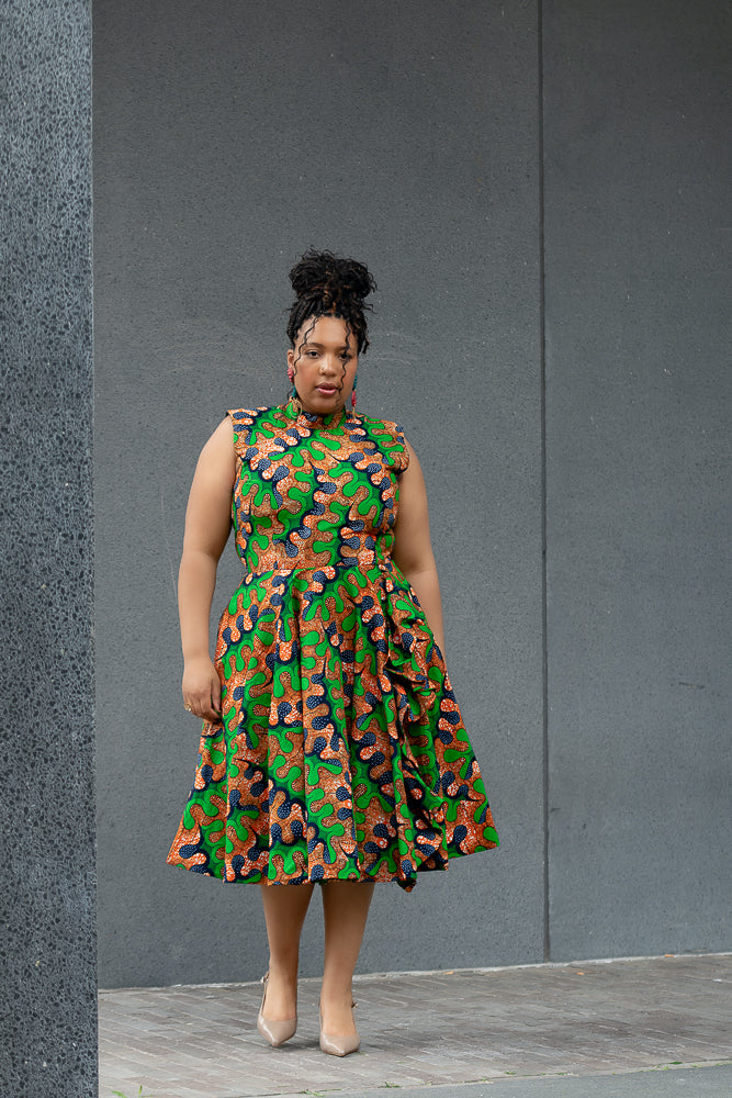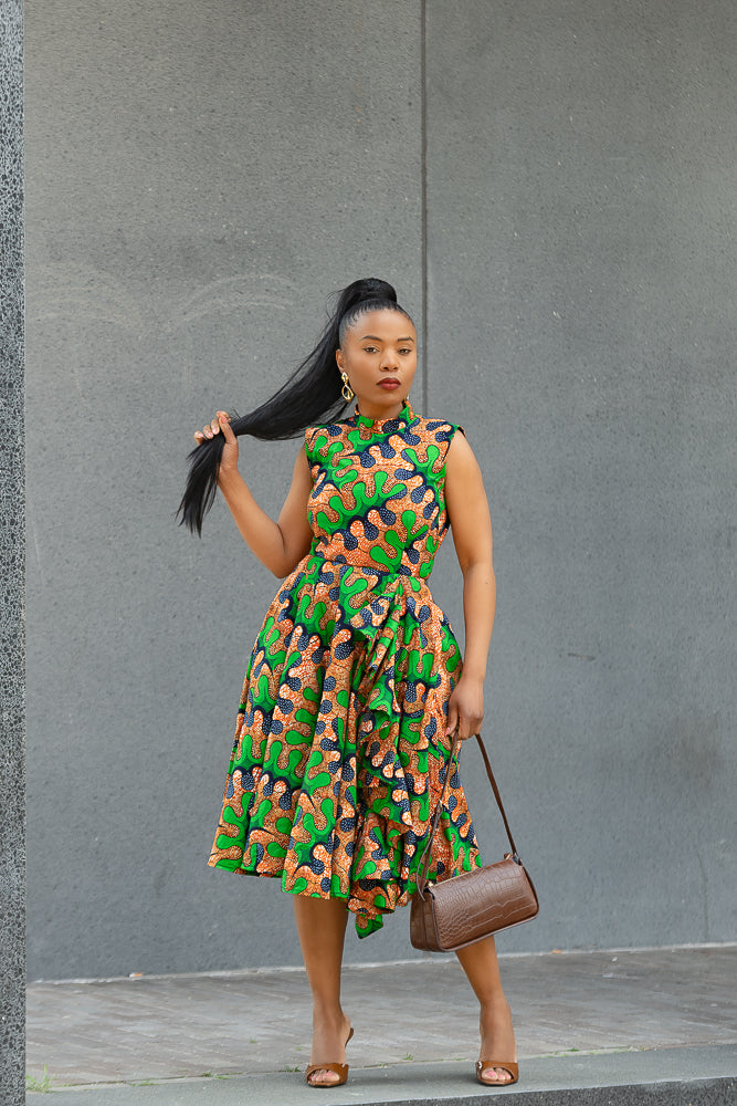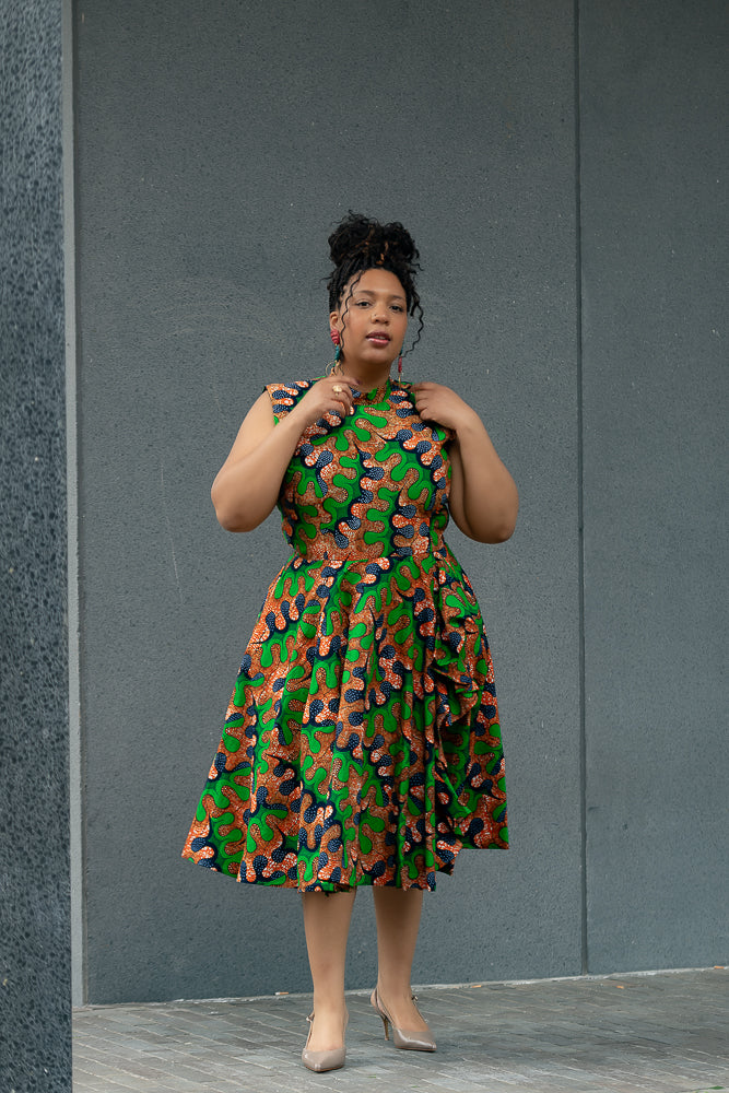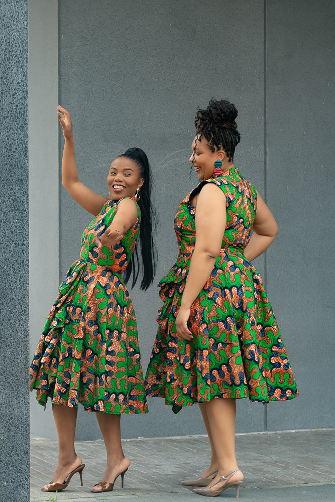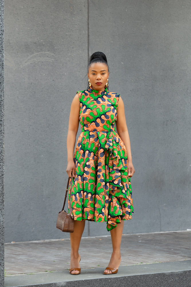 A sleeveless, high-neck beauty that flatters without trying too hard, with a soft, wavy overlay that moves like a ripple in still water. It’s the detail that catches the light and the compliments. The coral reef-inspired print adds that gentle pop of green, earthy and lush, like summer on your skin.