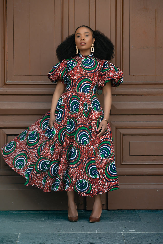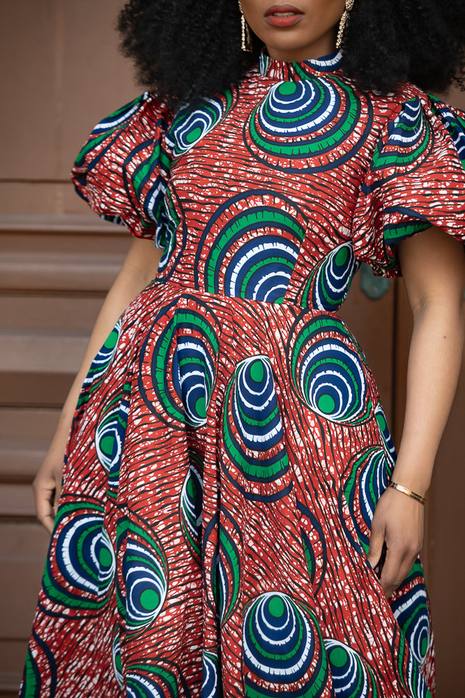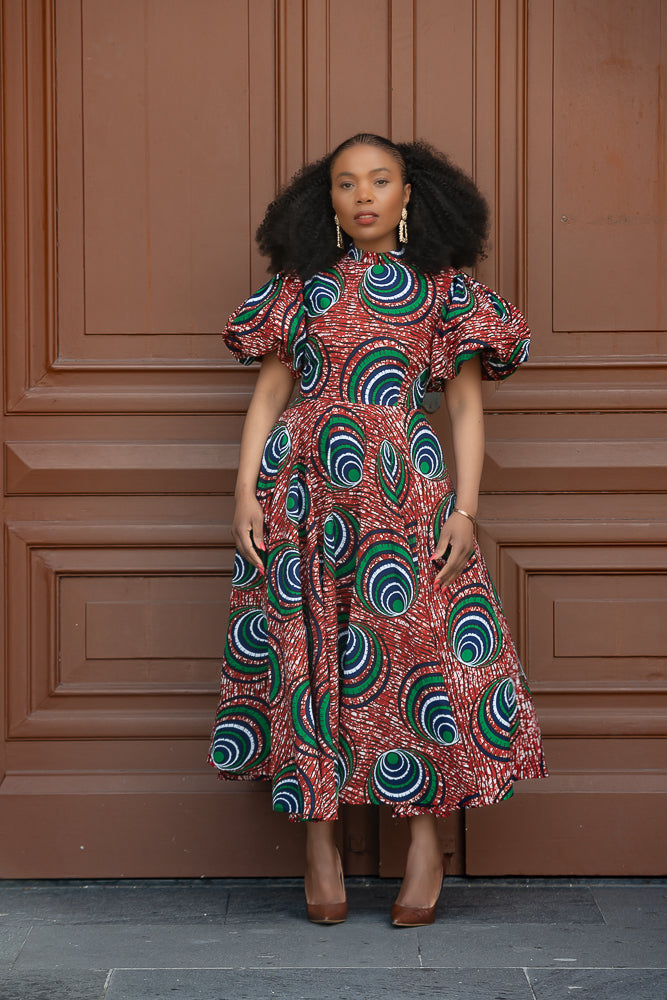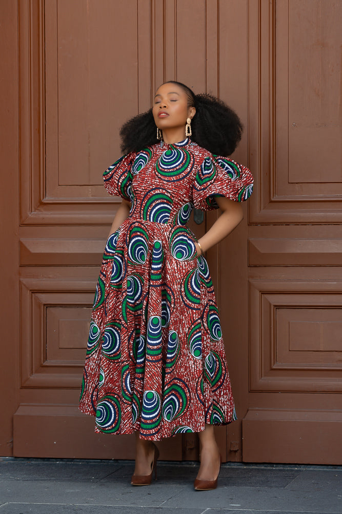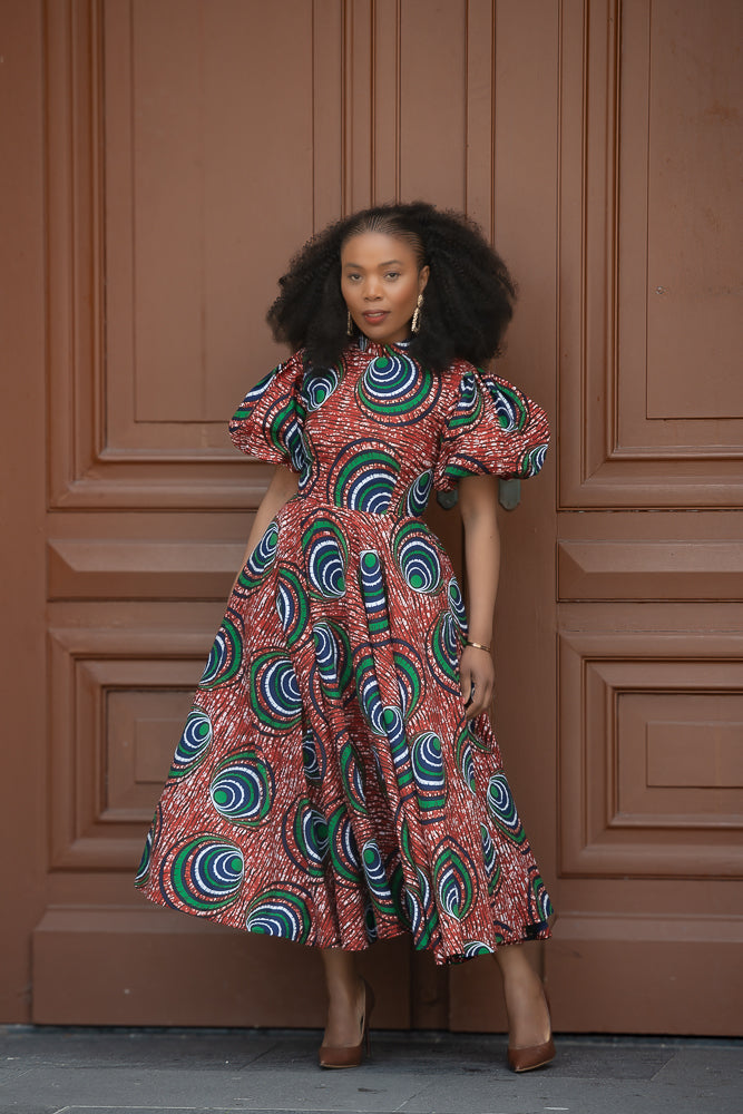 Feminine design meets trending style. The OLORI High Neck Dress is the piece your wardrobe's been waiting for. A classic high-neck dress with puffy arms for a contemporary twist. It’s a light easy wear, with outstanding prints, side pockets and a back zip for convenience.