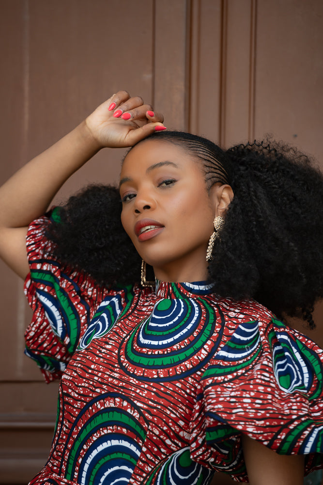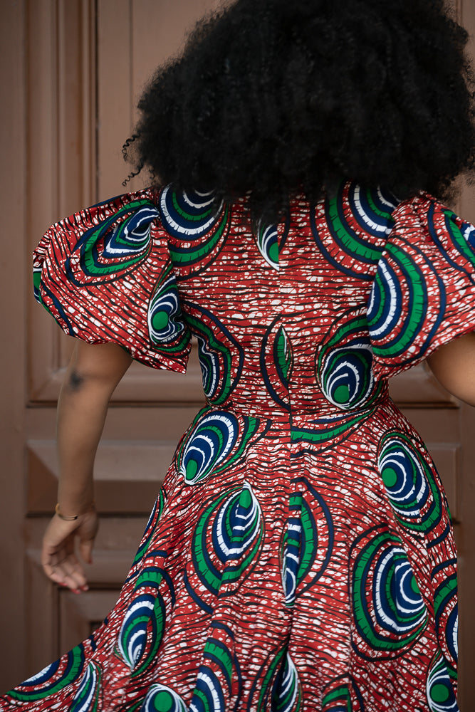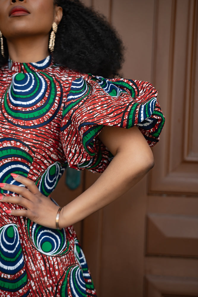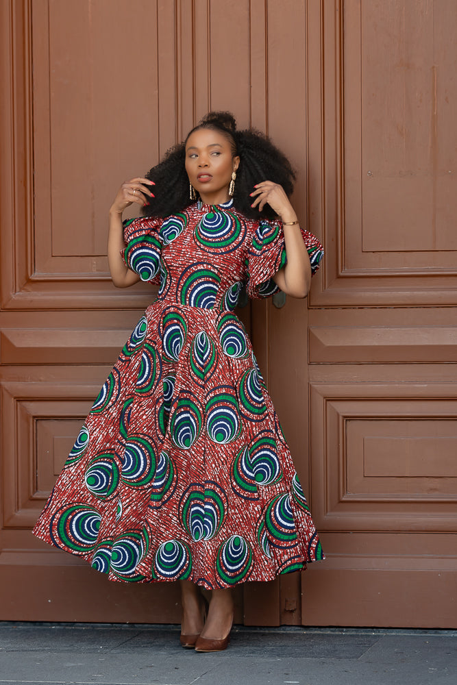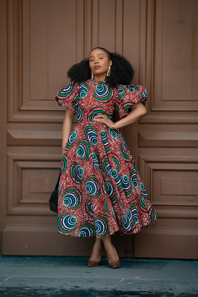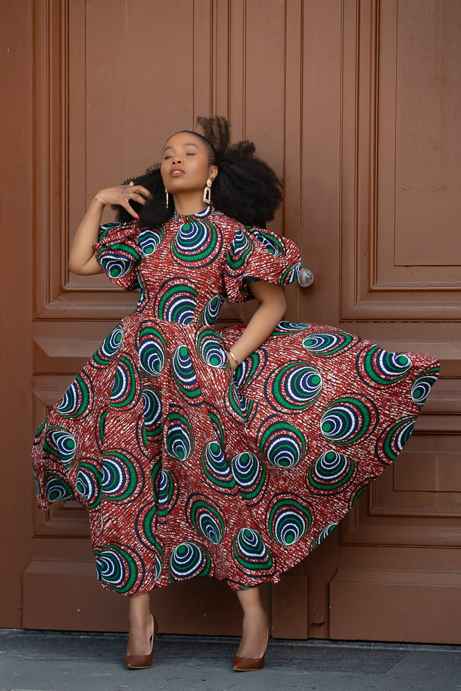 Feminine design meets trending style. The OLORI High Neck Dress is the piece your wardrobe's been waiting for. A classic high-neck dress with puffy arms for a contemporary twist. It’s a light easy wear, with outstanding prints, side pockets and a back zip for convenience.