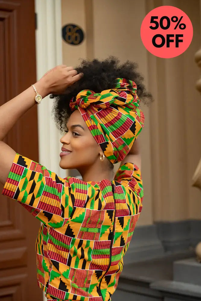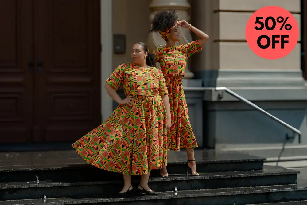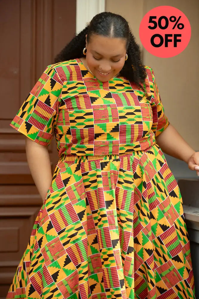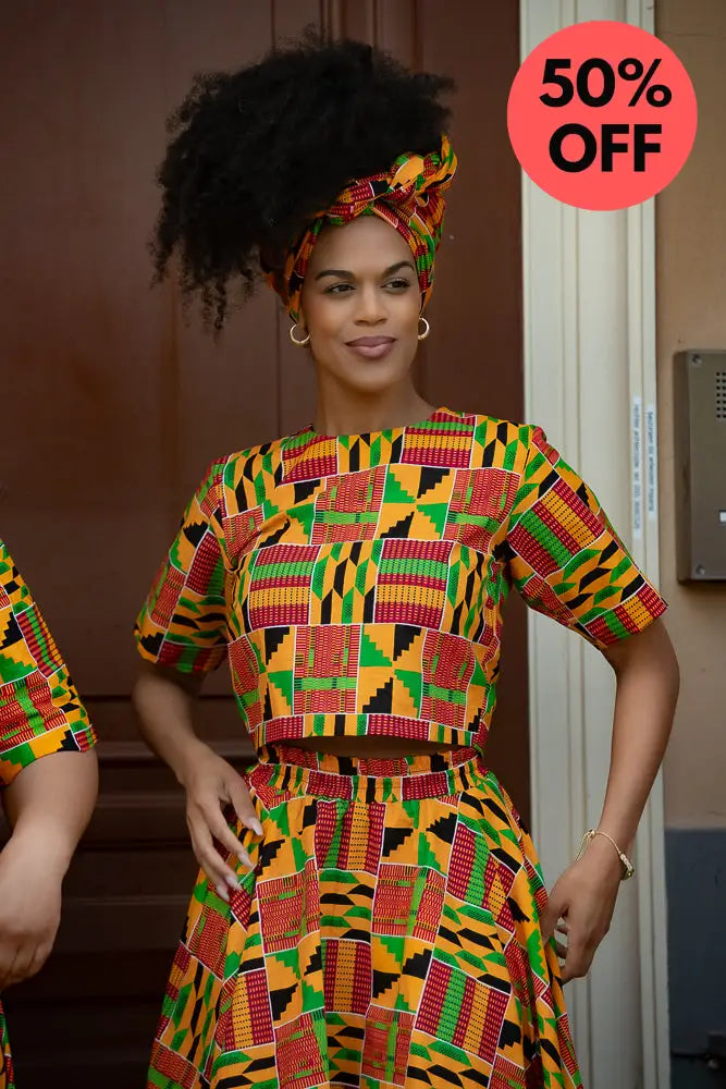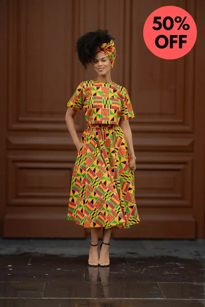 Queens don't just walk in, they show off! This Two-piece set skirt and cropped top with matching detailing will give you that x-factor! It is a bright and beautiful fabric which is fit for any occasion.