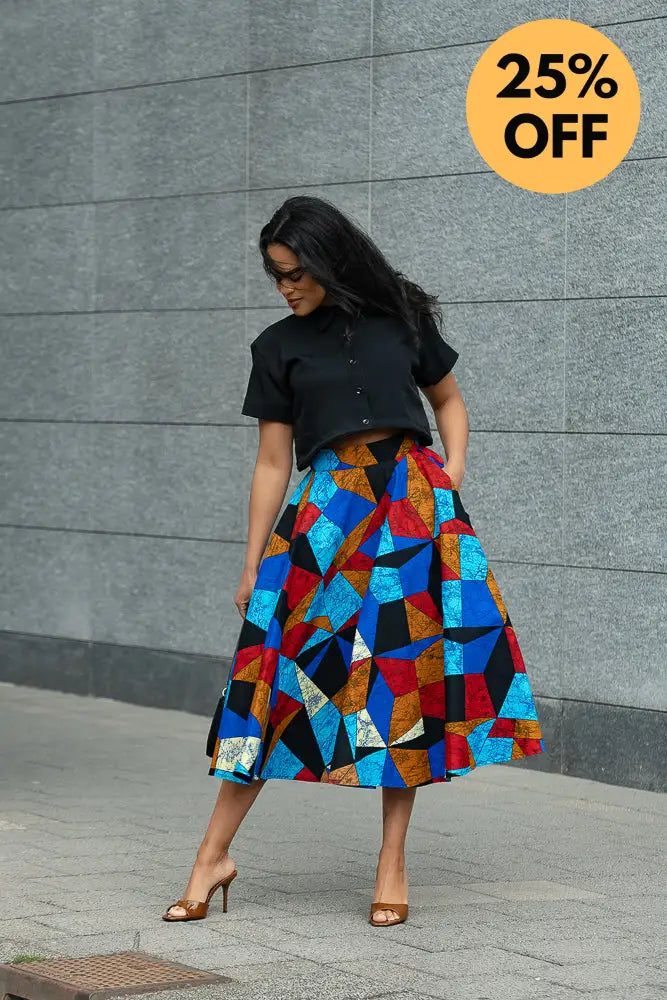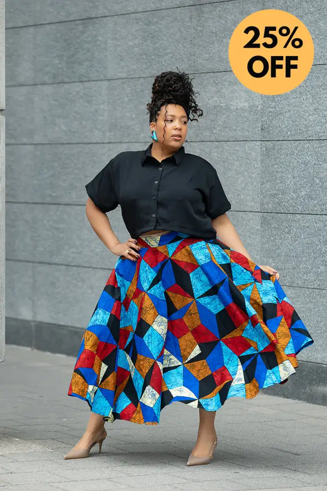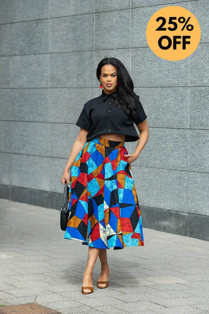 Gorgeous don't just walk in, show off! This Two-piece set skirt and black cropped shirt top with matching detailing will give you that head dropping gaze! It is a bright and beautiful fabric which is fit for any occasion.