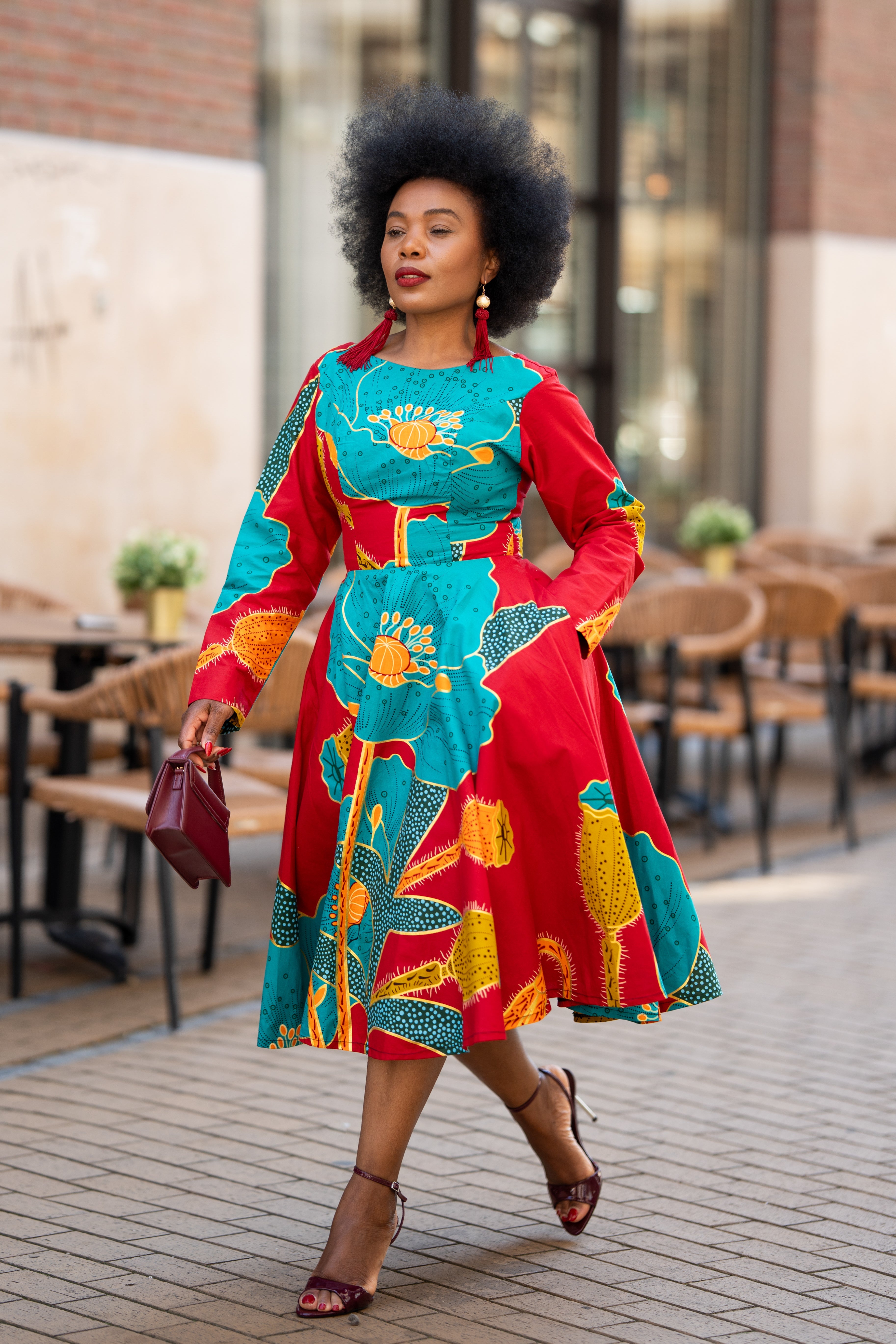This beauty is the sister to our Sophie dress. She’s got longer sleeves, less gathering at the sides, and a full, dramatic flare. You know how younger sisters are bold, playful, and always ready to make a statement.