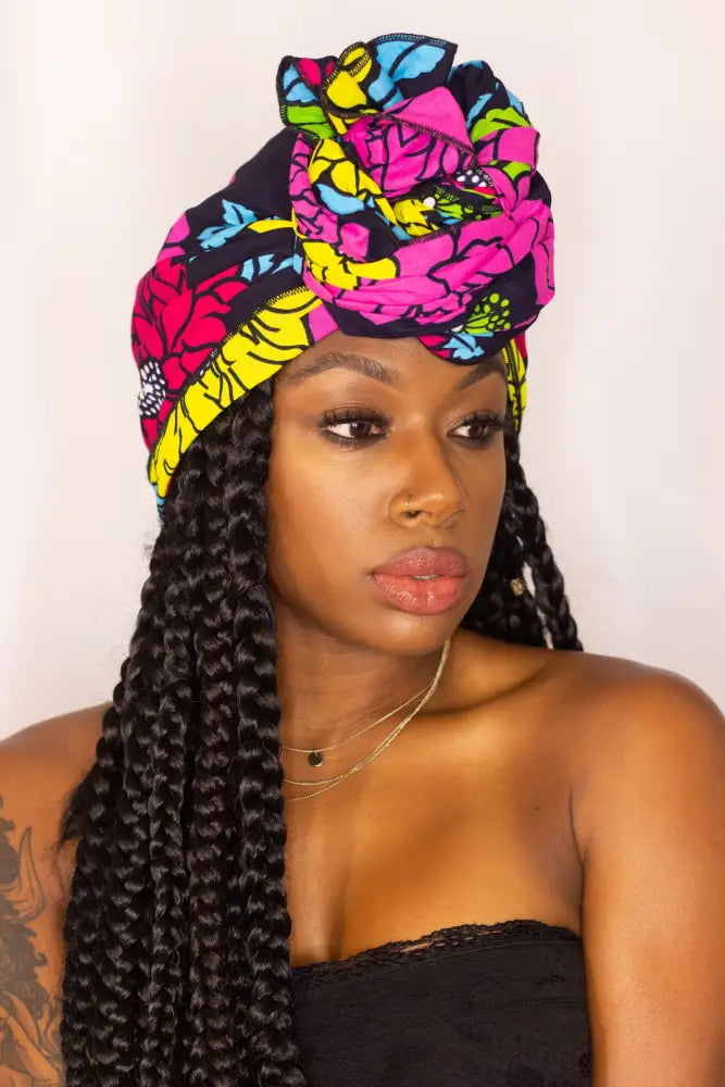 Our African headwraps are stylish, practical and keep hair tidy all day long. They are easy to wear and versatile adding a new dimension to your everyday wardrobe. As African fabrics are colourful, headwraps made from them can enhance a rather simple dress. They are best worn with and complement matching African print garments. They are a must have for every woman due to the ease and glamour they provide.