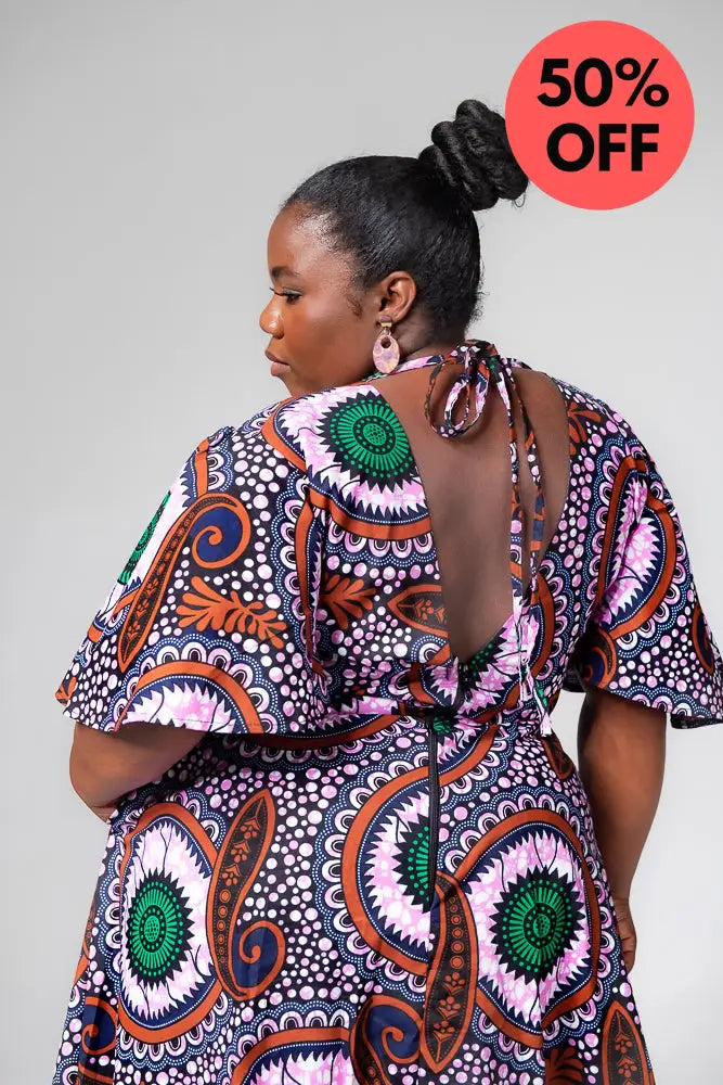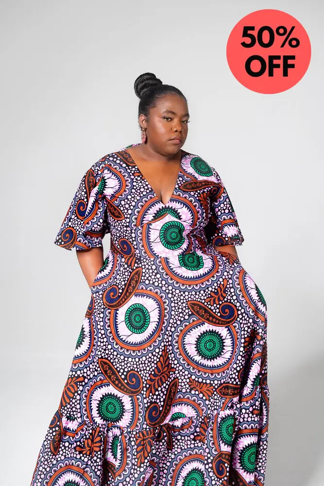 Make a statement with this all-over patterned maxi dress. Featuring a v-neckline with short puff sleeves. Pair it up with some lace up sneakers or heels for the complete look.