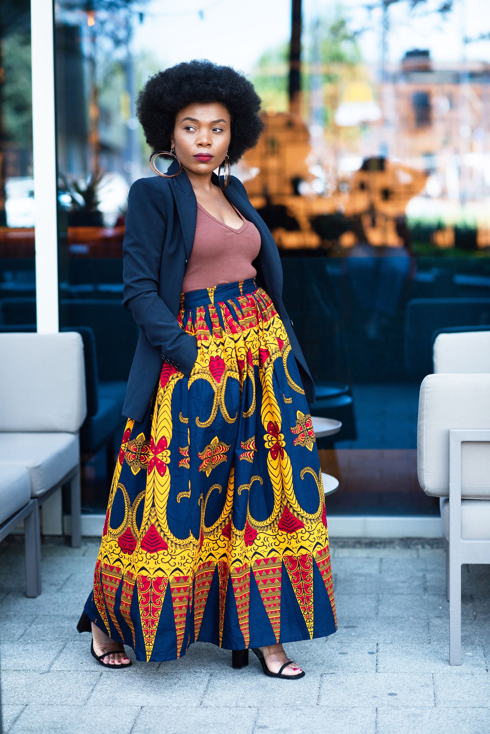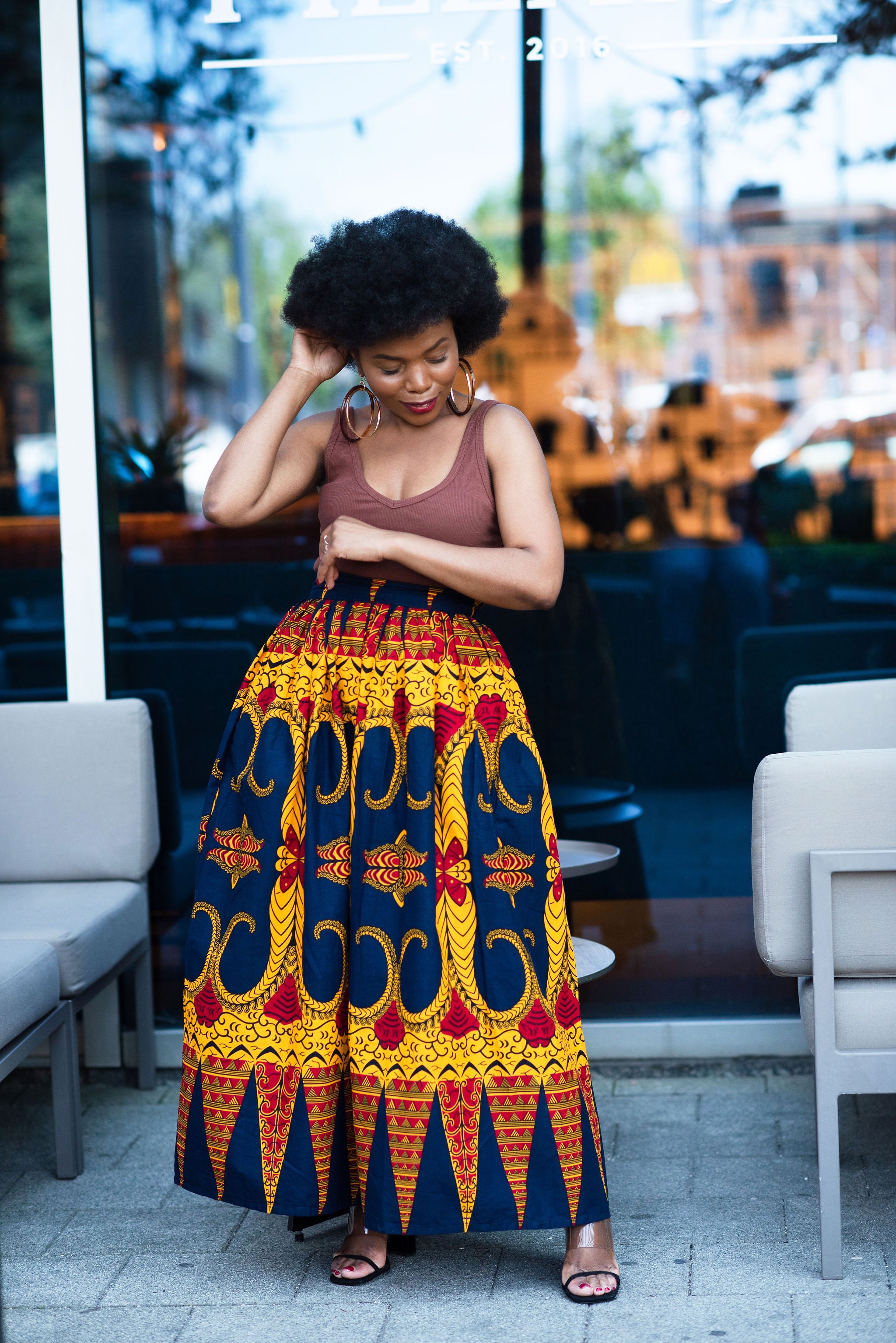 Okay, Oya Maxi Skirt coming through. She's flattering, and endlessly versatile, she’s designed for women who love timeless style with a modern ease. The elasticated waist at the back gives a comfortable, refined fit, while the print gives it vibrancy making styling feel intuitive. Dress her up or down, either way Oya brings grace, comfort, and quiet confidence to every look.