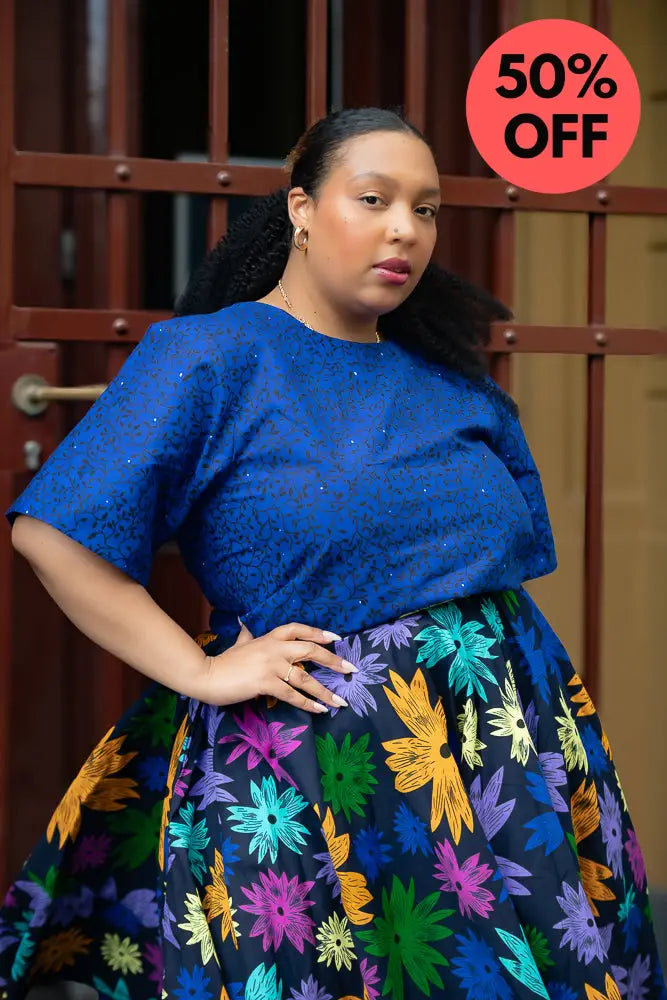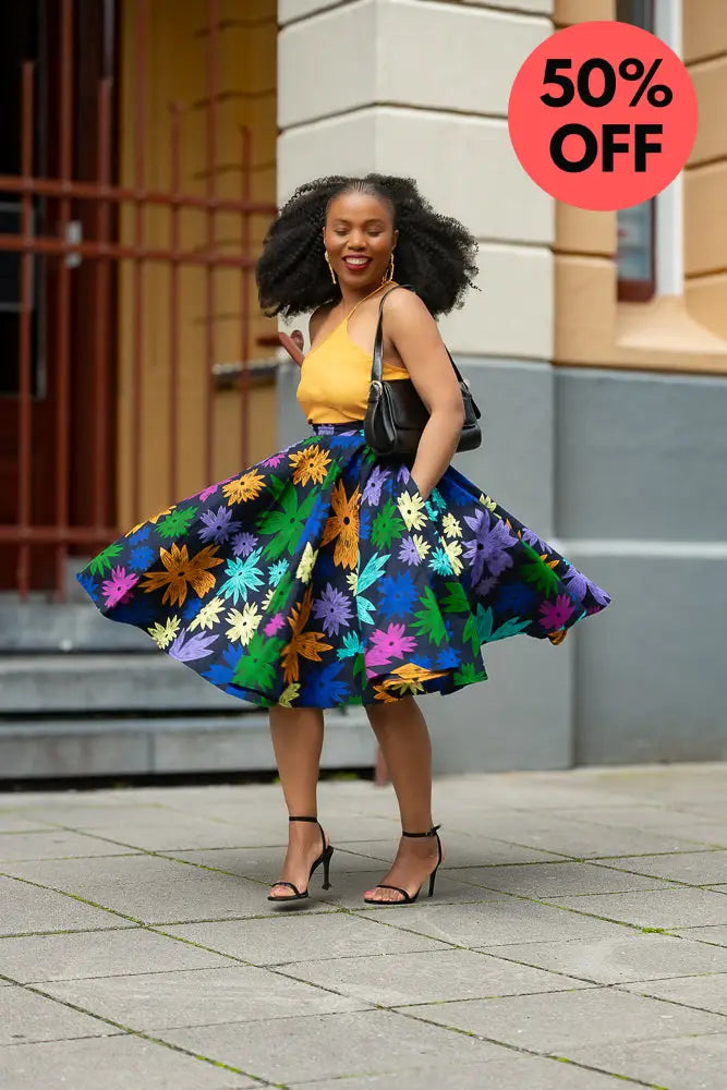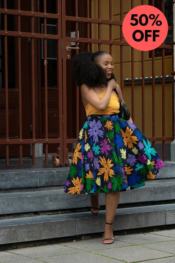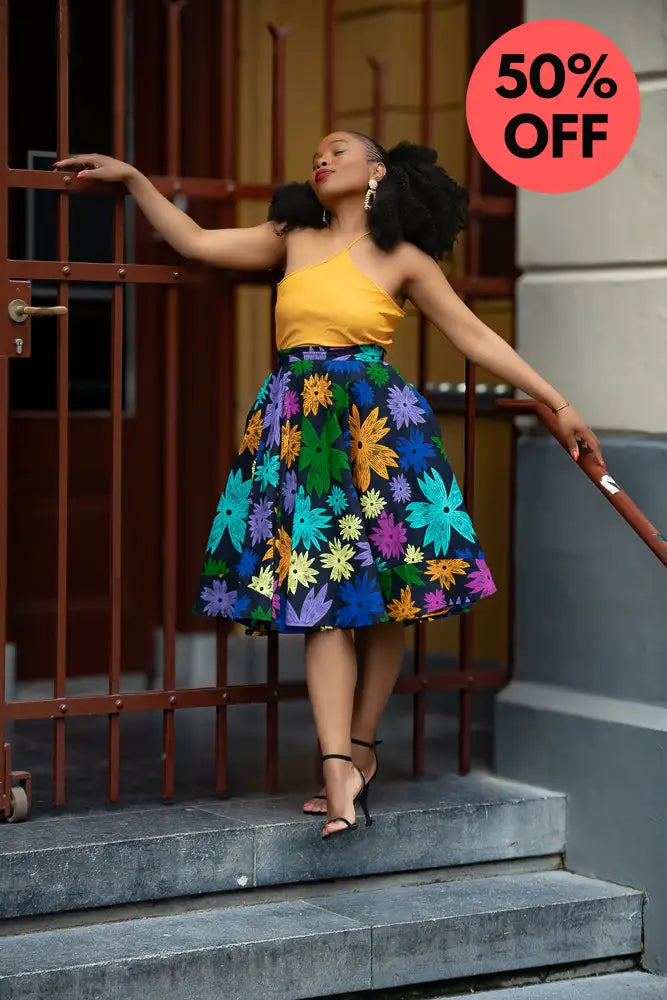 A fashionable, floral skirt. The Yomi skater skirt is the perfect addition to your wardrobe, a strong piece that goes easily with a plain T-shirt and pair of sandals.