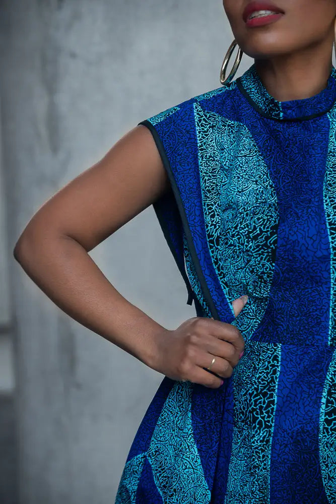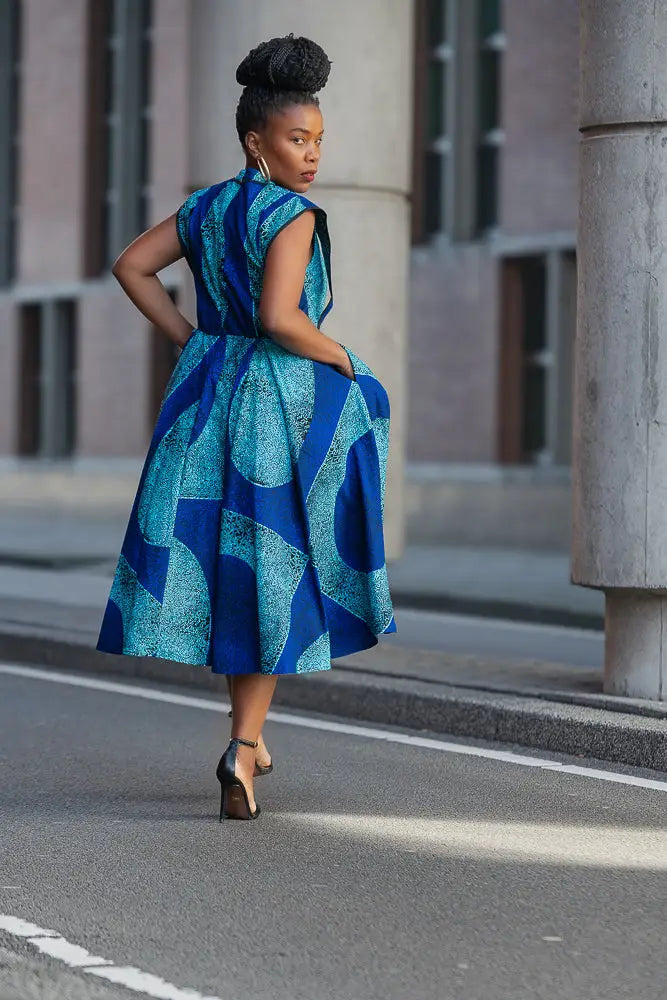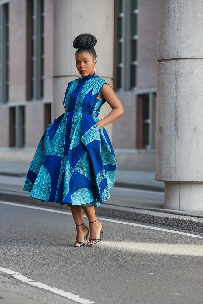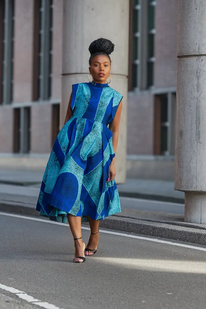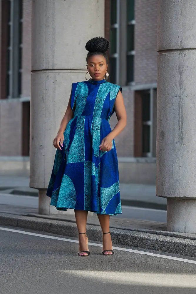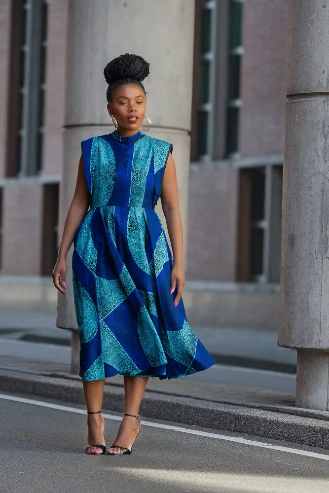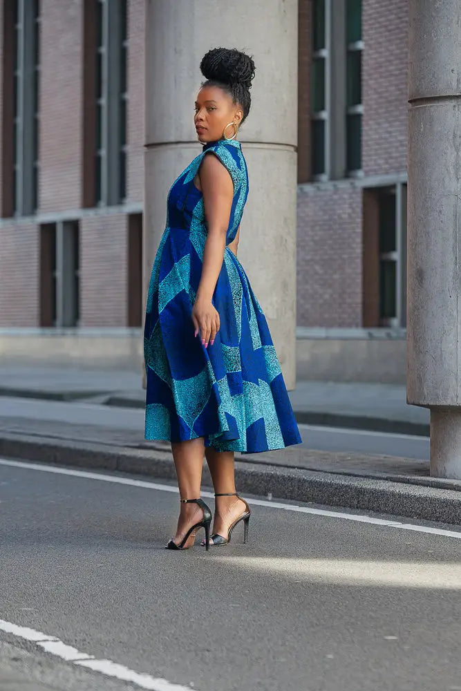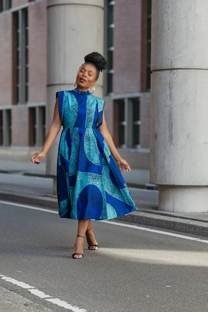 Ready to stand out in style? New to the AW collection. The Ankara print adds an electrifying touch, symbolising passion and energy. This sleeveless design reveals your shoulders and arms with elegance, while the midi length provides a chic and fashionable look.