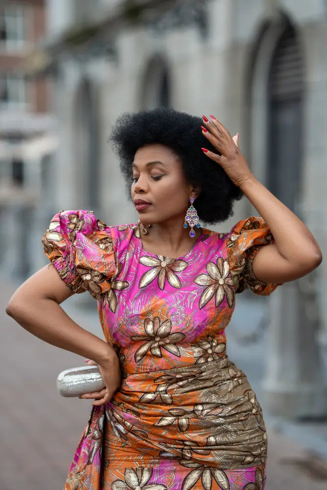 This dress said “go big or go back to basics.” And you? You chose glamour. The puff sleeves deserve their own postcode. The metallic florals catch the light and compliments. And that ruched waist? Chef’s kiss. It hugs you like a proud mom at graduation.
