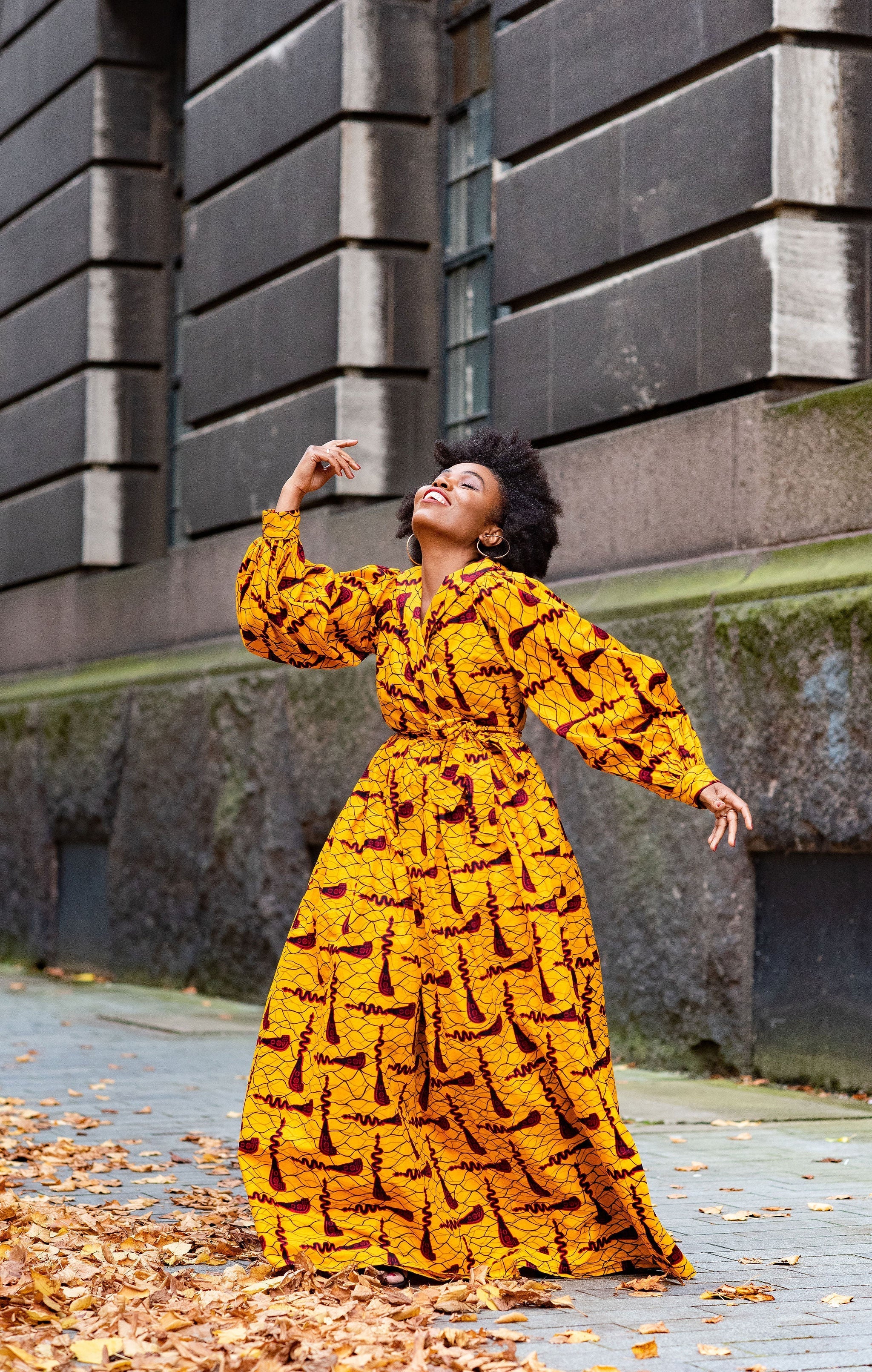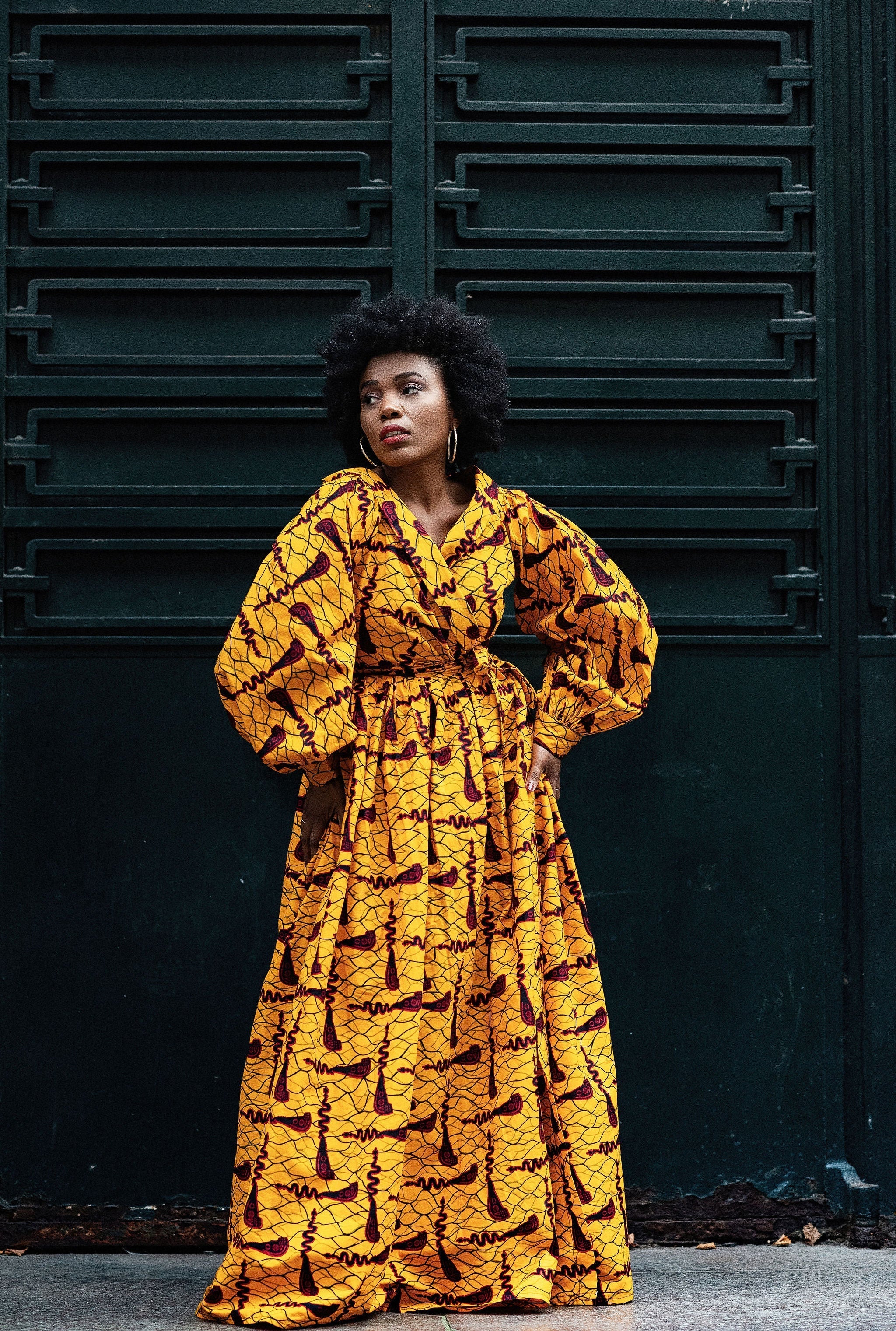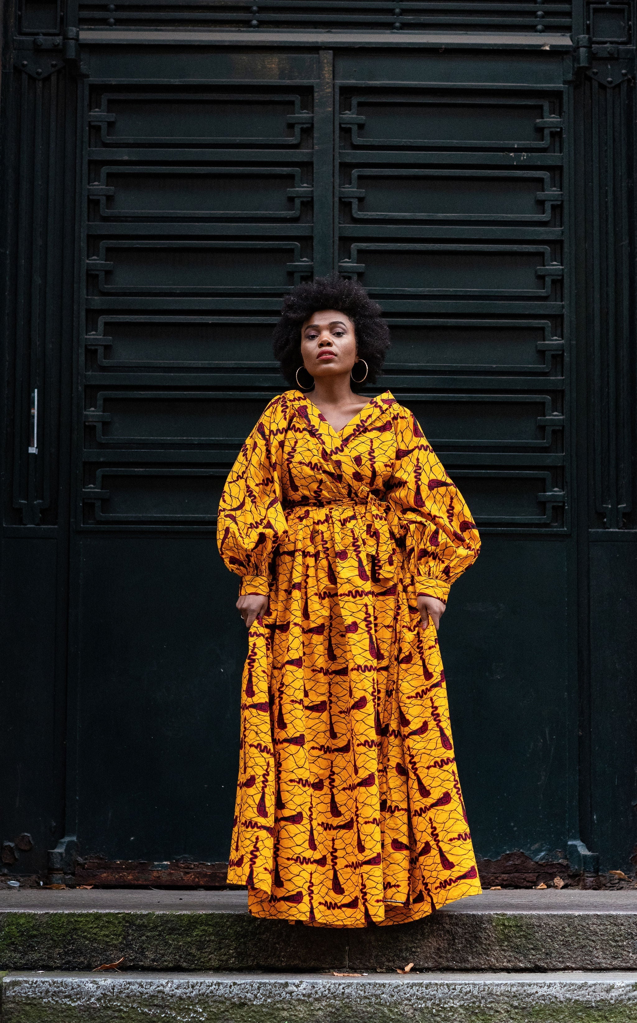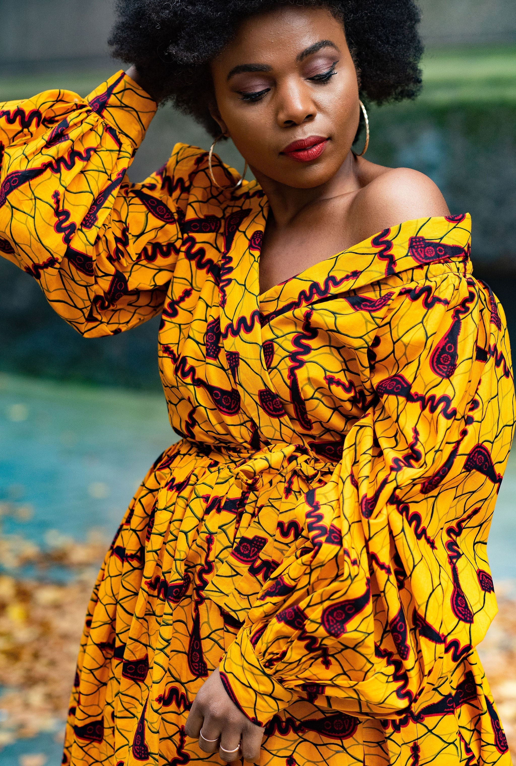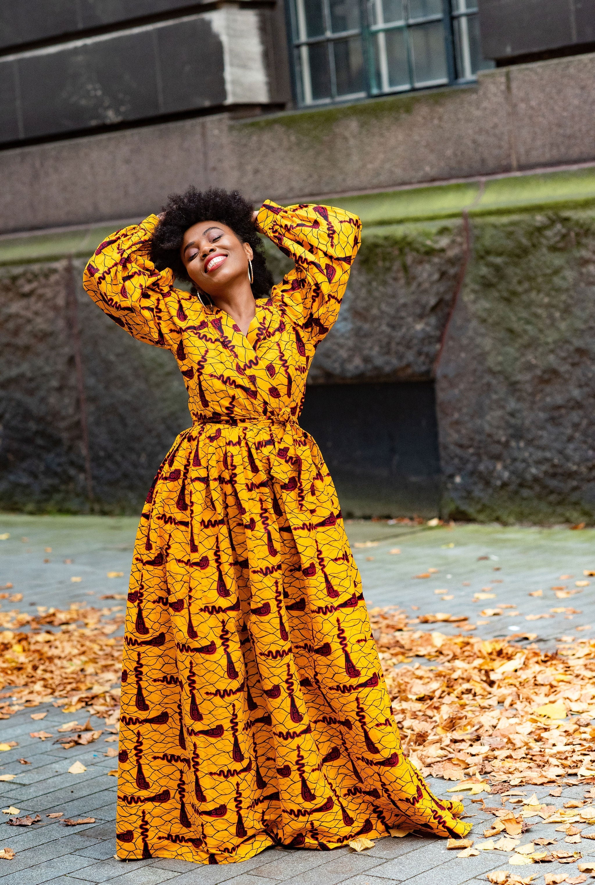 African wax yellow print wrap dress with side pockets. This fun, flowing wrap Ankara dress is perfect for any occasion. It can be worn by pairing with sandals for a casual look or with strapped heels for that overall chic vibe.