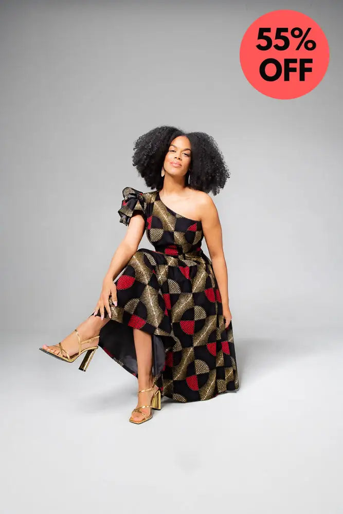 Flaunting a flowing 100% cotton construction, this midi-length dress weds our affinity for colorful and contemporary detailing with a zest of asymmetry. Draping across one shoulder, the unique pleated top presents a graceful look that delights both queen and audience.