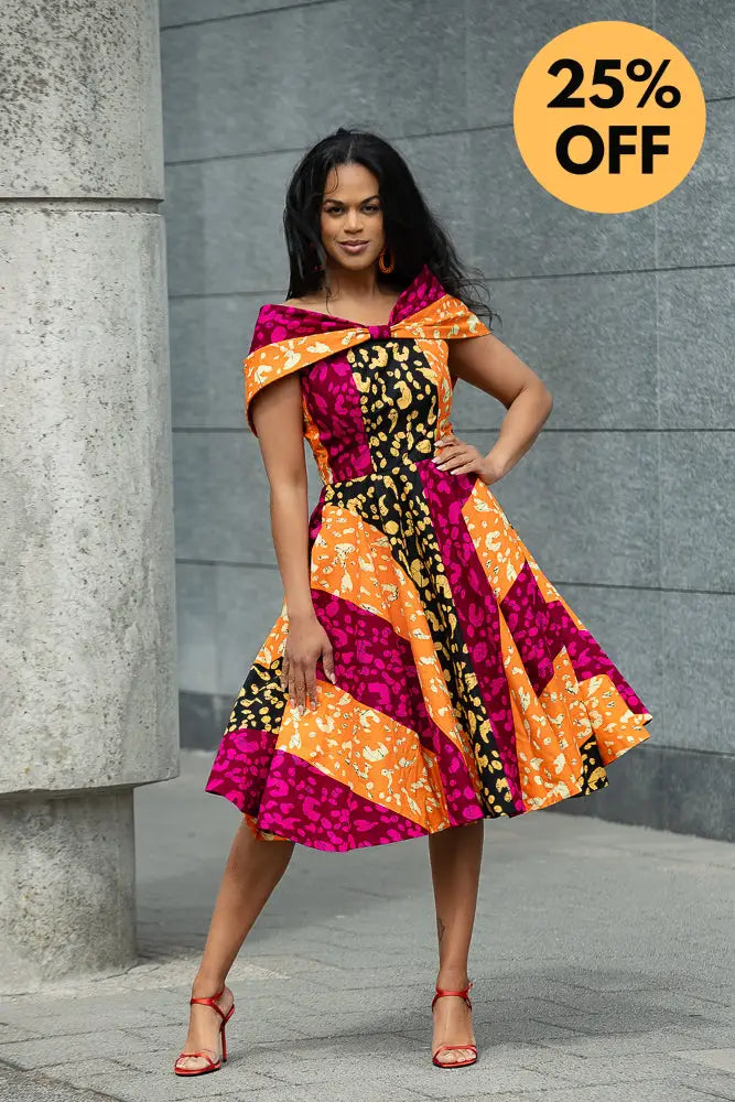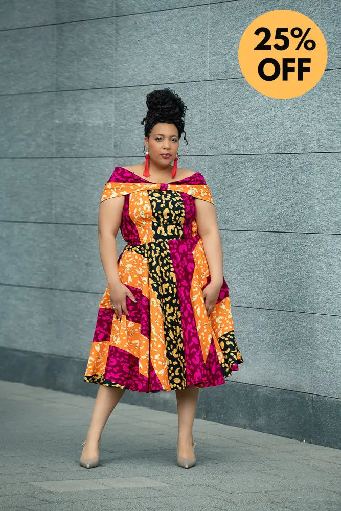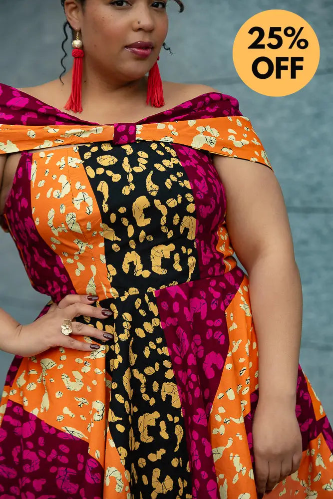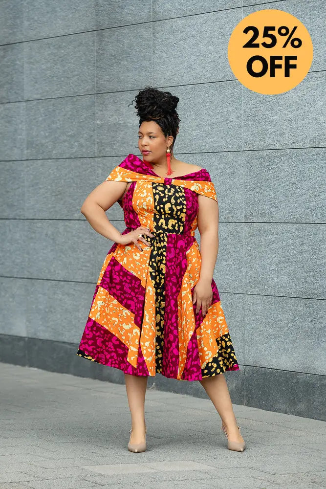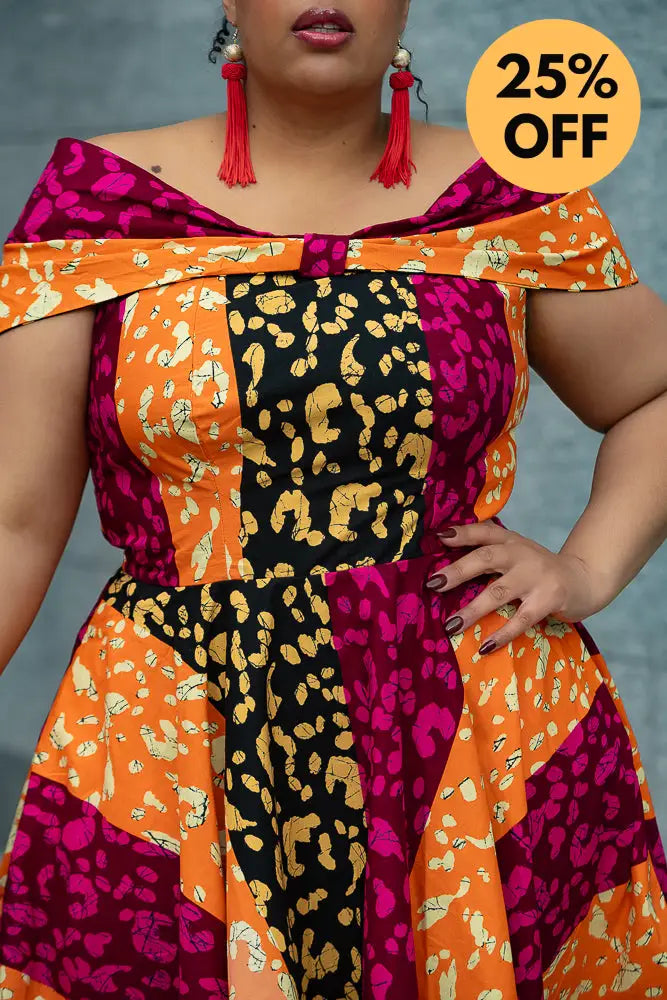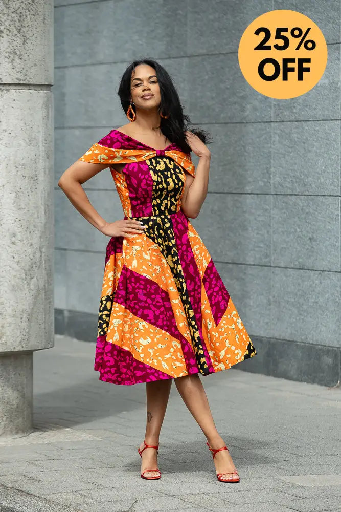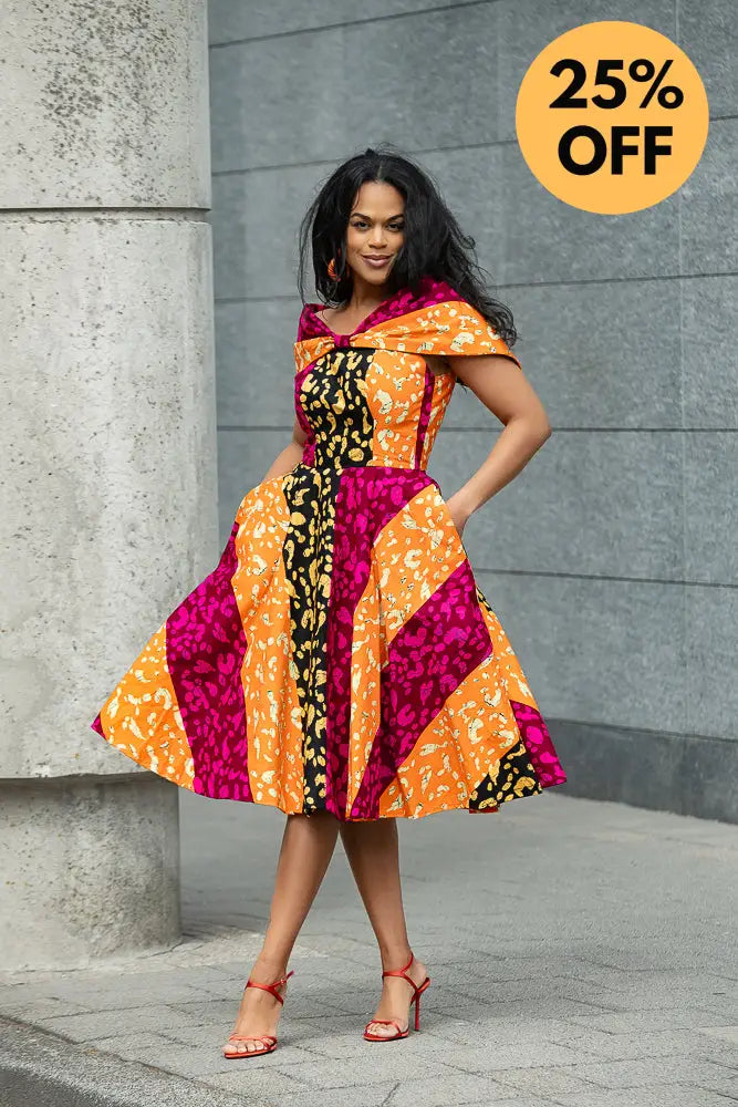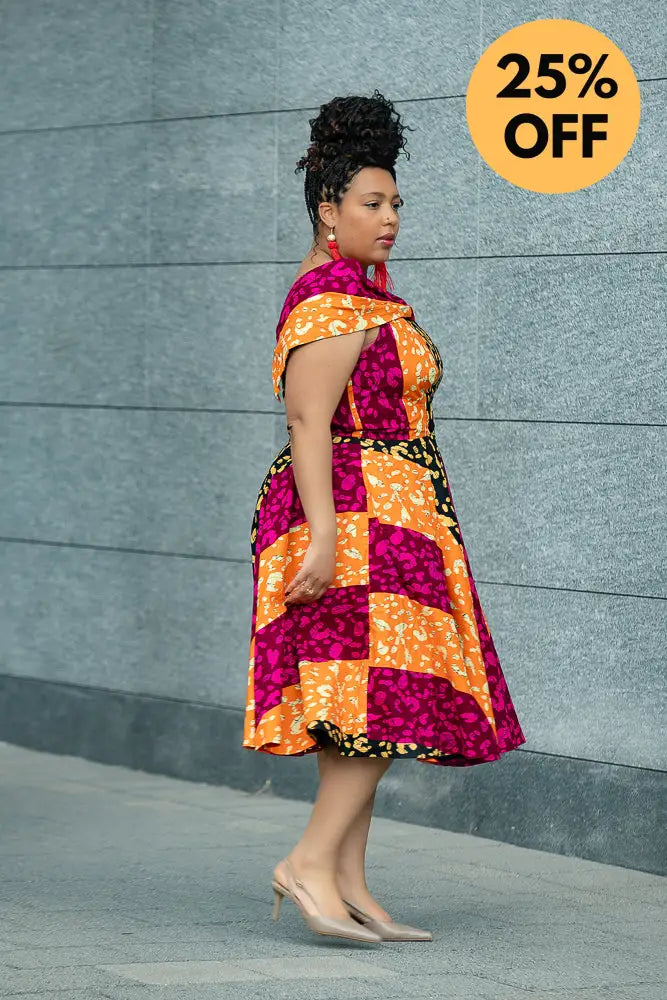 The Lara Dress is a celebration of contrast fierce colour blocking meets playful prints in shades of hot pink, orange, and black. The cape structure sleeves gives an elegance spell, while the flared skirt adds all the movement you didn’t know you needed.