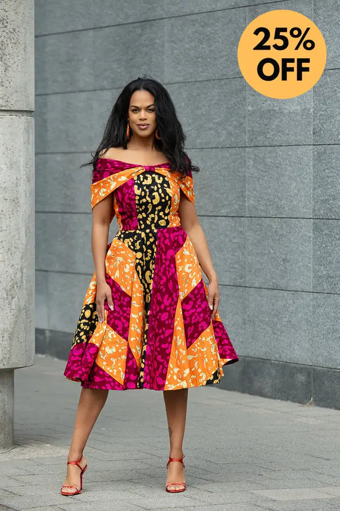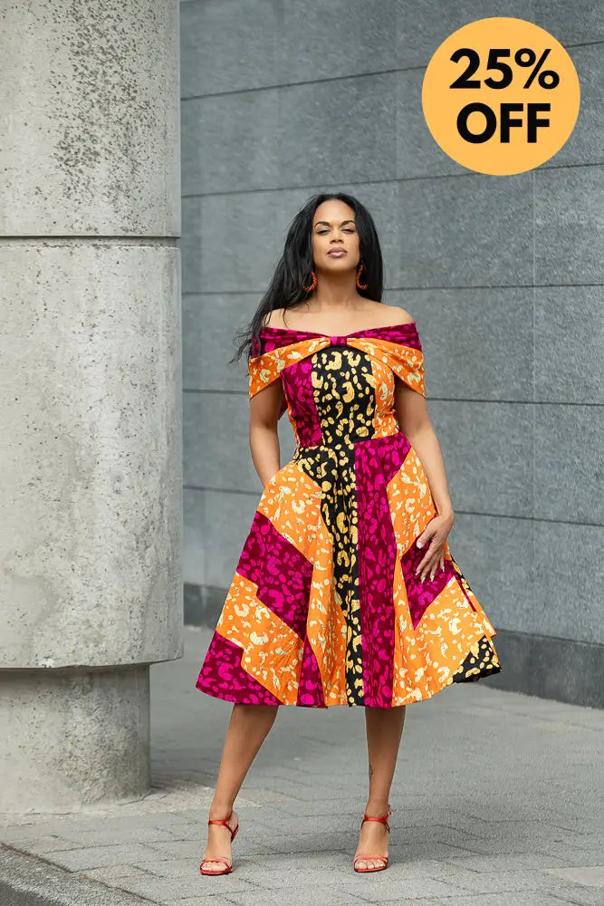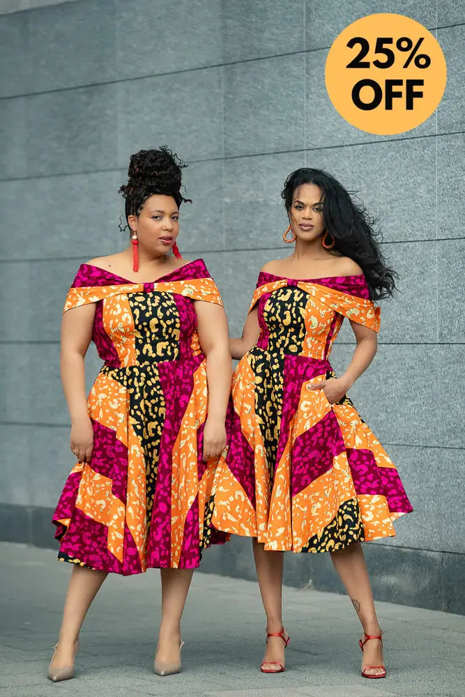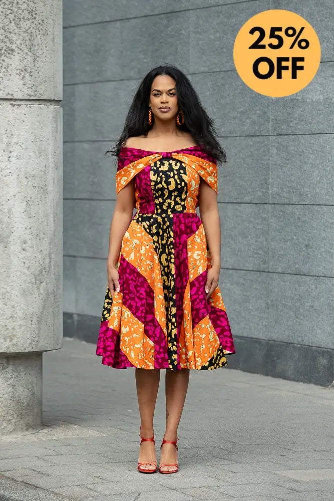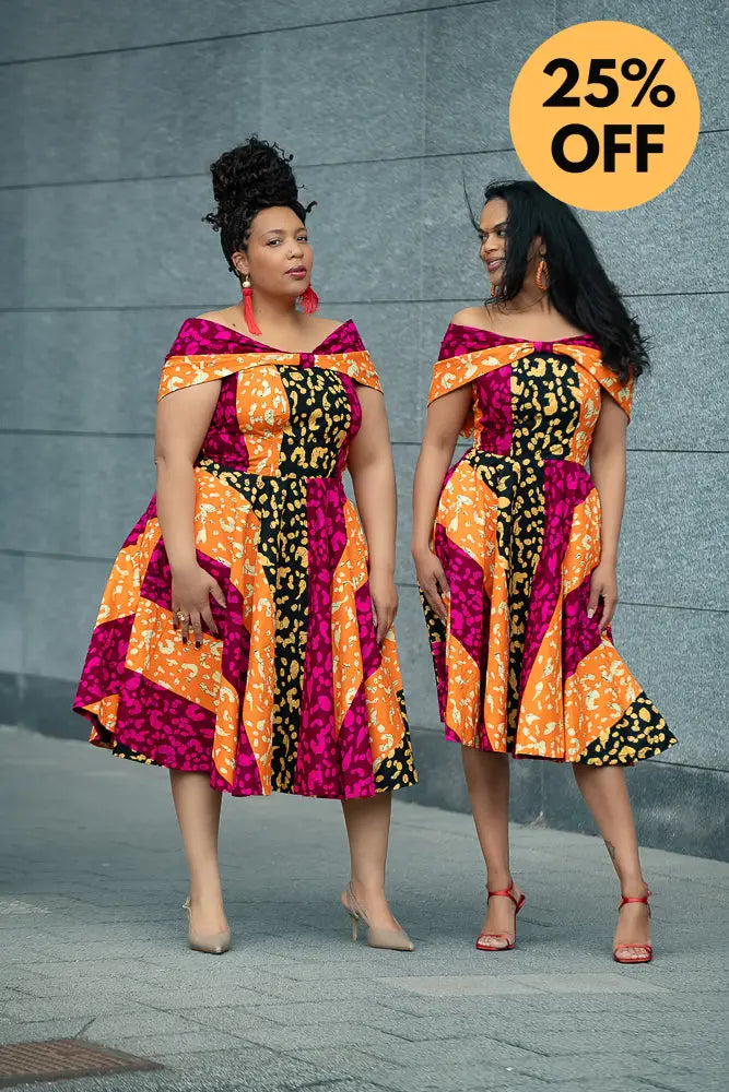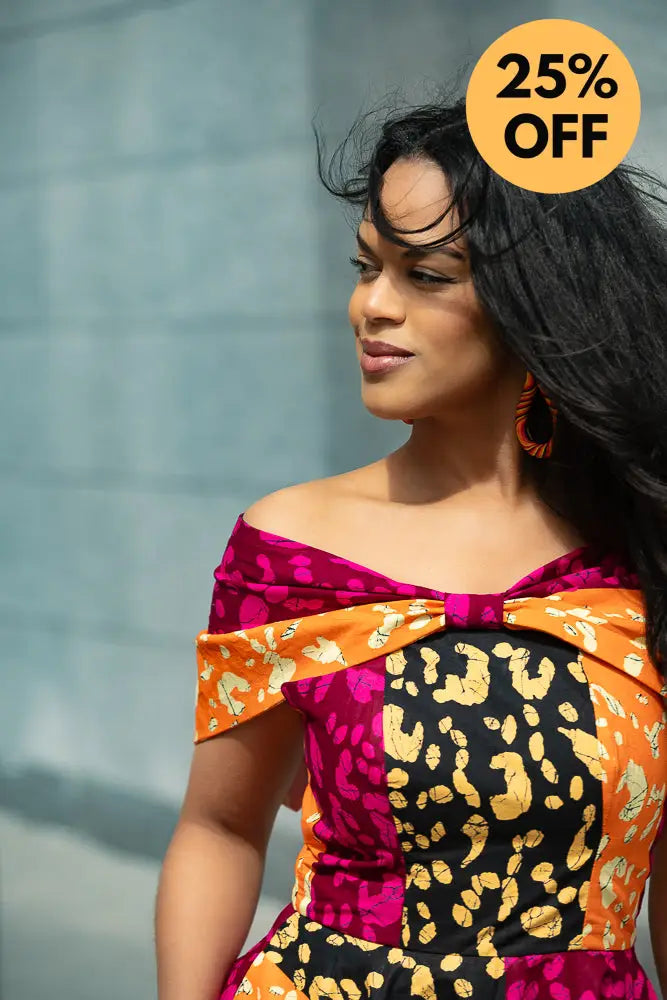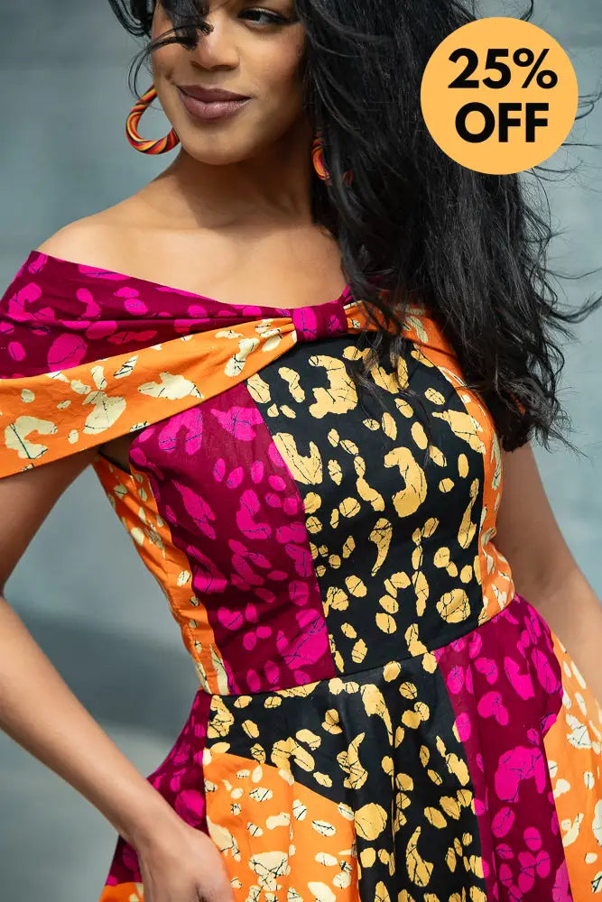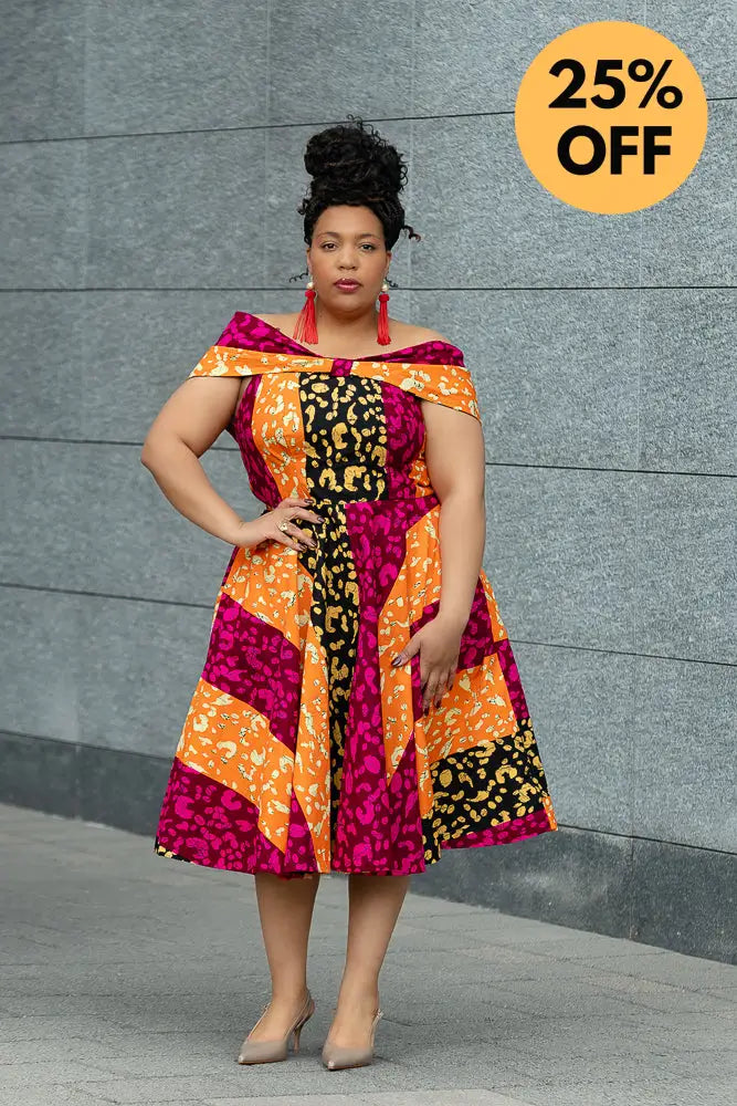 The Lara Dress is a celebration of contrast fierce colour blocking meets playful prints in shades of hot pink, orange, and black. The cape structure sleeves gives an elegance spell, while the flared skirt adds all the movement you didn’t know you needed.