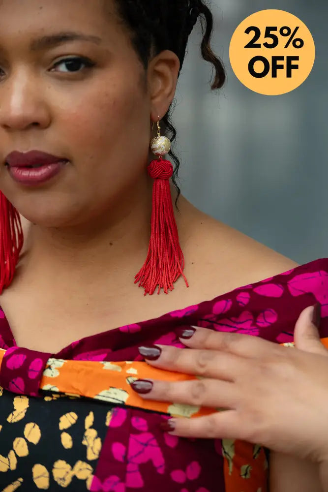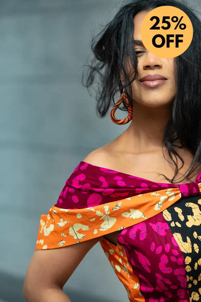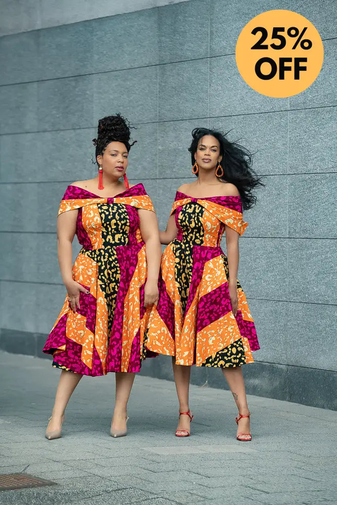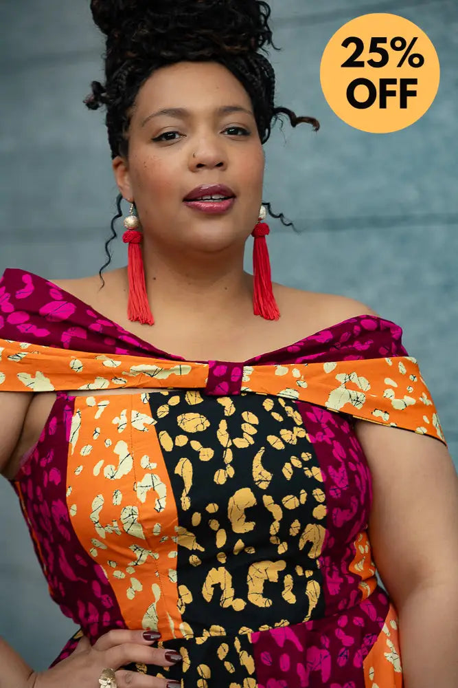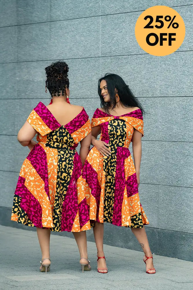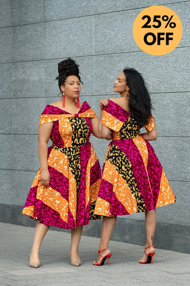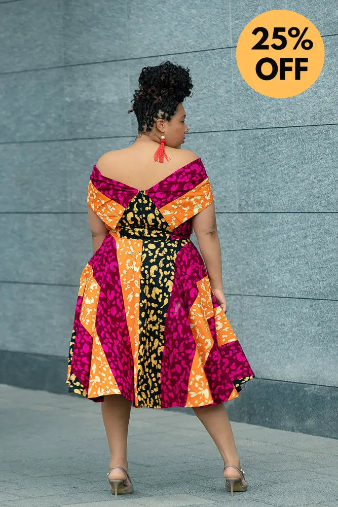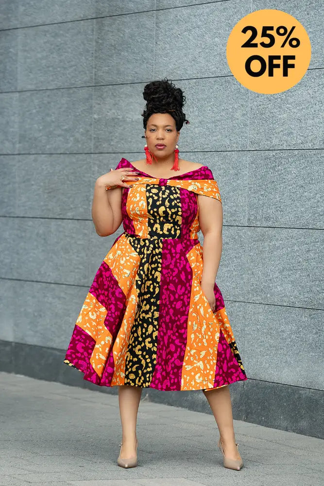 The Lara Dress is a celebration of contrast fierce colour blocking meets playful prints in shades of hot pink, orange, and black. The cape structure sleeves gives an elegance spell, while the flared skirt adds all the movement you didn’t know you needed.