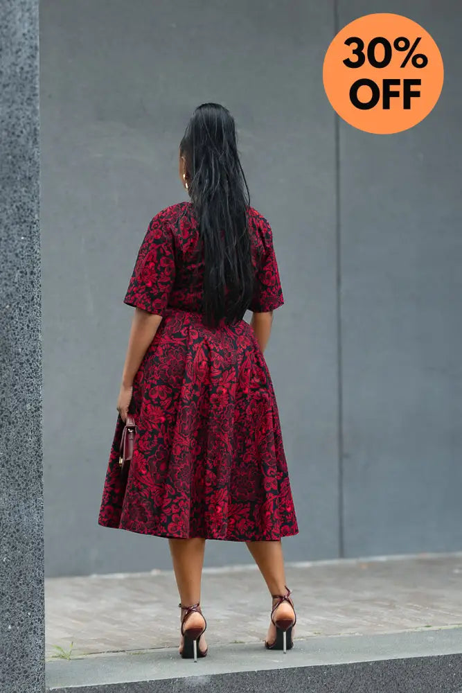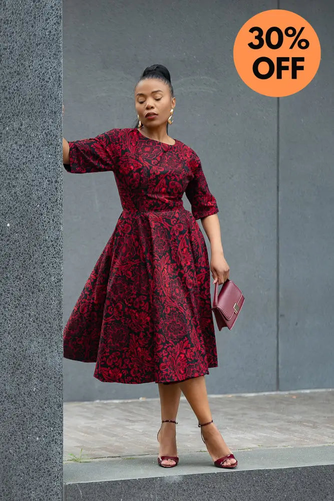 The print is a deep nourishing red with stunning floral blood red pattern made with velvety fabric that's striking- you aren't trying to hide wearing this gorgeous dress (even when you're trying to keep low-key). It's comfortable and flattering for all body shapes. You'll definitely enjoy the deep side pockets to keep your phone and car keys. Dress up with peep-toe heels.